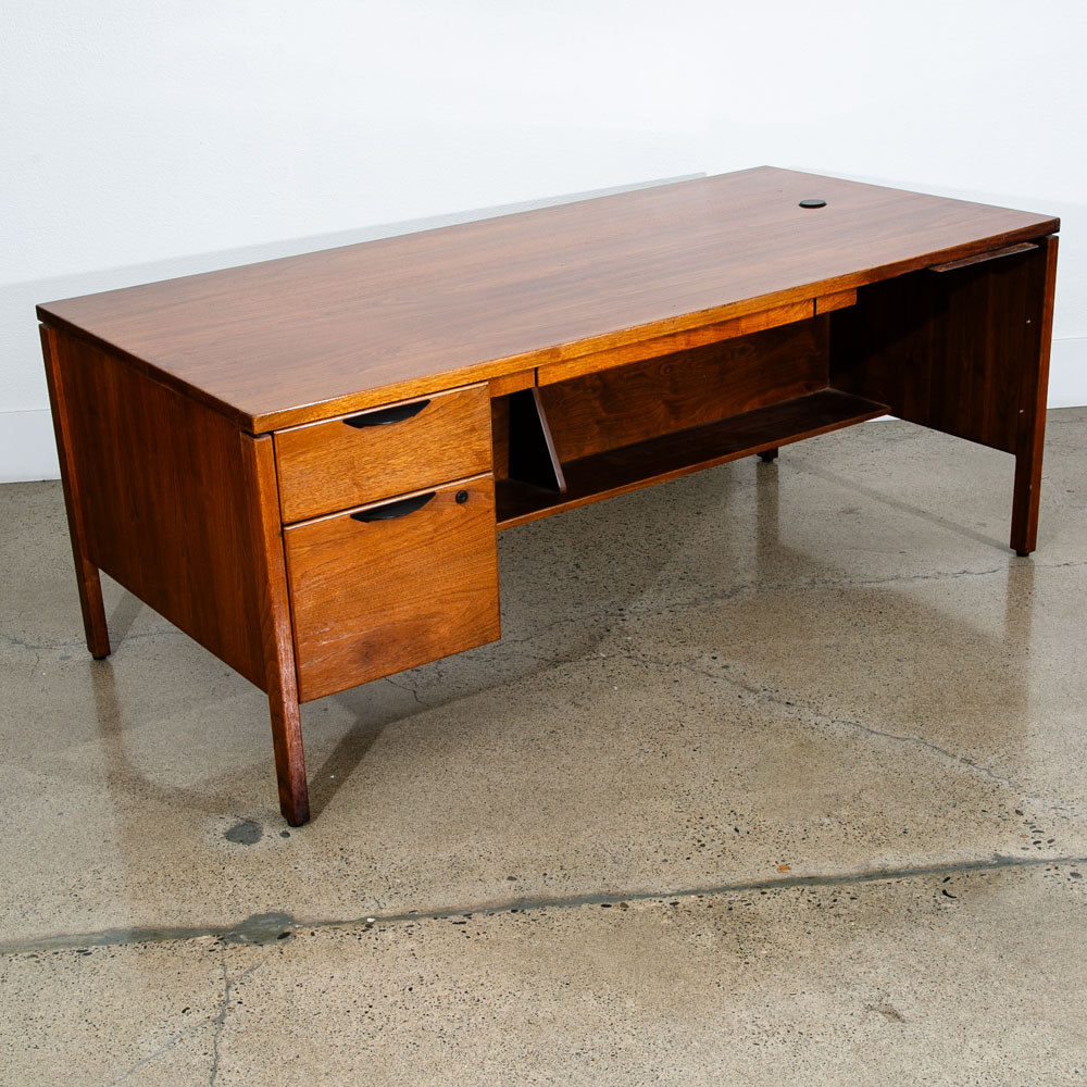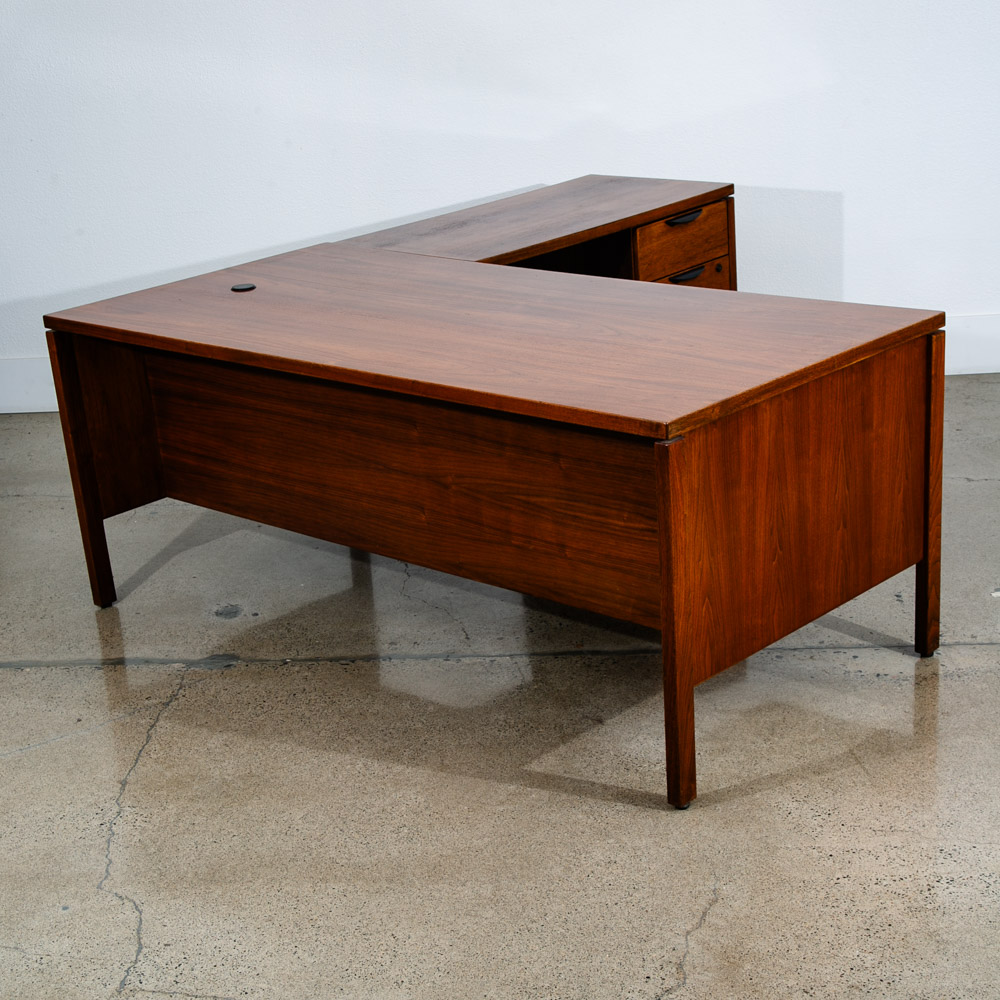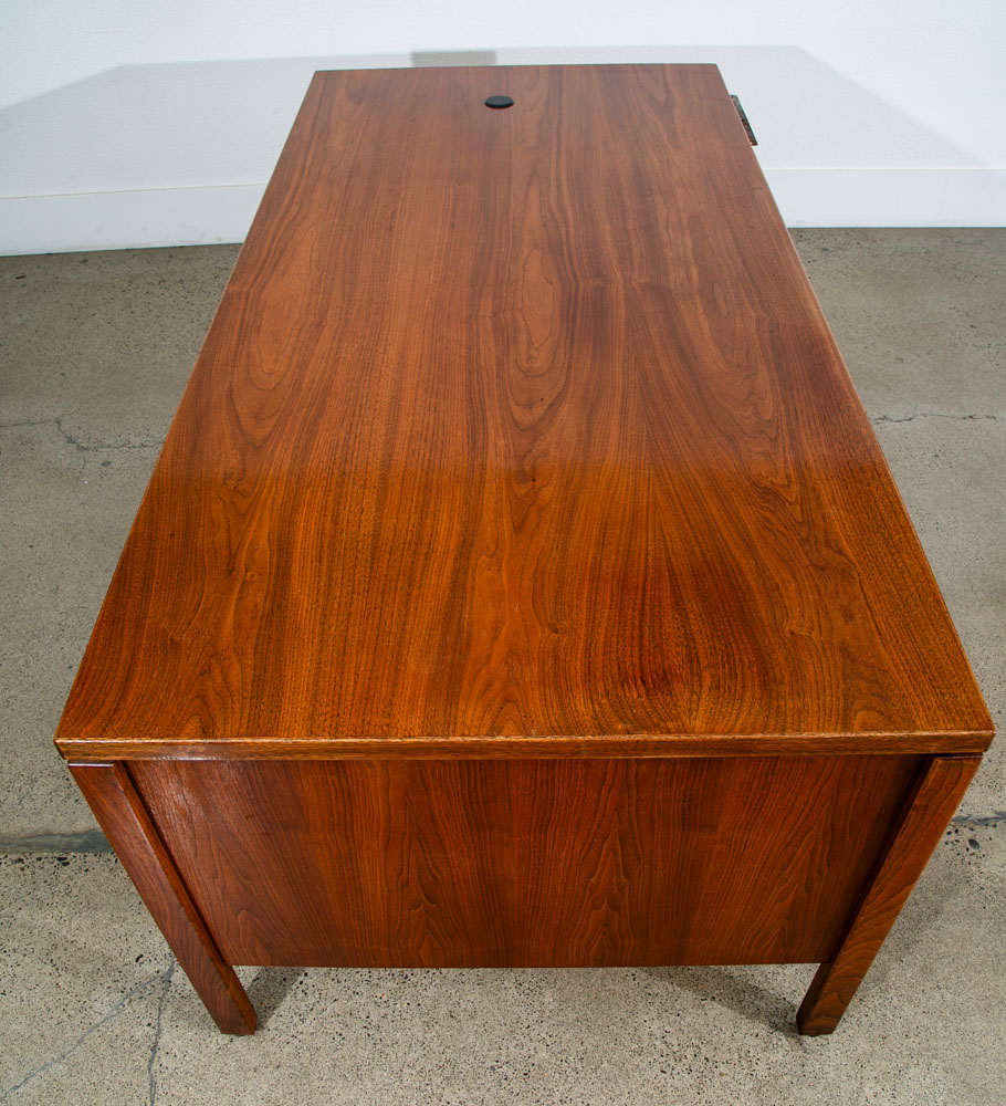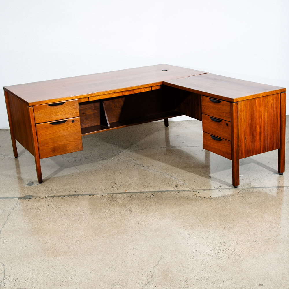 Large Mid-Century Modern executive desk in walnut and cognac leather by Jens Risom, circa 1960s. Desk includes an optional (removable) return with under shelf that mounts to right of the sitter. Within the return is a swing-out box compartment for additional storage. A truly iconic american designed piece in near mint condition. Please see all photos to ensure you know what you are buying. We include FREE SHIPPING in the listing price. Some exceptions apply, so please read the full shipping details below.