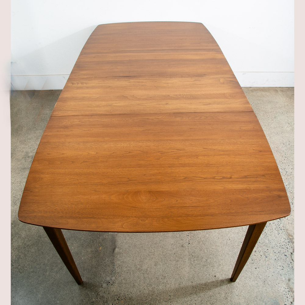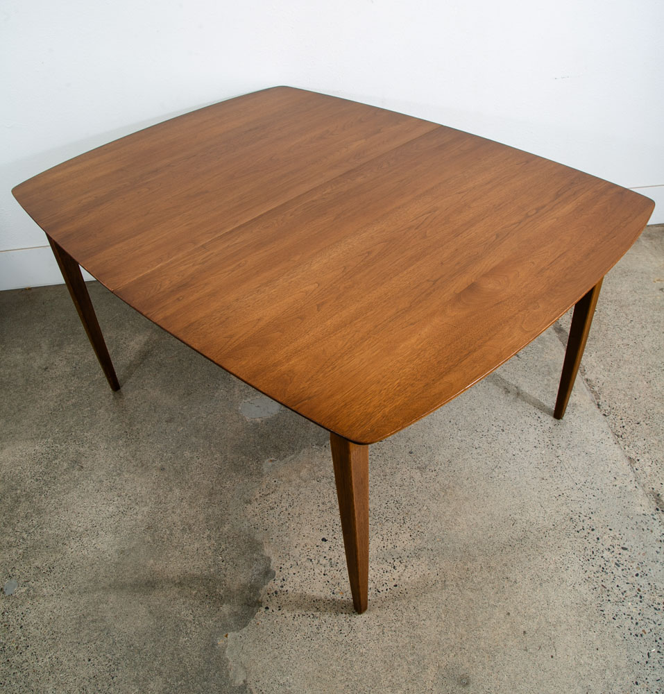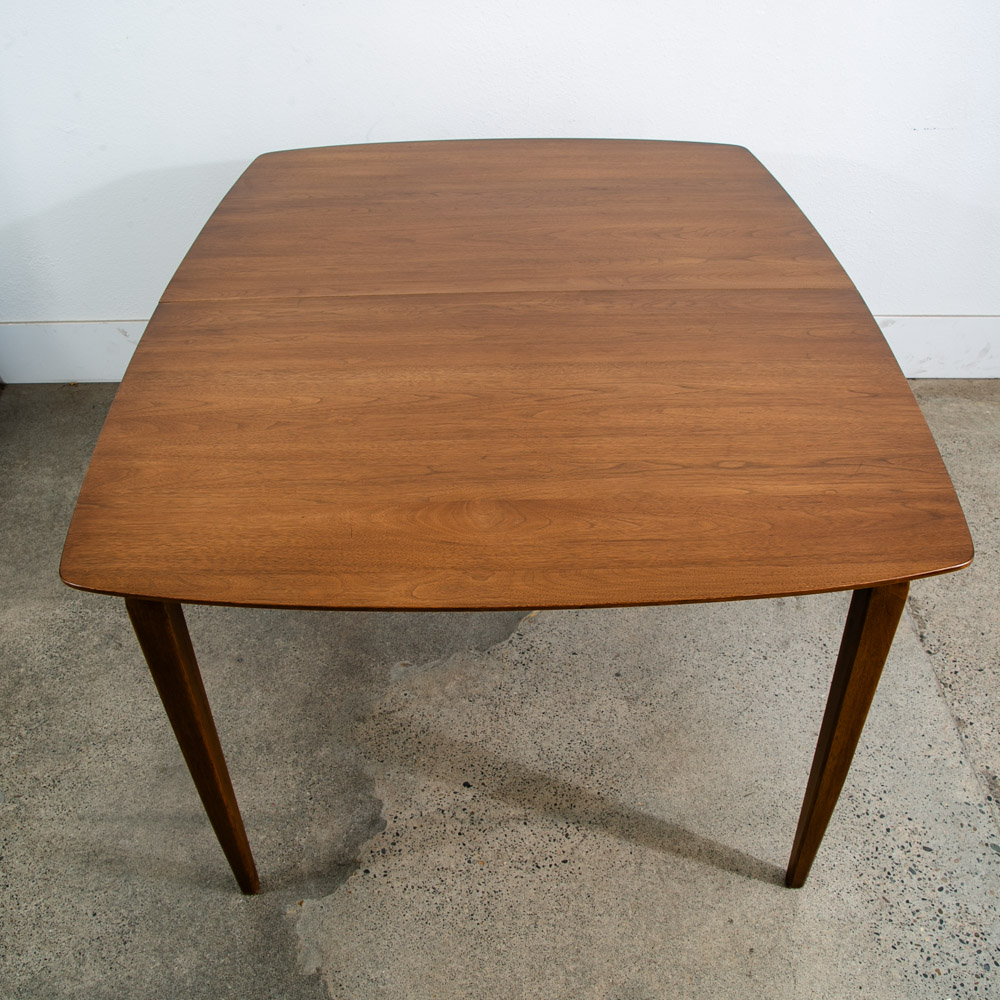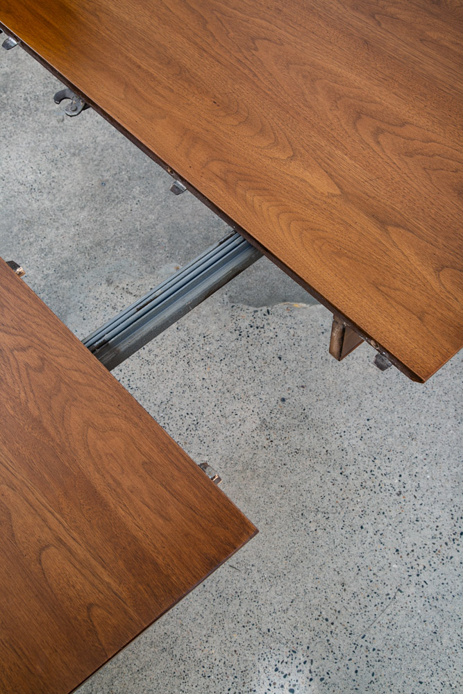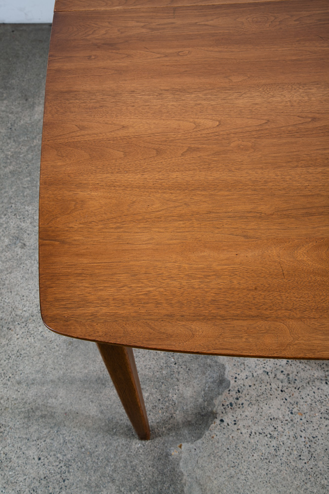 Solid walnut dining table w/ 2 extension leafs by Davis Cabinet co. The top surface shows no wear and neither do the 2 leafs. The table easily opens and closes and the solid walnut legs are very sturdy. Great American mid century modern table. Please see all photos to ensure you know what you are buying. We include FREE SHIPPING in the listing price. Some exceptions apply, so please read the full shipping details below.