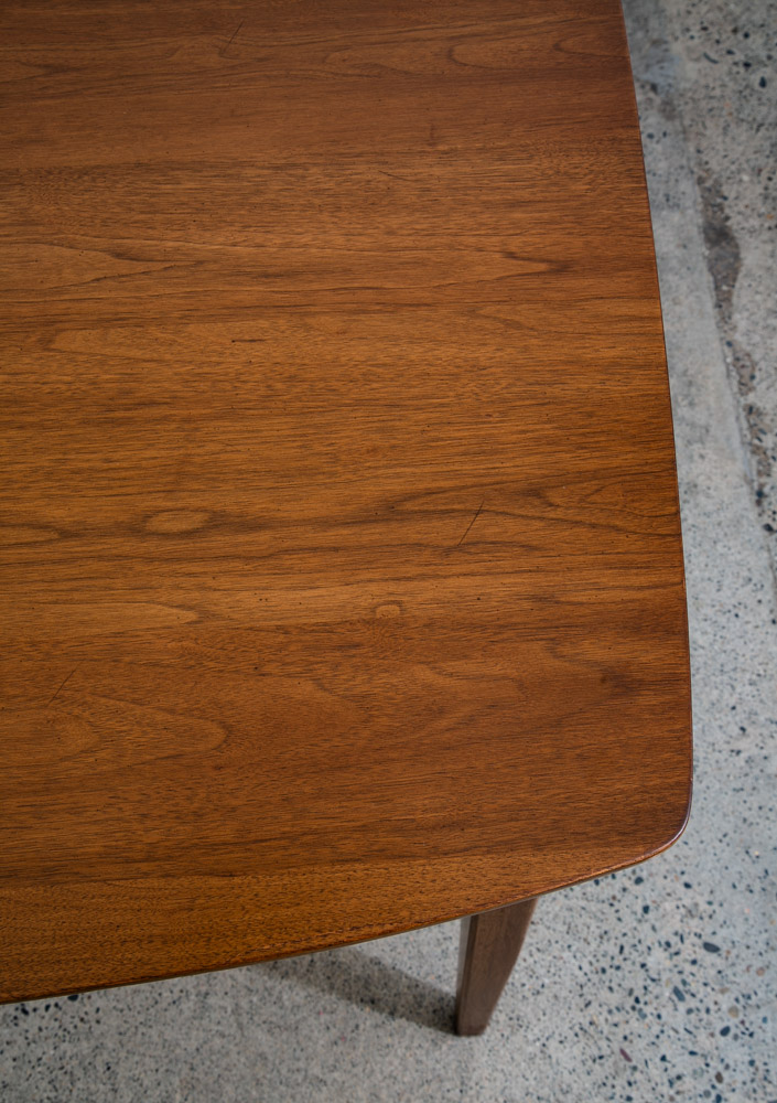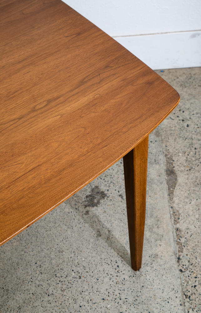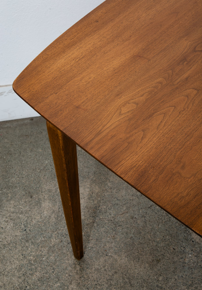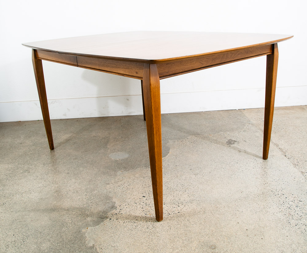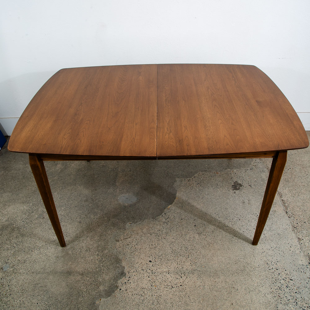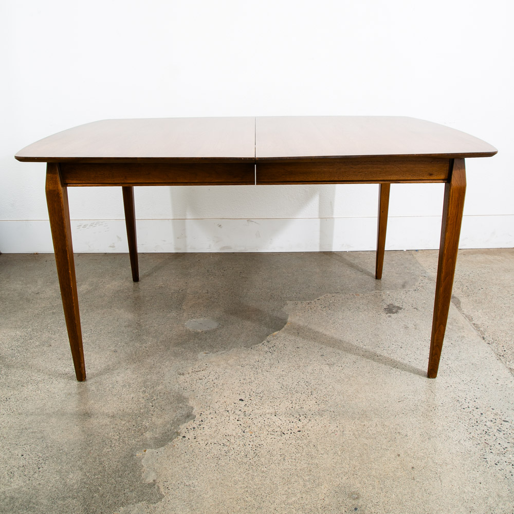 Solid walnut dining table w/ 2 extension leafs by Davis Cabinet co. The top surface shows no wear and neither do the 2 leafs. The table easily opens and closes and the solid walnut legs are very sturdy. Great American mid century modern table. Please see all photos to ensure you know what you are buying. We include FREE SHIPPING in the listing price. Some exceptions apply, so please read the full shipping details below.