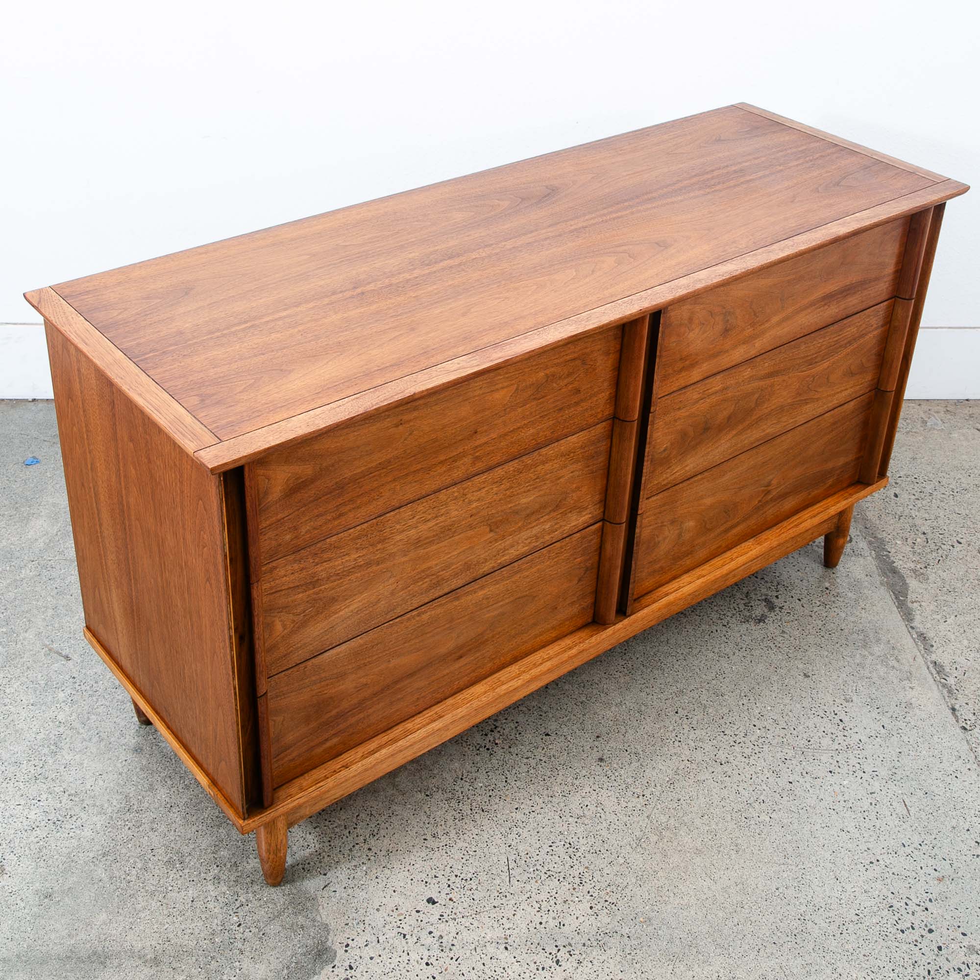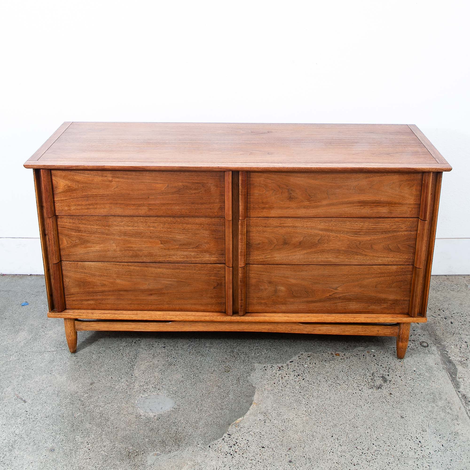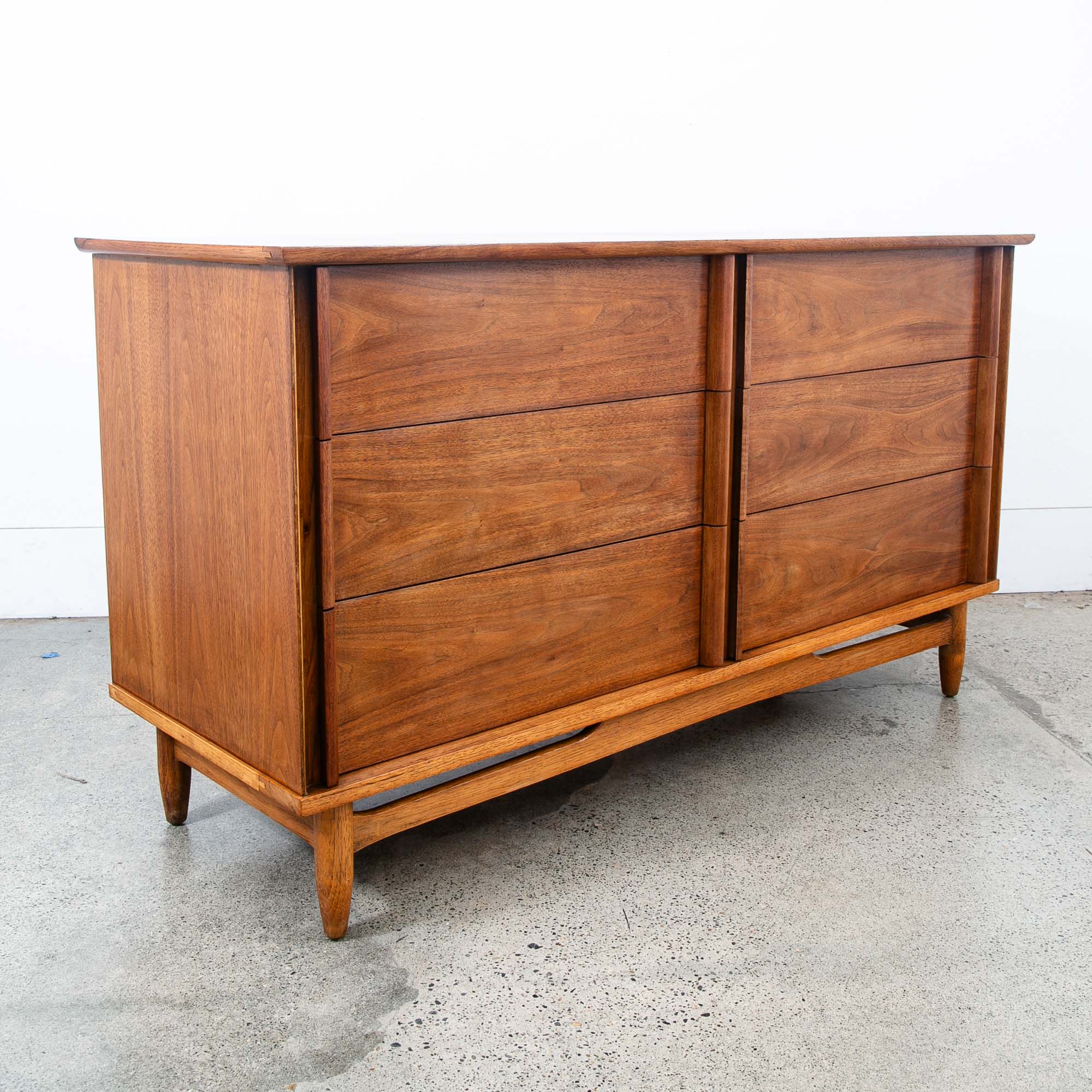 Vintage walnut dresser with 6 drawers and sculpted wood handles. Unique and well made American designed piece. Unmarked example. Please see all photos to ensure you know what you are buying. We include FREE SHIPPING in the listing price. Some exceptions apply, so please read the full shipping details below.