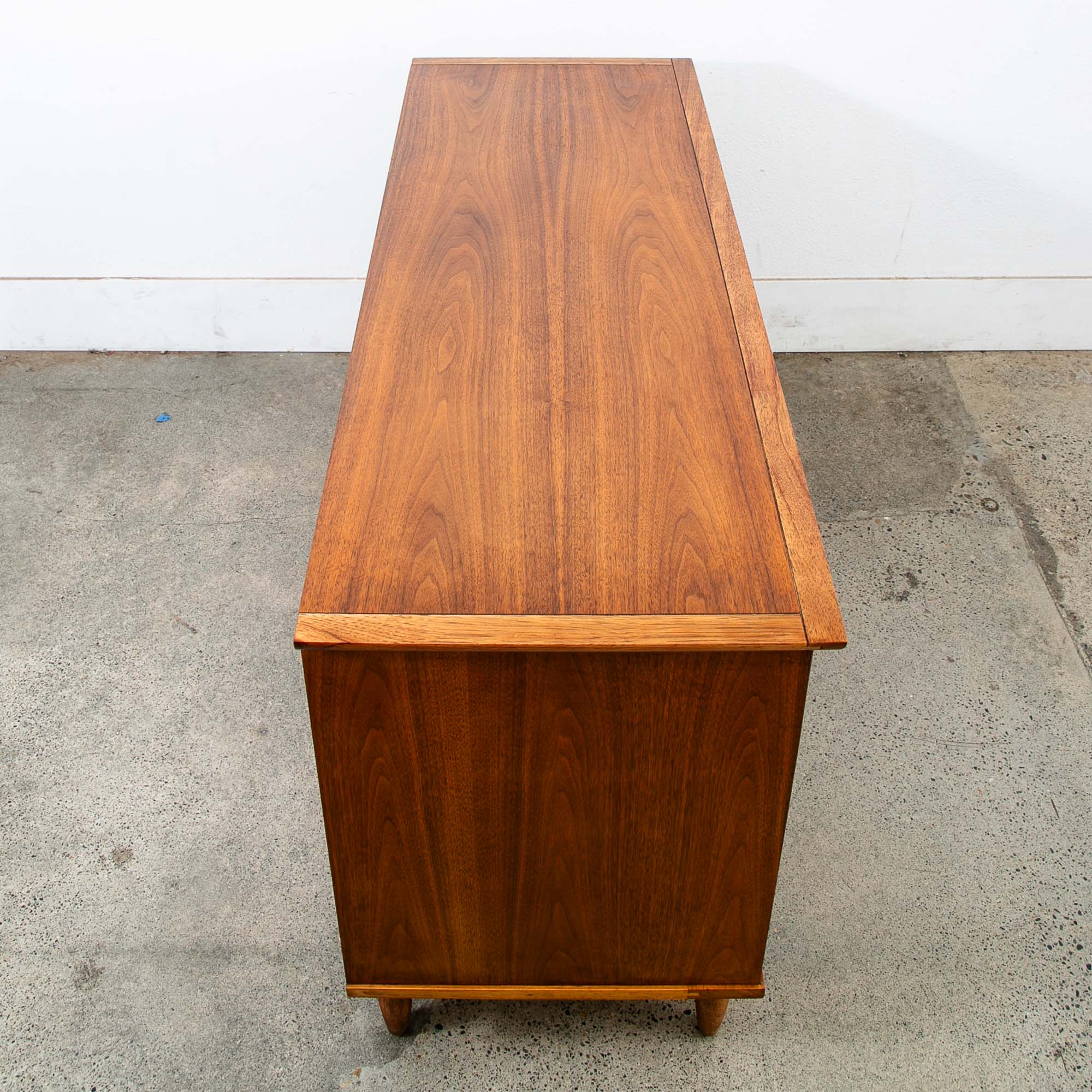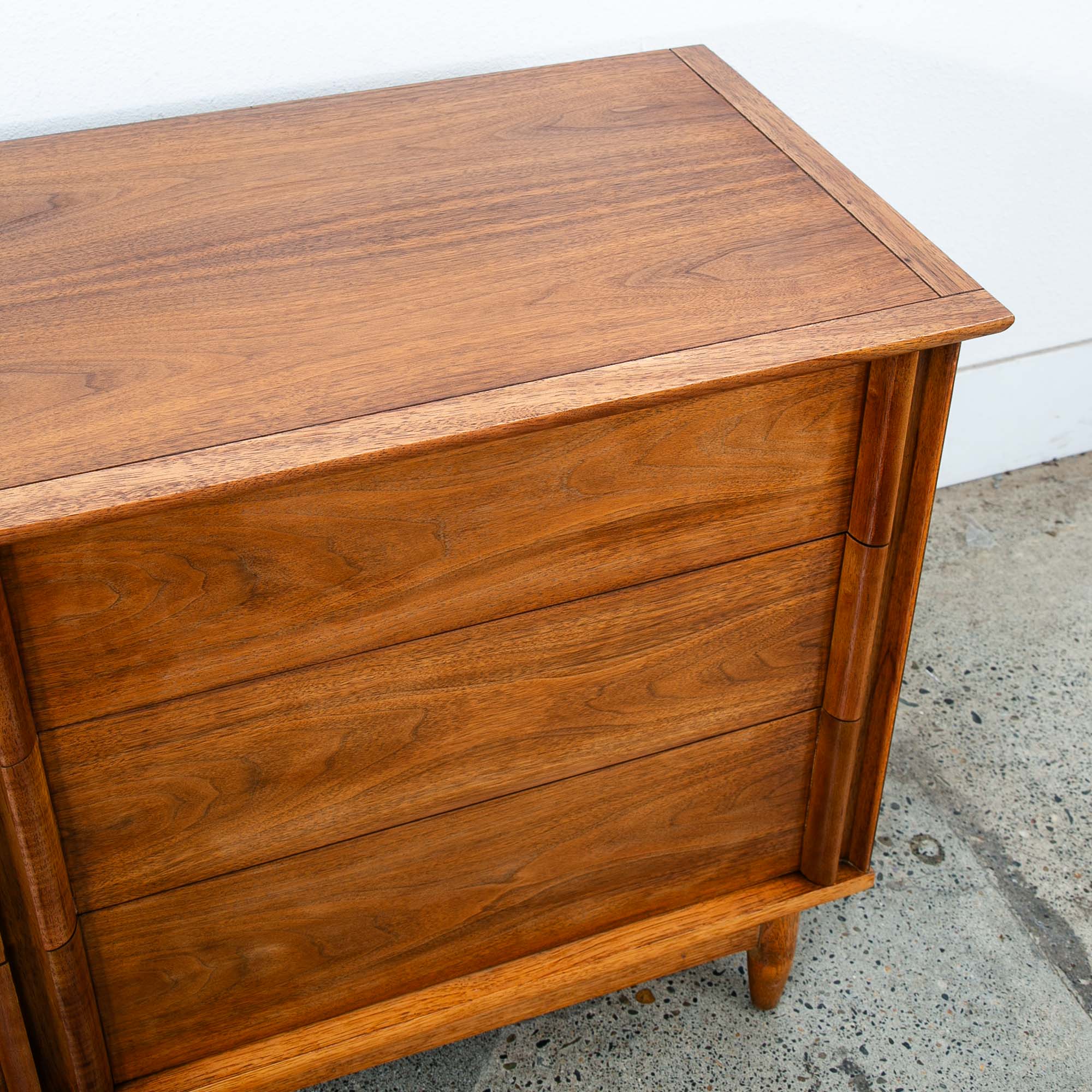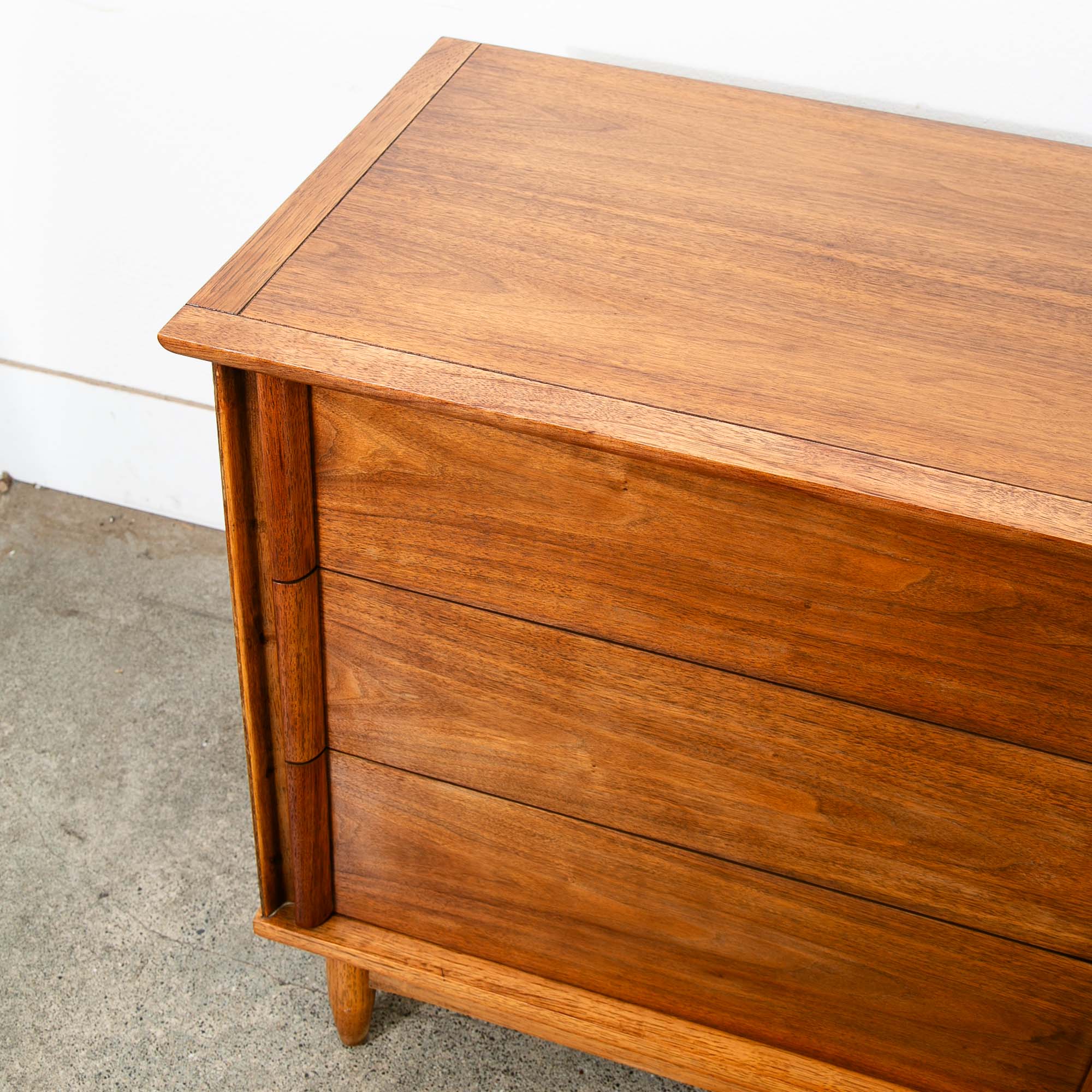 Vintage walnut dresser with 6 drawers and sculpted wood handles. Unique and well made American designed piece. Unmarked example. Please see all photos to ensure you know what you are buying. We include FREE SHIPPING in the listing price. Some exceptions apply, so please read the full shipping details below.