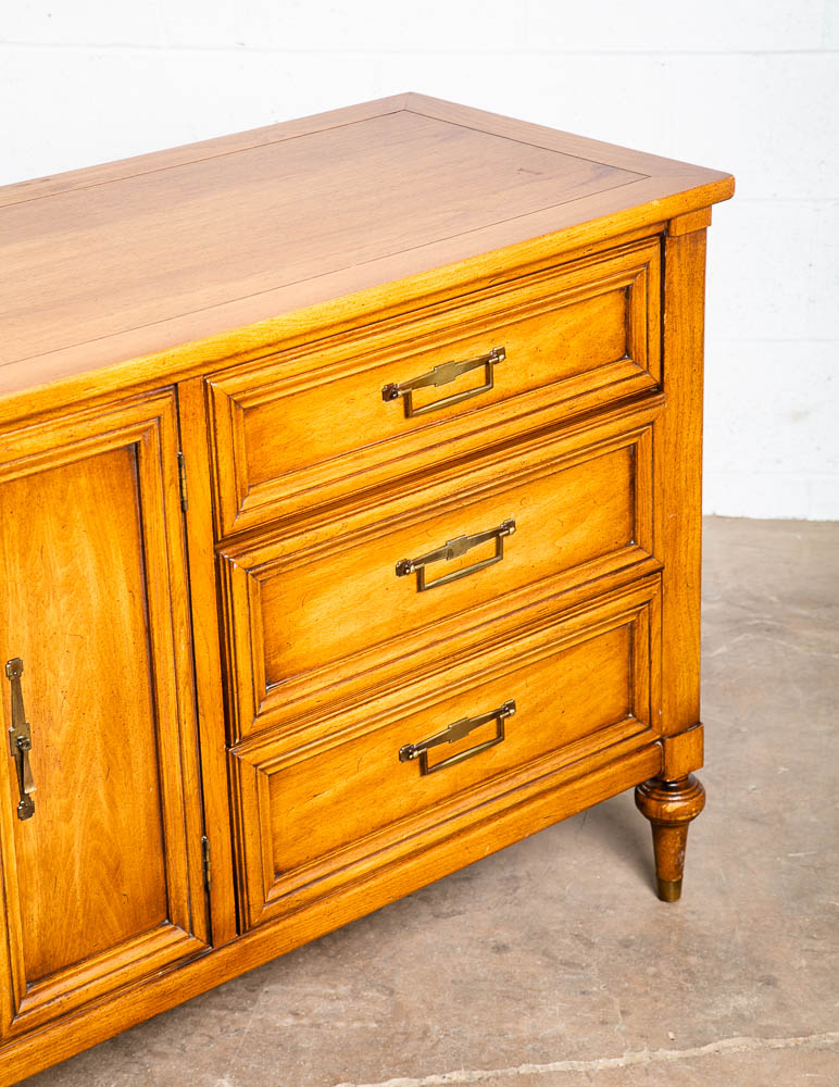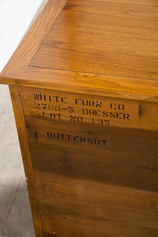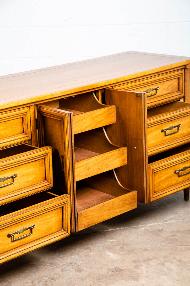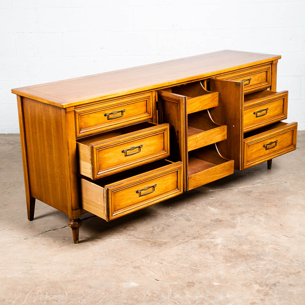 Walnut low 9 drawer credenza/dresser by American maker White furniture. Classic bleached walnut construction and look. The storage cabinet area sits on four tapered wood legs, with each drawer each having a single brass handle.. A fine example of a desirable American design. Minimal wear to be seen. Please see all photos to ensure you know what you are buying. We include FREE SHIPPING in the listing price. Some exceptions apply, so please read the full shipping details below.