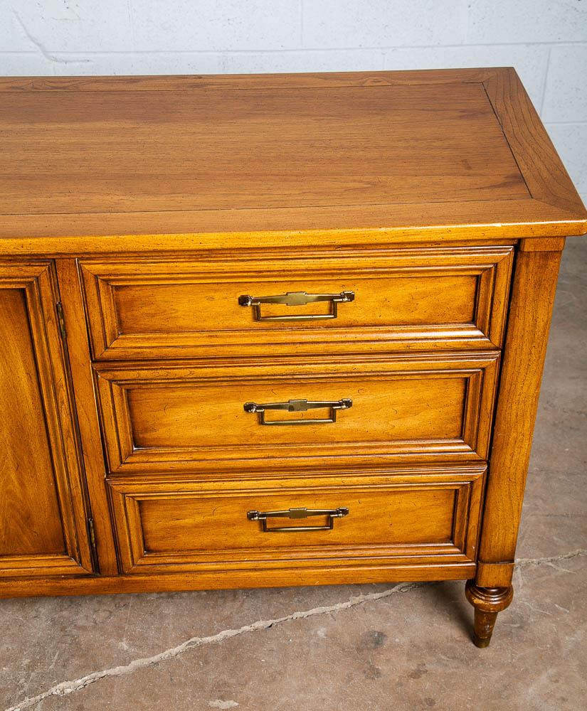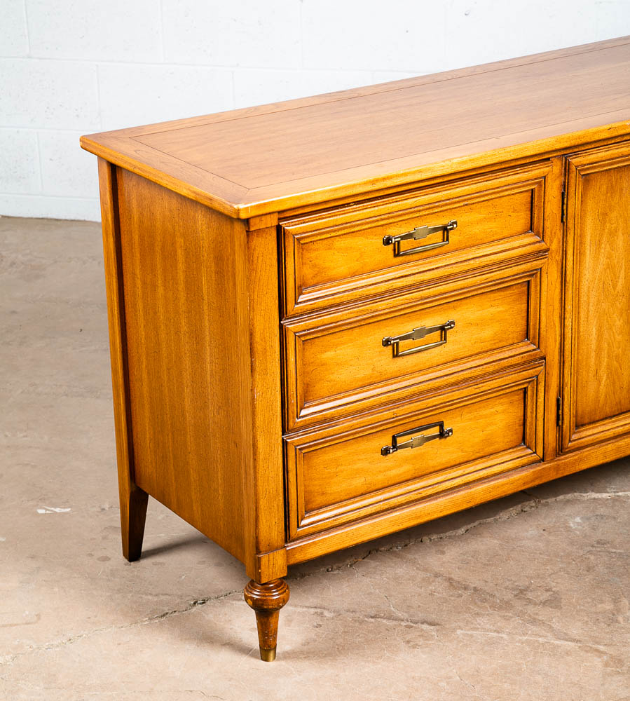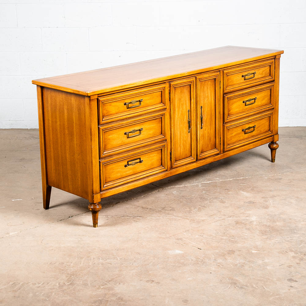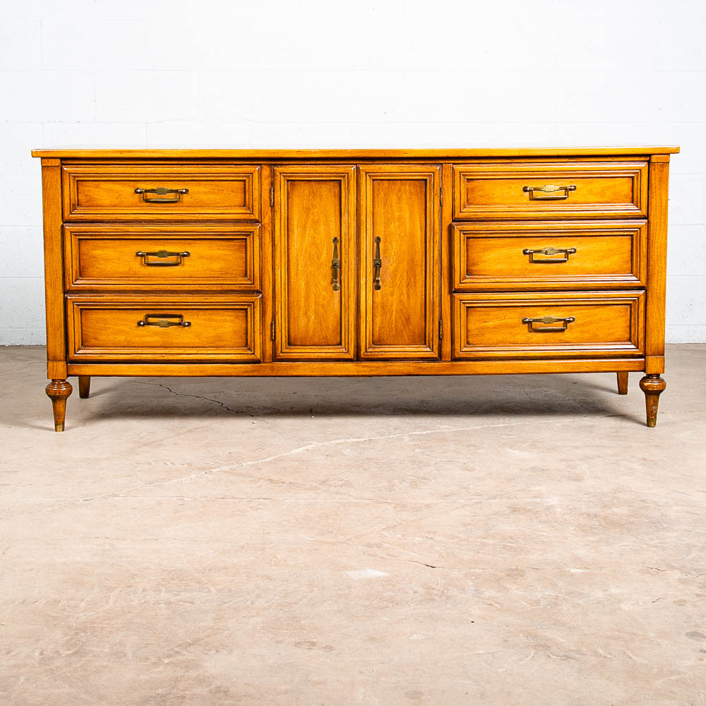 Walnut low 9 drawer credenza/dresser by American maker White furniture. Classic bleached walnut construction and look. The storage cabinet area sits on four tapered wood legs, with each drawer each having a single brass handle.. A fine example of a desirable American design. Minimal wear to be seen. Please see all photos to ensure you know what you are buying. We include FREE SHIPPING in the listing price. Some exceptions apply, so please read the full shipping details below.