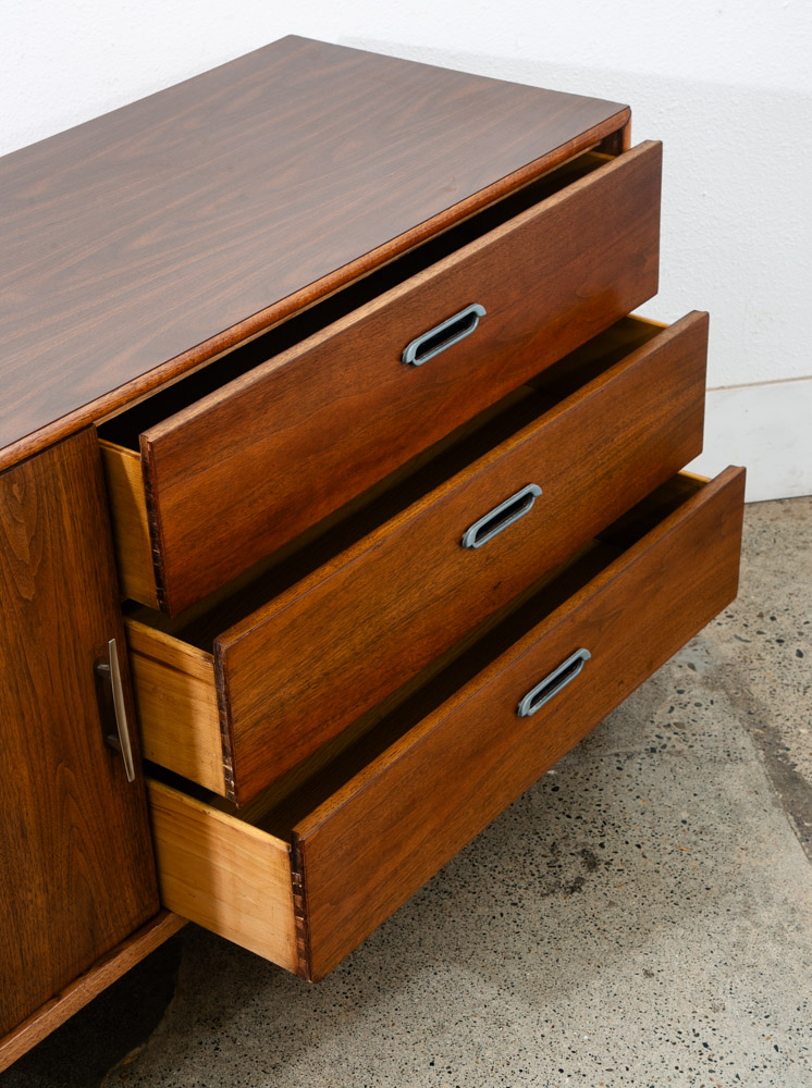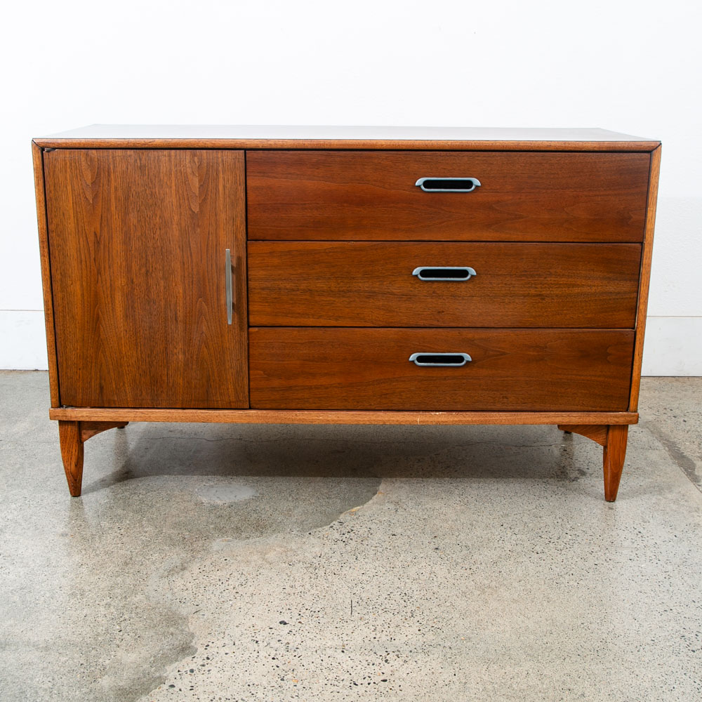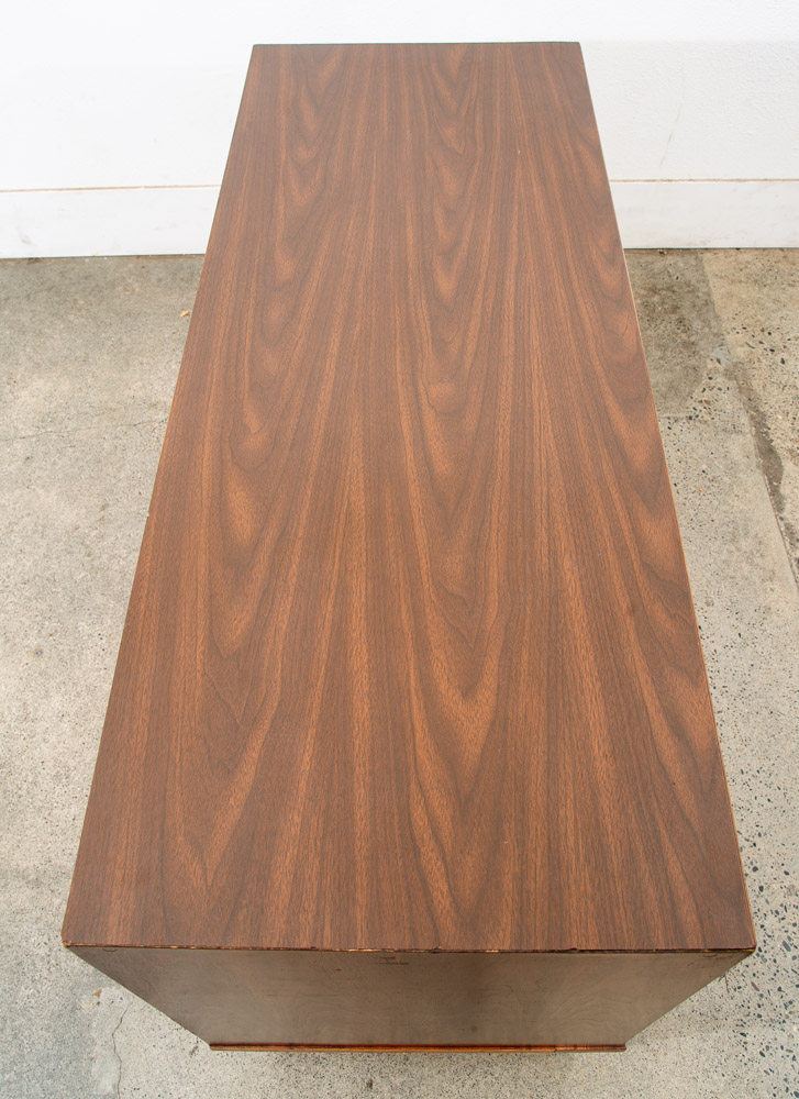 Fully refinished BP John 3 drawer dresser / credenza in walnut. Very nice construction, great details. Comes with 3 drawers with silver metal handles and one cabinet storage section. Unique and well made American designed piece. Laminated top surface for easy cleaning and maintenance. Please see all photos to ensure you know what you are buying. We include FREE SHIPPING in the listing price. Some exceptions apply, so please read the full shipping details below.