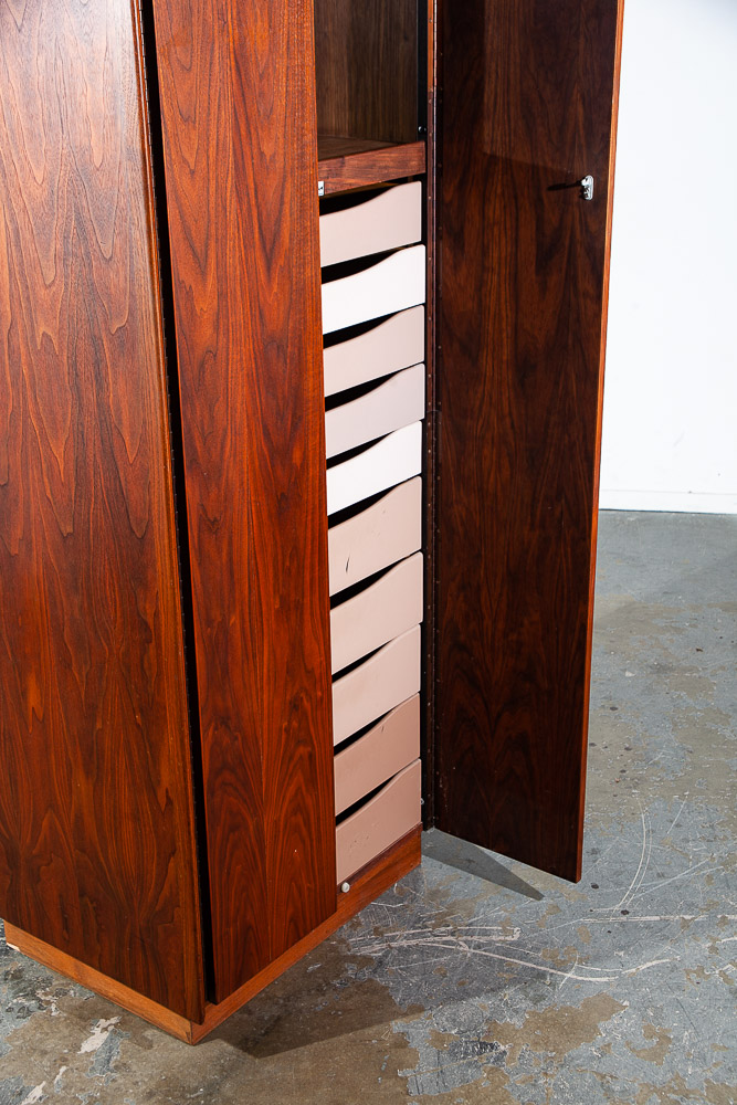 Unique and rarely seen Dillingham Esprit gentleman's chest / tall dresser / Chest of drawers. The piece offers 2 push open doors and a10 drawers within. The outer side of the piece is made up of solid walnut and figural veneer. A mirror and tie organizer are available above the drawers. Great piece for any space with limited room for storage. Please see all photos to ensure you know what you are buying.