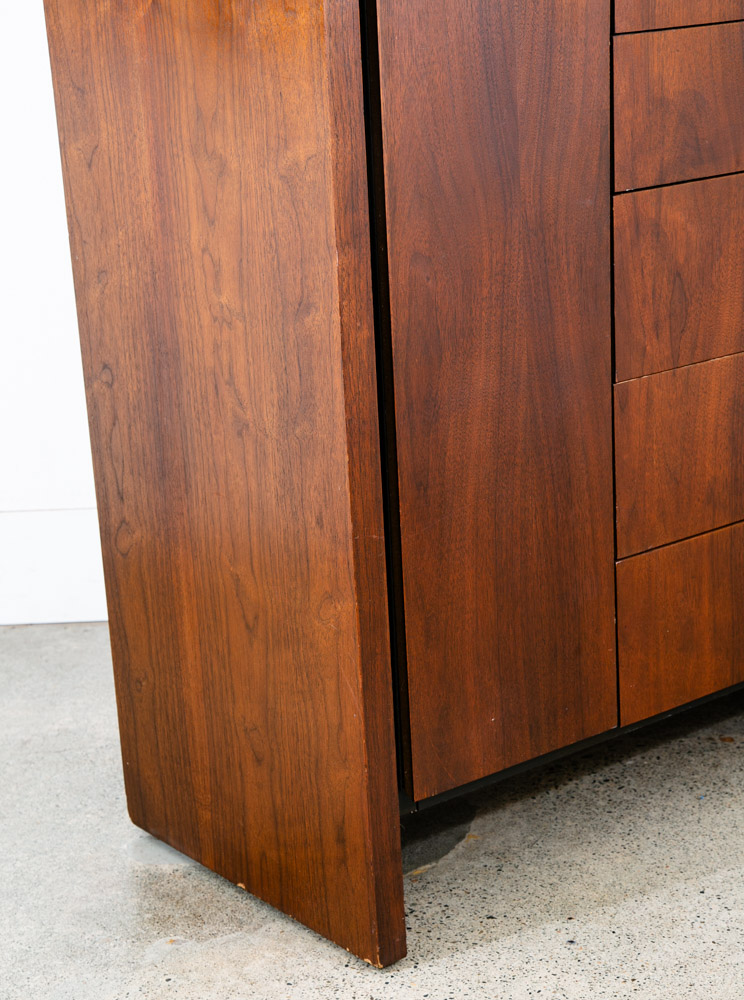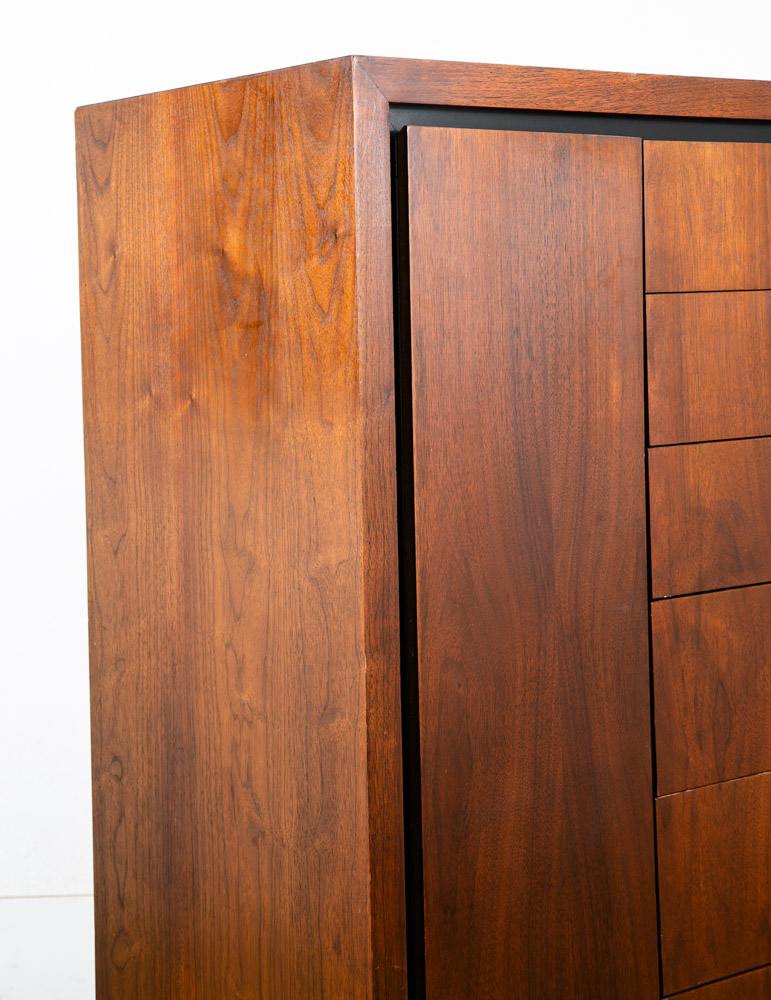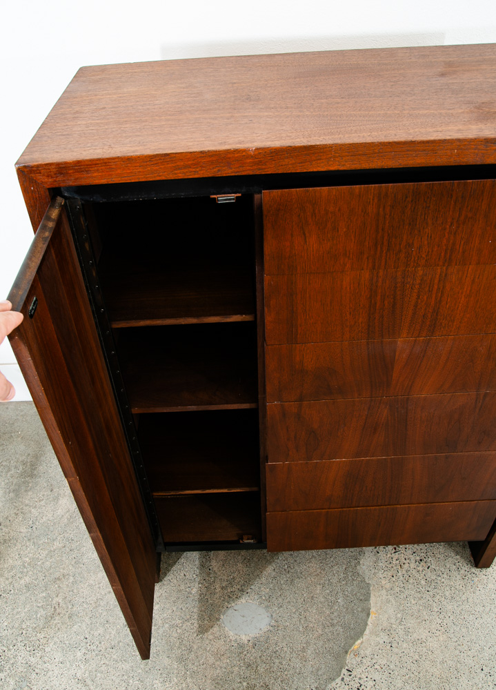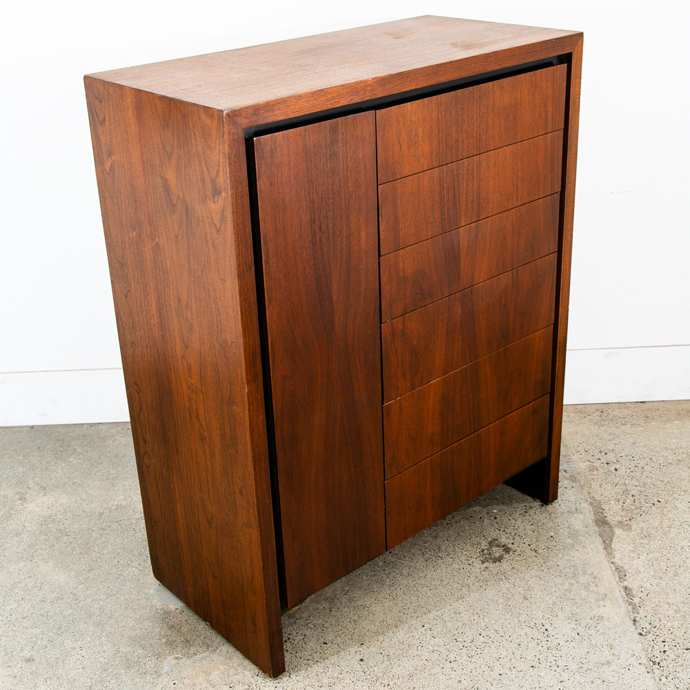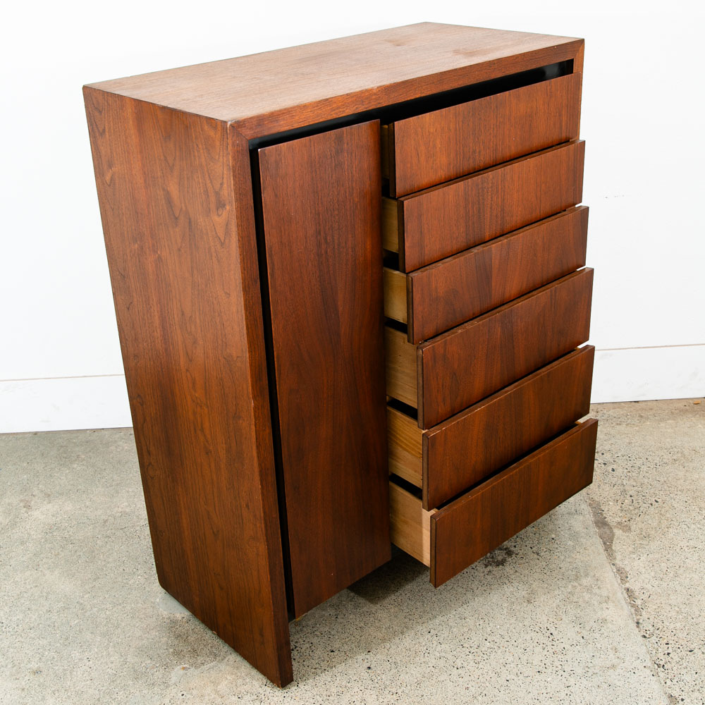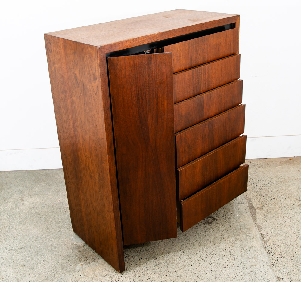 Unique and rarely seen Dillingham Esprit gentleman's chest / tall dresser / Chest of drawers. The piece offers 1 side cabinet door displaying shelves and 6 drawers within on the right side. The outer side of the piece is made up of solid walnut and figural veneer. Great piece for any space with limited room for storage. Please see all photos to ensure you know what you are buying. We include FREE SHIPPING in the listing price. Some exceptions apply, so please read the full shipping details below.