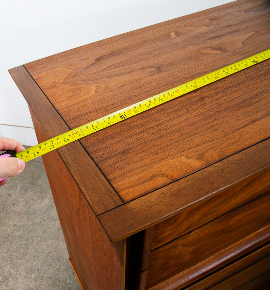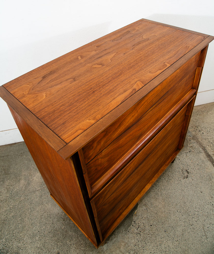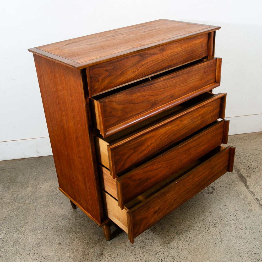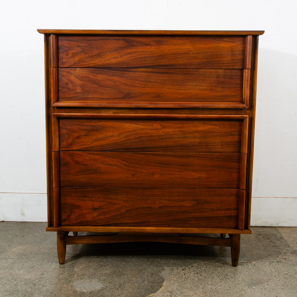 Vintage walnut highboy dresser with 5 drawers and sculpted wood handles. Unique and well made American designed piece. Unmarked example. Please see all photos to ensure you know what you are buying. We include FREE SHIPPING in the listing price. Some exceptions apply, so please read the full shipping details below.