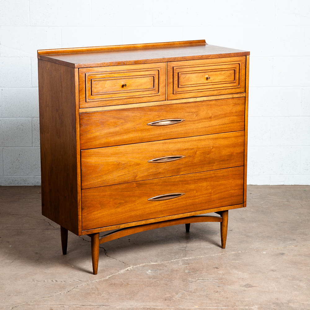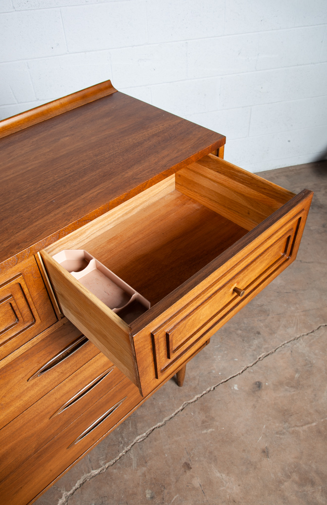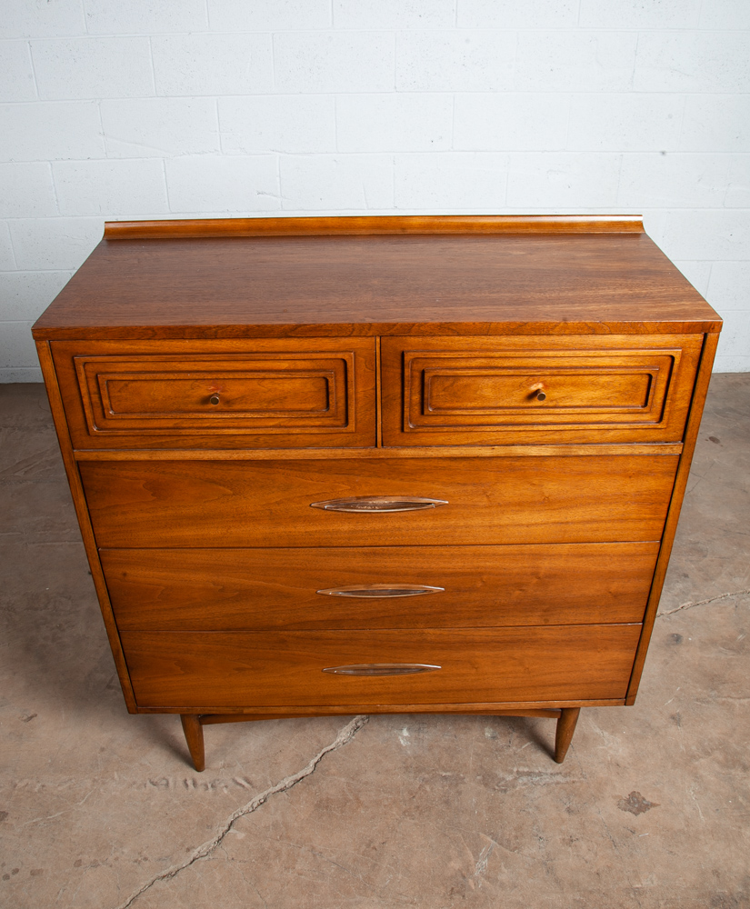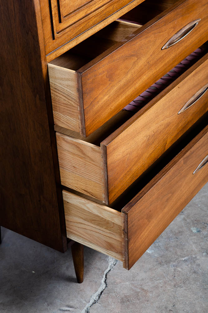 Broyhill Sculptra highboy dresser, circa 1960s. This is a true mid century piece with lots of style and plenty of storage. It features three full size, dovetailed drawers below two smaller single drawers up top. the 1st large drawer is separated into three sections, but the dividers are removable so it can transform into one long open space. Please see all photos to ensure you know what you are buying. We include FREE SHIPPING in the listing price. Some exceptions apply, so please read the full shipping details below.