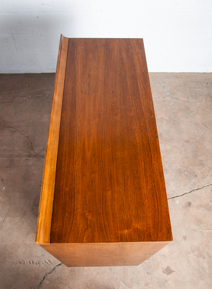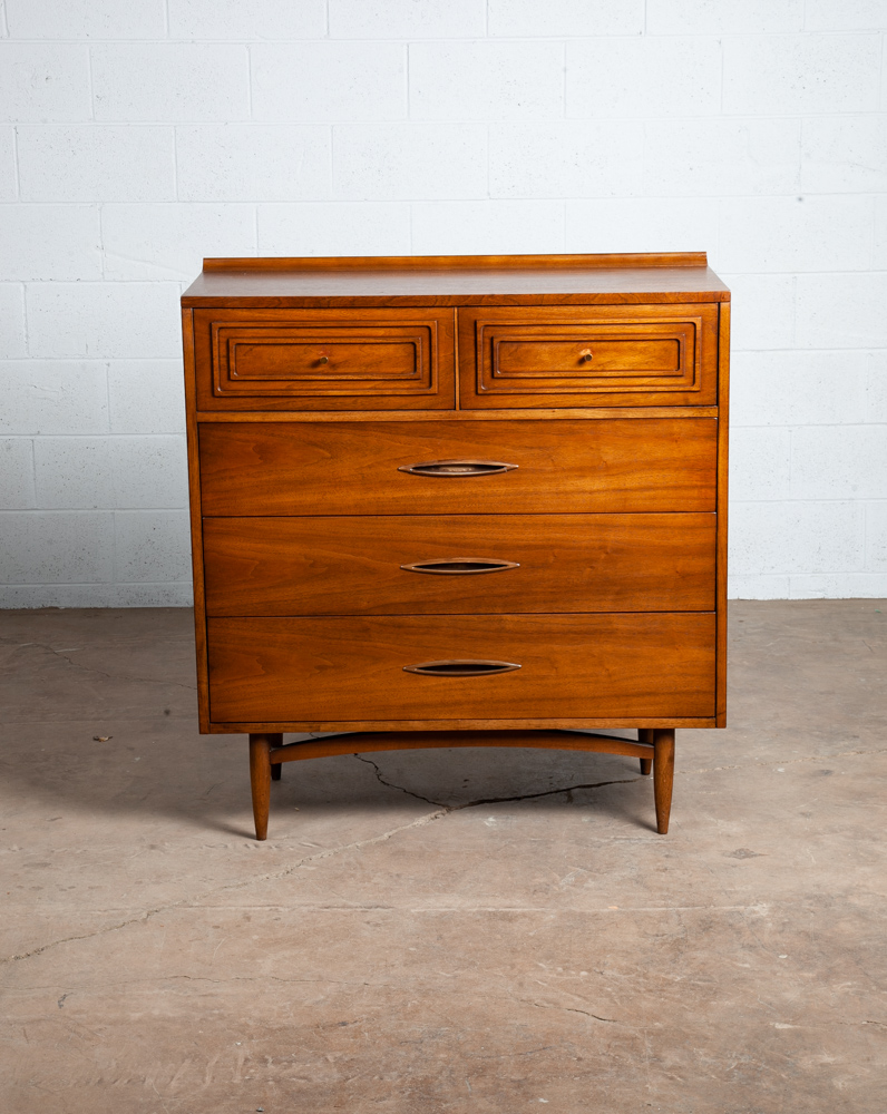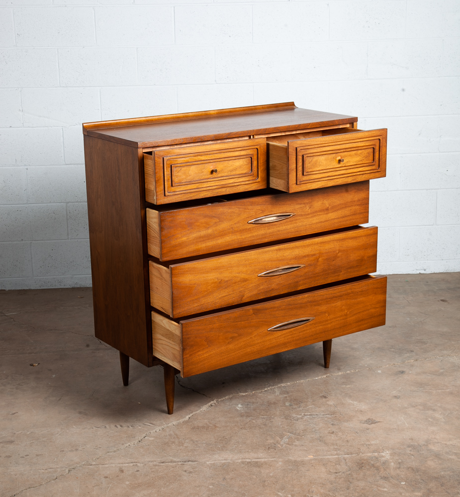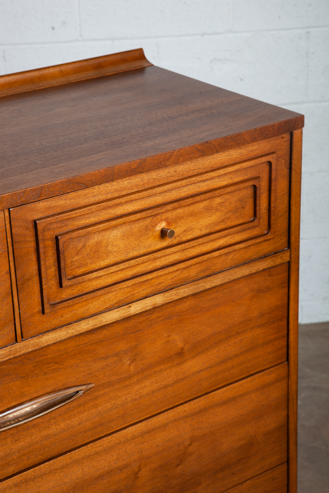 Broyhill Sculptra highboy dresser, circa 1960s. This is a true mid century piece with lots of style and plenty of storage. It features three full size, dovetailed drawers below two smaller single drawers up top. the 1st large drawer is separated into three sections, but the dividers are removable so it can transform into one long open space. Please see all photos to ensure you know what you are buying. We include FREE SHIPPING in the listing price. Some exceptions apply, so please read the full shipping details below.