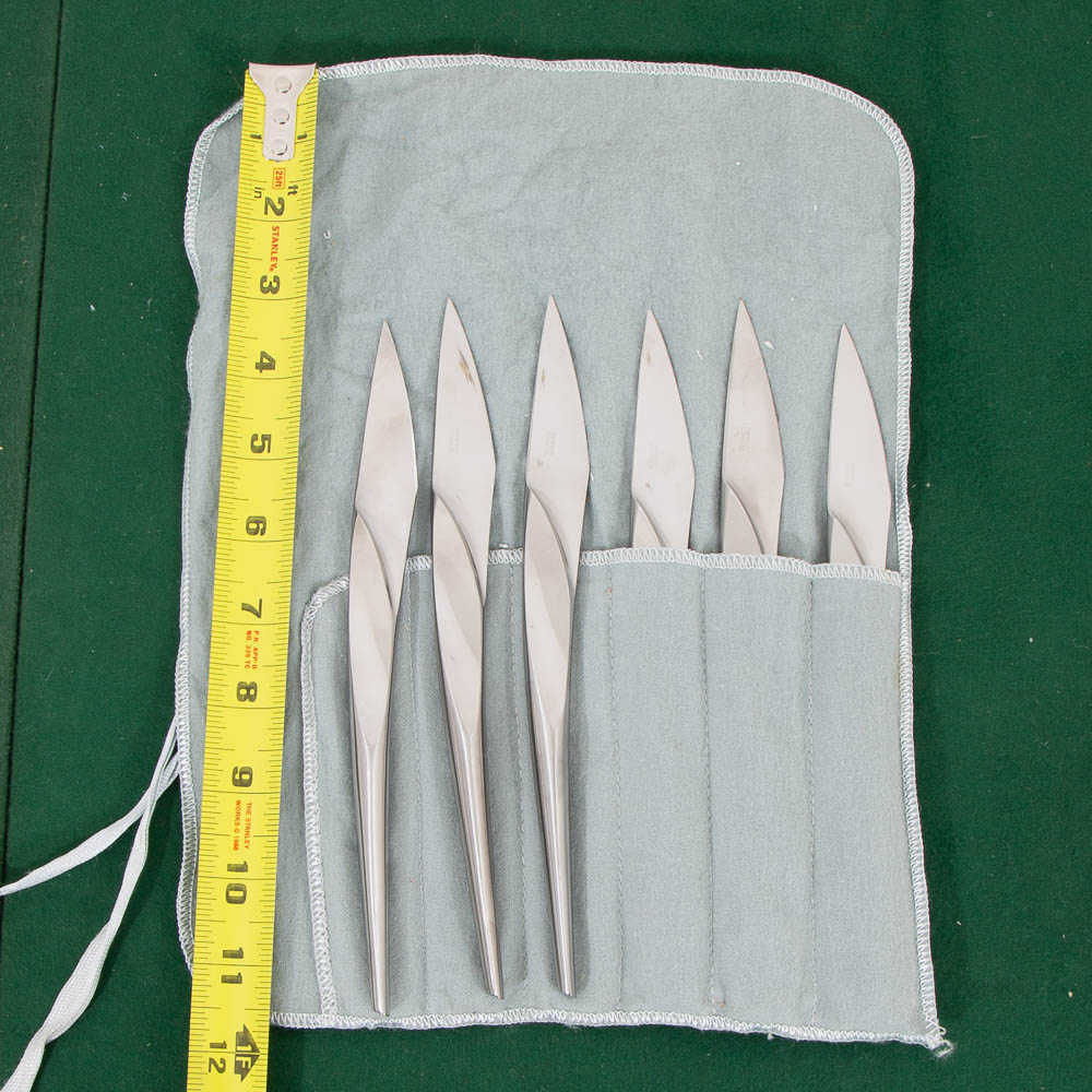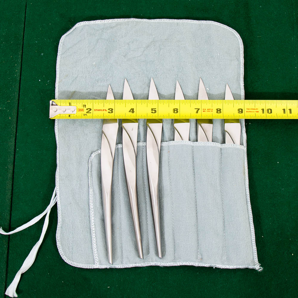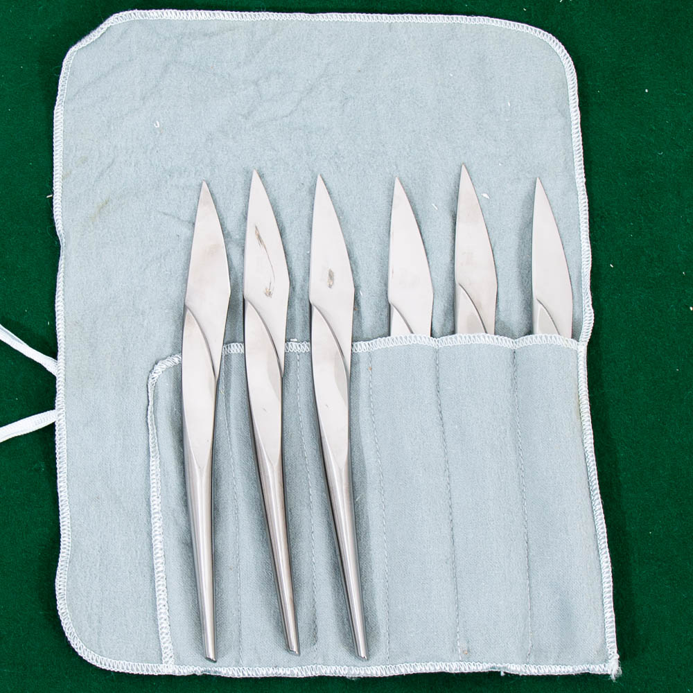 Unique modern cutlery steak knives set made in Italy. Each piece is stamped. Good shape overall. We include FREE SHIPPING in the listing price. Some exceptions apply, so please read the full shipping details below.