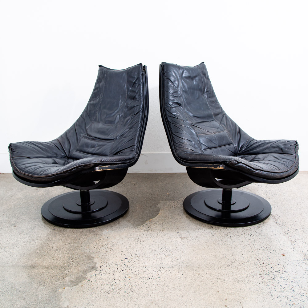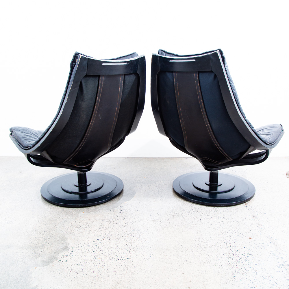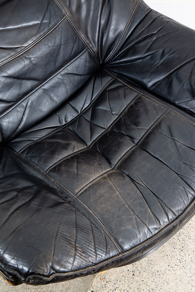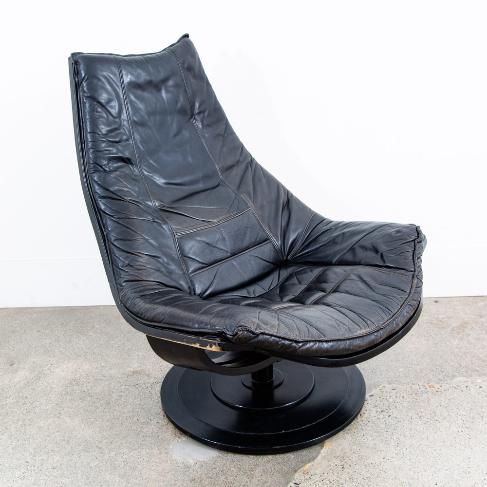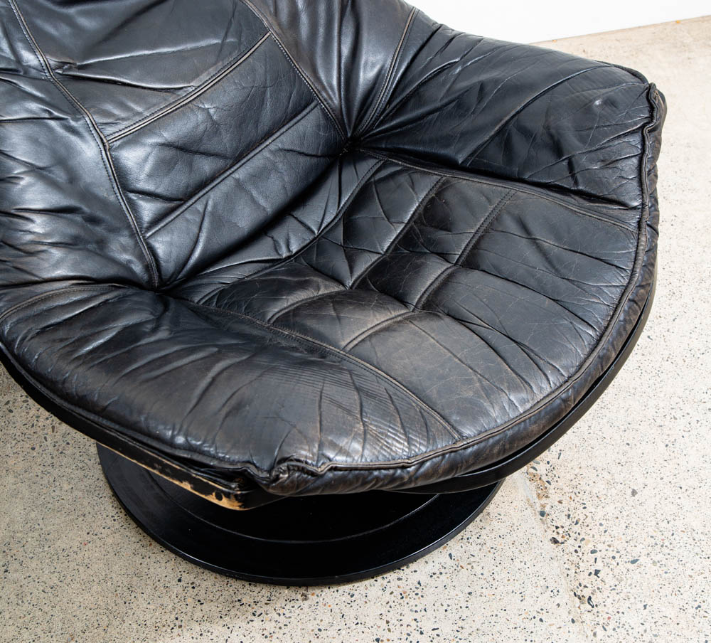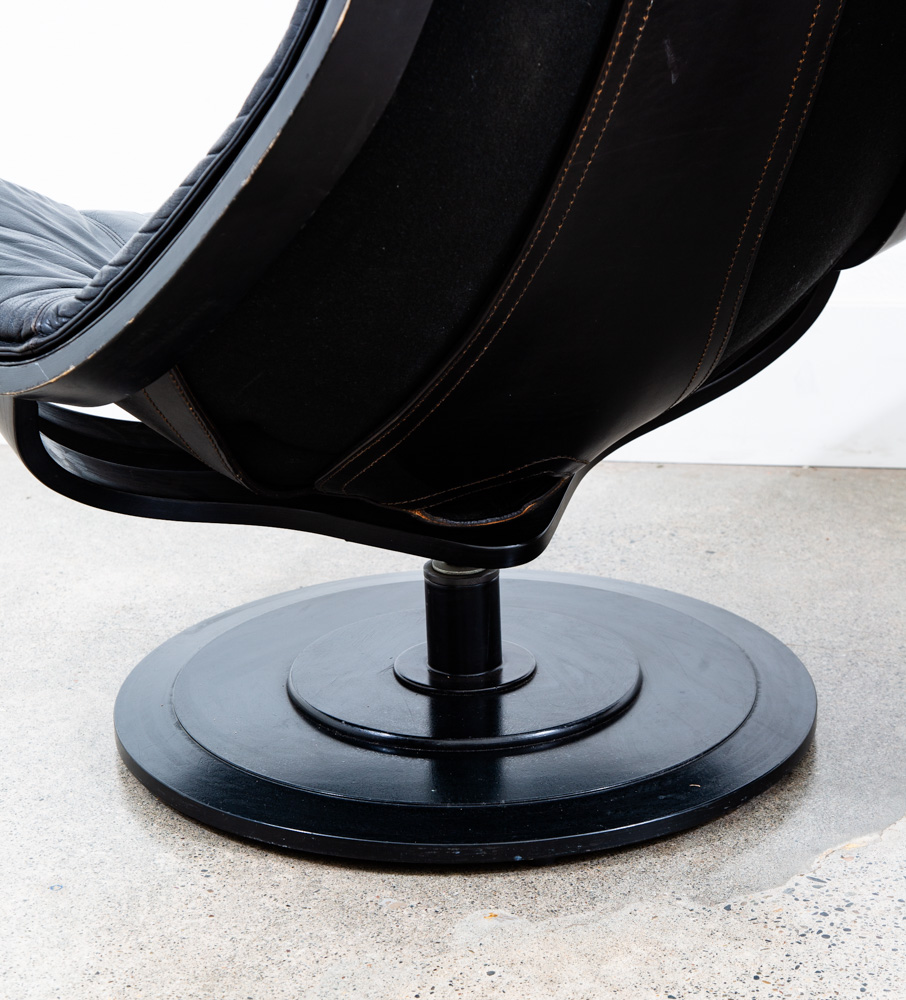 Handsome black leather swivel lounge chair set by OM Designs Takashi Okamura and Erik Marquardsen, for NELO. Made in Sweden.Upholstered in lightly worn in black leather. Ebonized wooden beech frame on circular base. The swivel action is smooth and without issue. Unstamped example. Recently imported from Europe. Please see all photos to ensure you know what you are buying. We include FREE SHIPPING in the listing price. Some exceptions apply, so please read the full shipping details below.