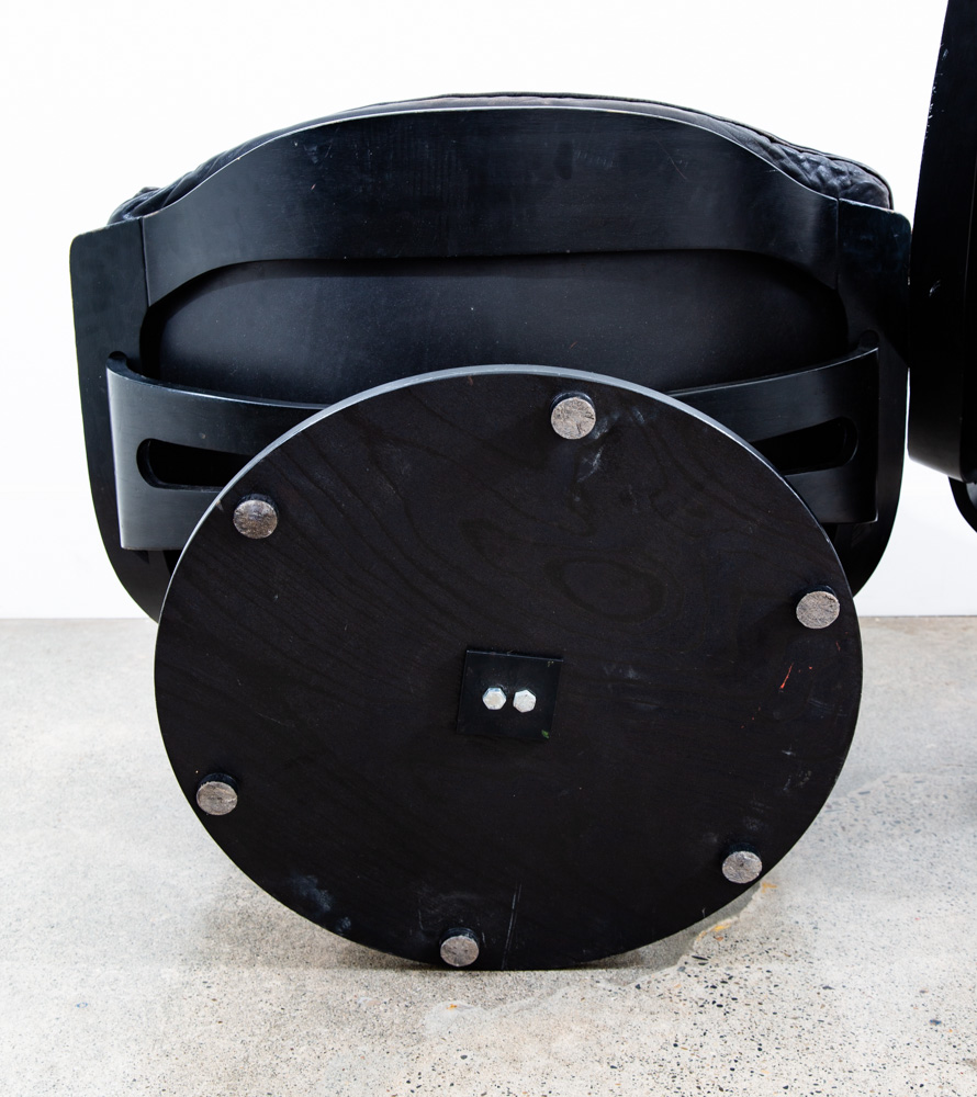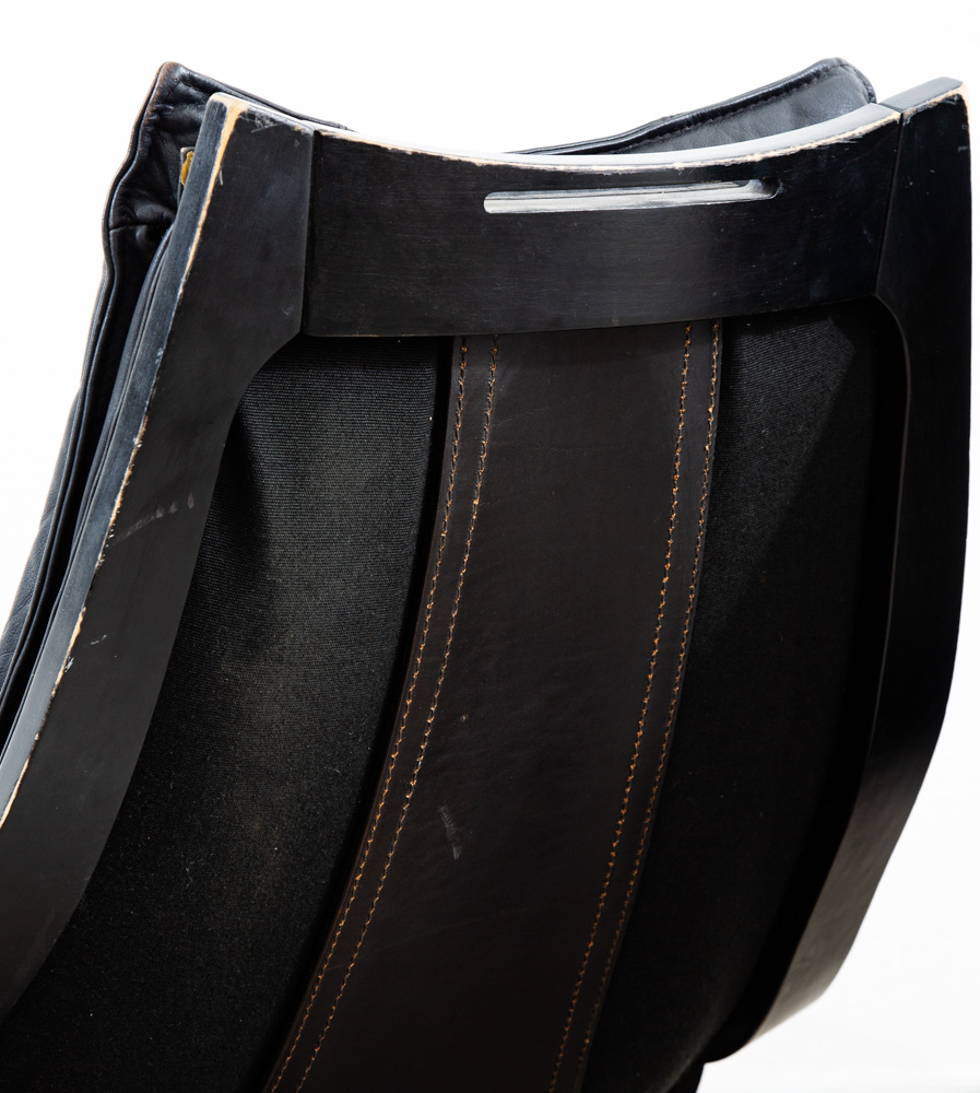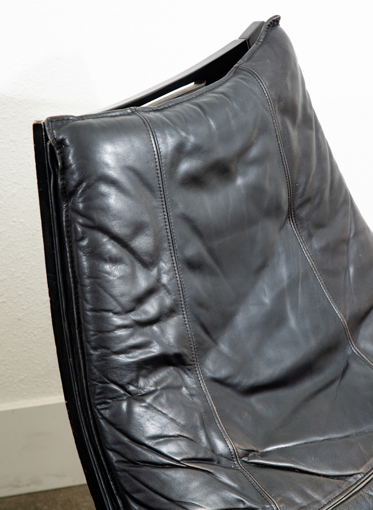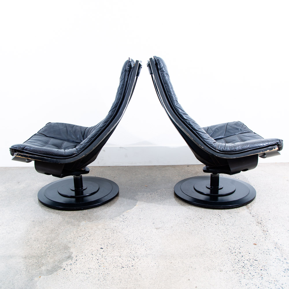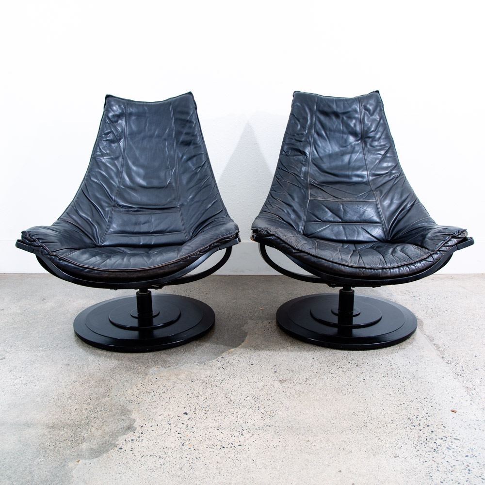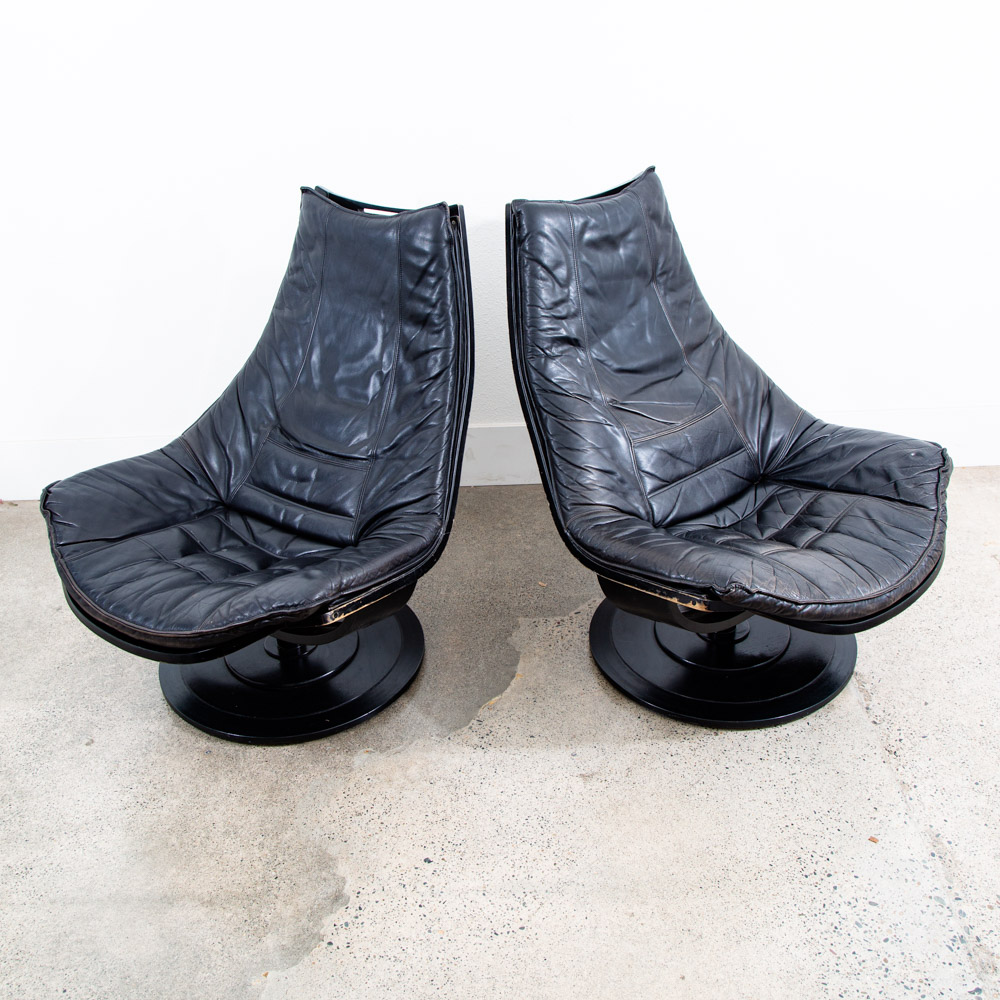 Handsome black leather swivel lounge chair set by OM Designs Takashi Okamura and Erik Marquardsen, for NELO. Made in Sweden.Upholstered in lightly worn in black leather. Ebonized wooden beech frame on circular base. The swivel action is smooth and without issue. Unstamped example. Recently imported from Europe. Please see all photos to ensure you know what you are buying. We include FREE SHIPPING in the listing price. Some exceptions apply, so please read the full shipping details below.