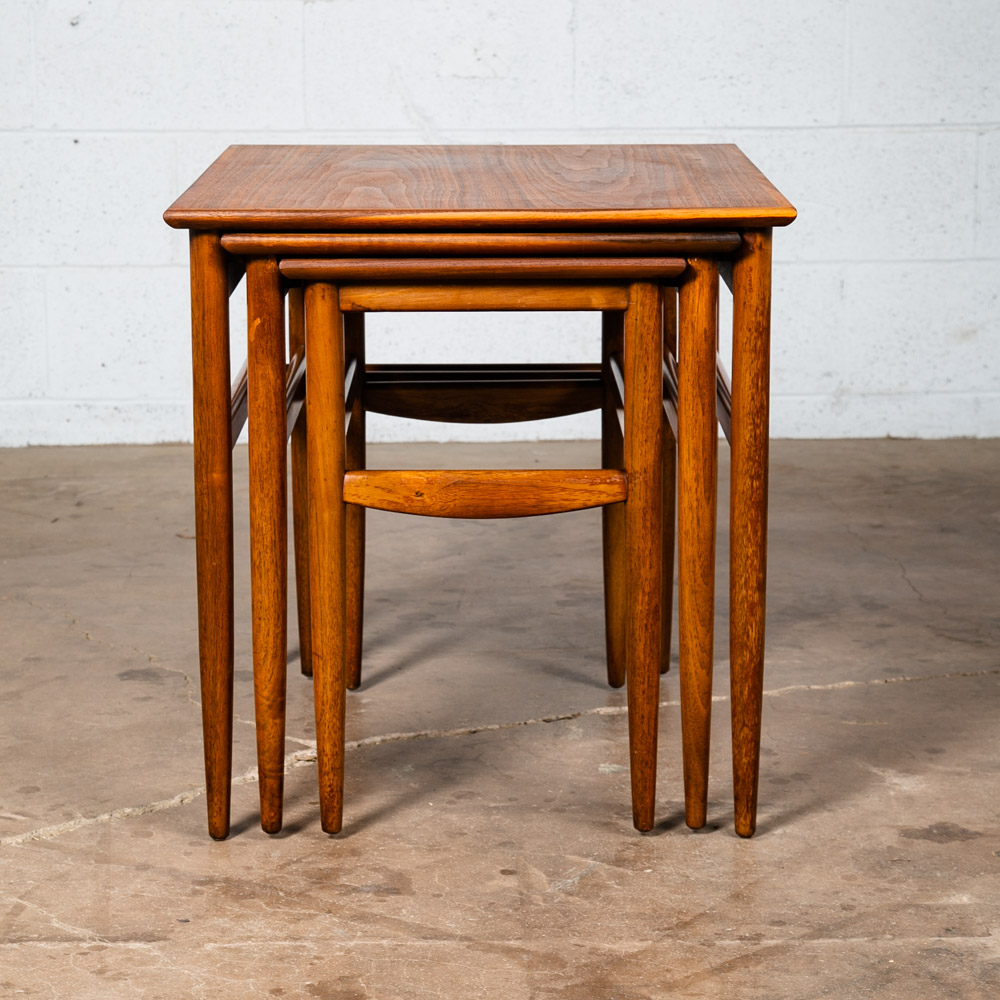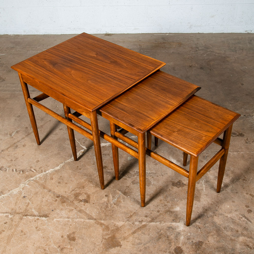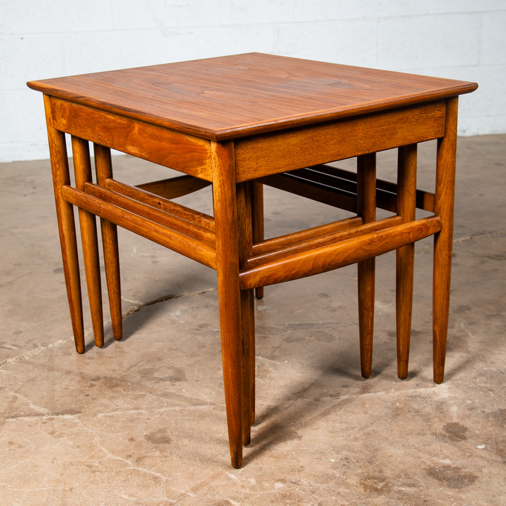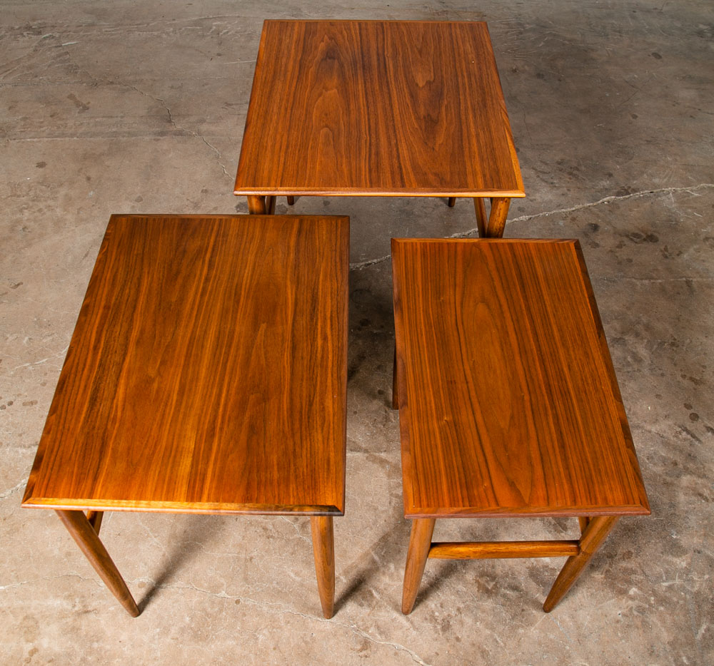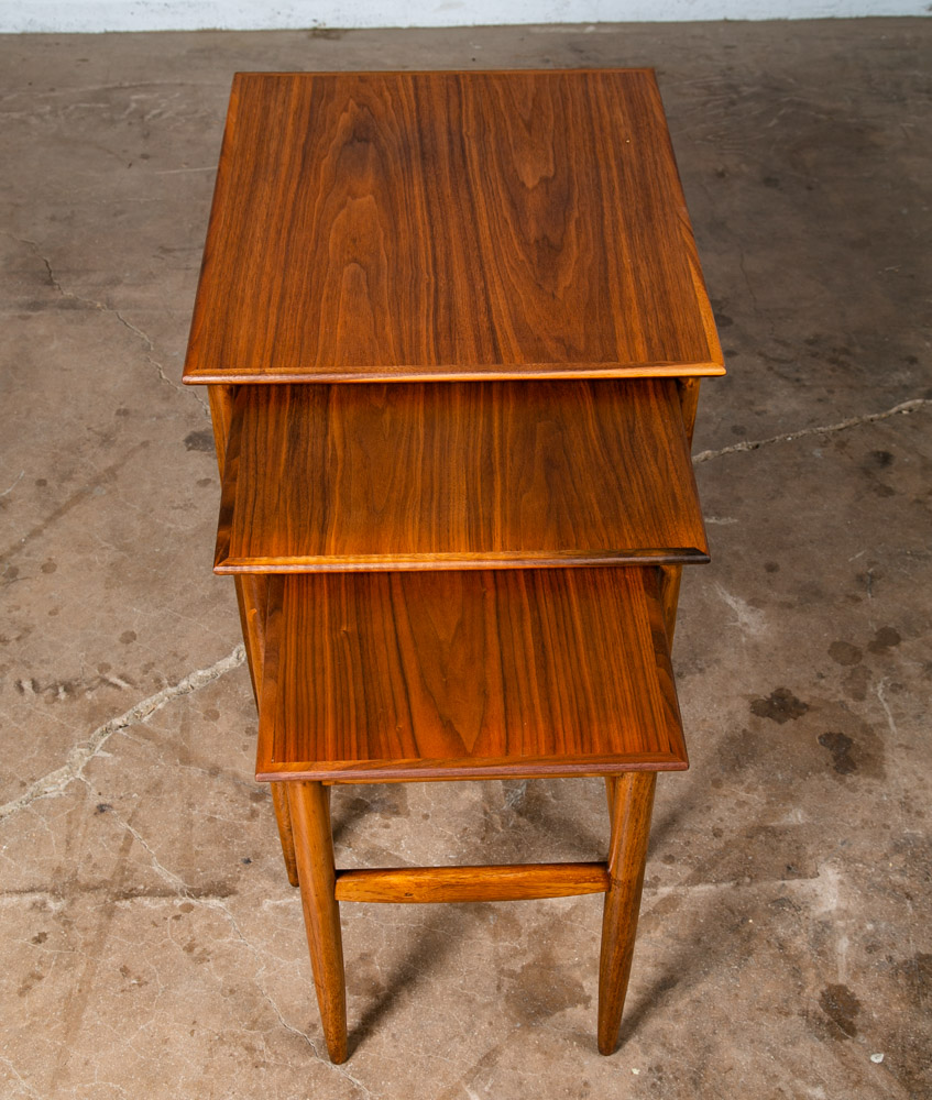 Set of 3 American made solid walnut nesting tables in walnut. Solid walnut construction throughout other than the center top surface. Unknown maker / designers. Well made pieces that can be broken down for easy movement. Great as side tables or end tables. We include FREE SHIPPING in the listing price. Some exceptions apply, so please read the full shipping details below.