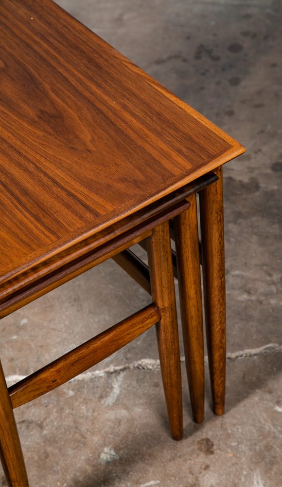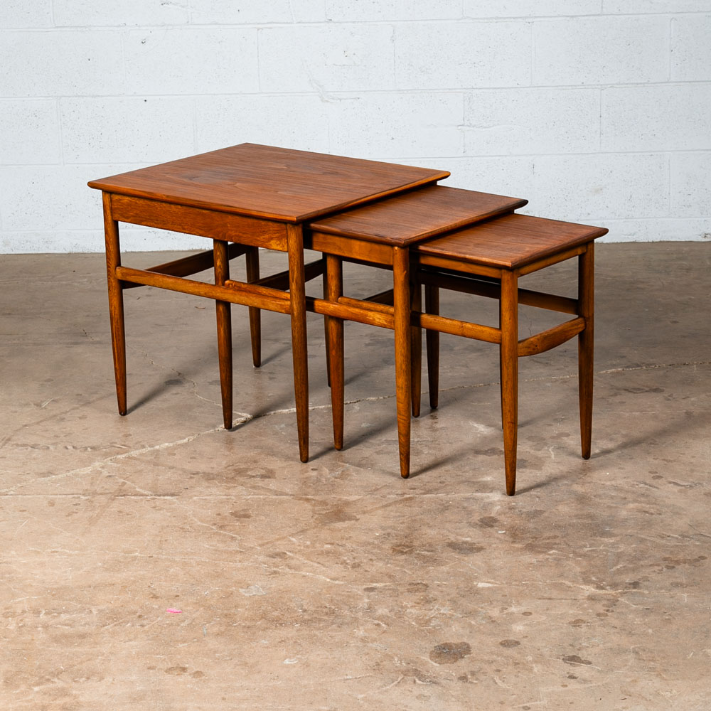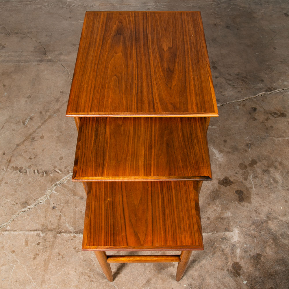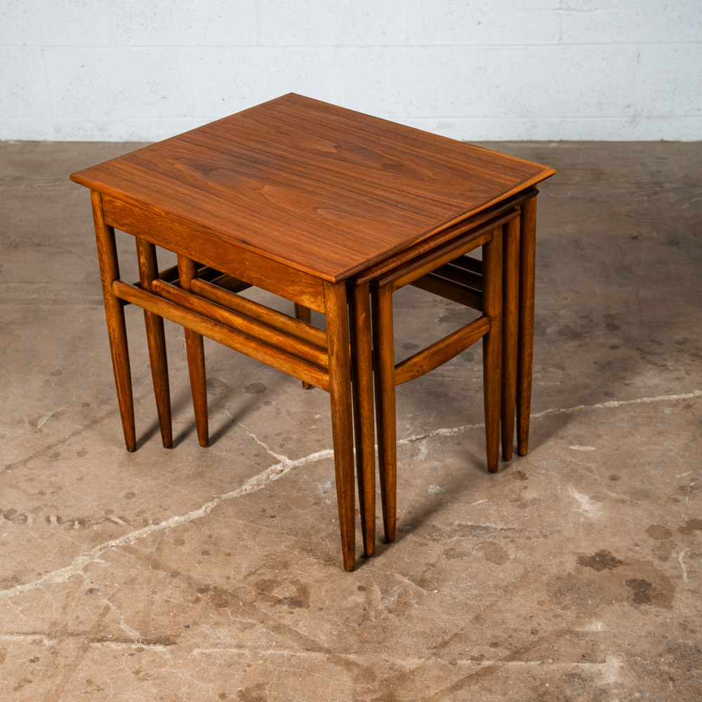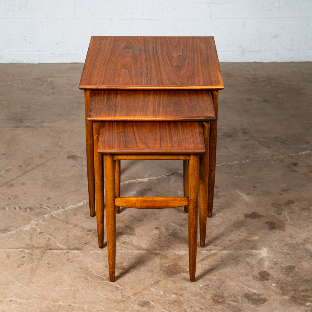 Set of 3 American made solid walnut nesting tables in walnut. Solid walnut construction throughout other than the center top surface. Unknown maker / designers. Well made pieces that can be broken down for easy movement. Great as side tables or end tables. We include FREE SHIPPING in the listing price. Some exceptions apply, so please read the full shipping details below.