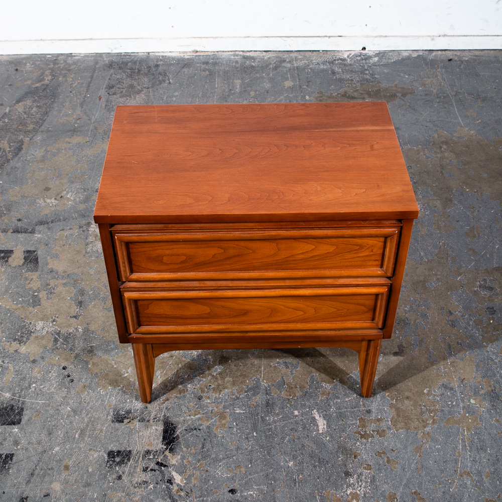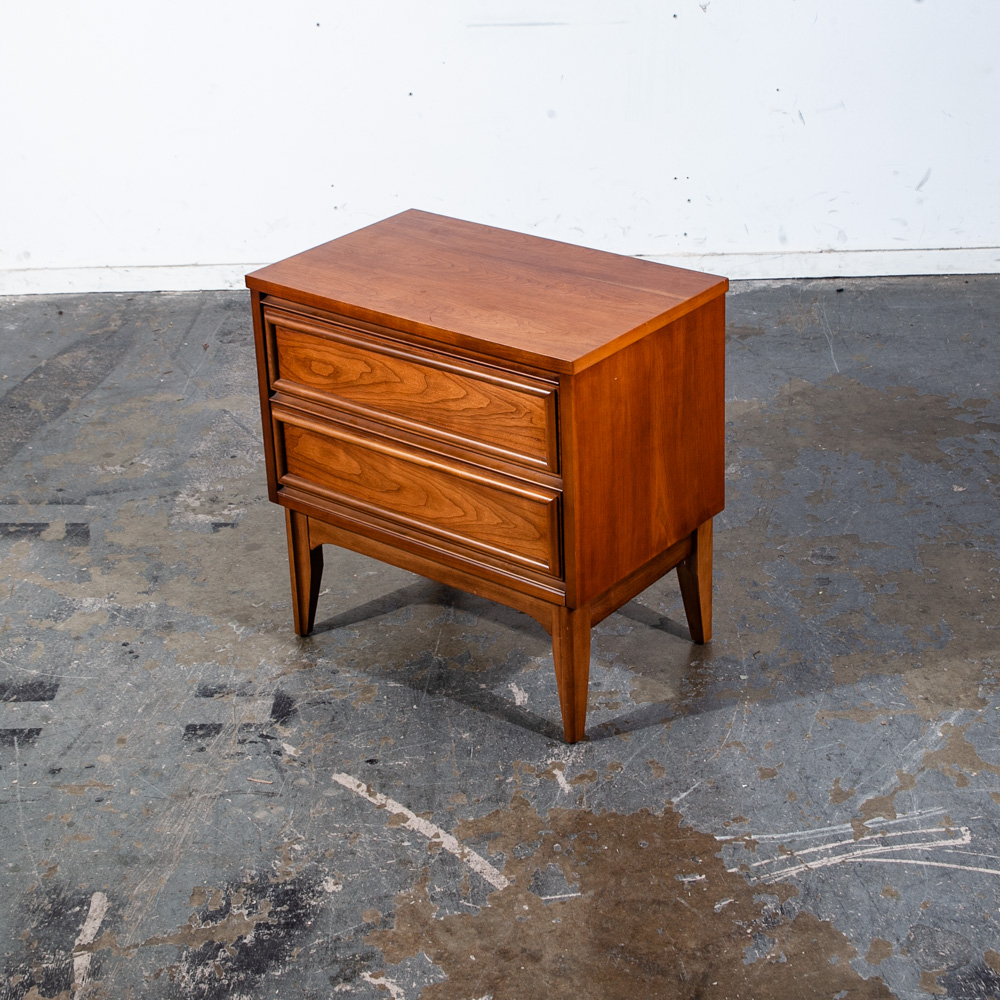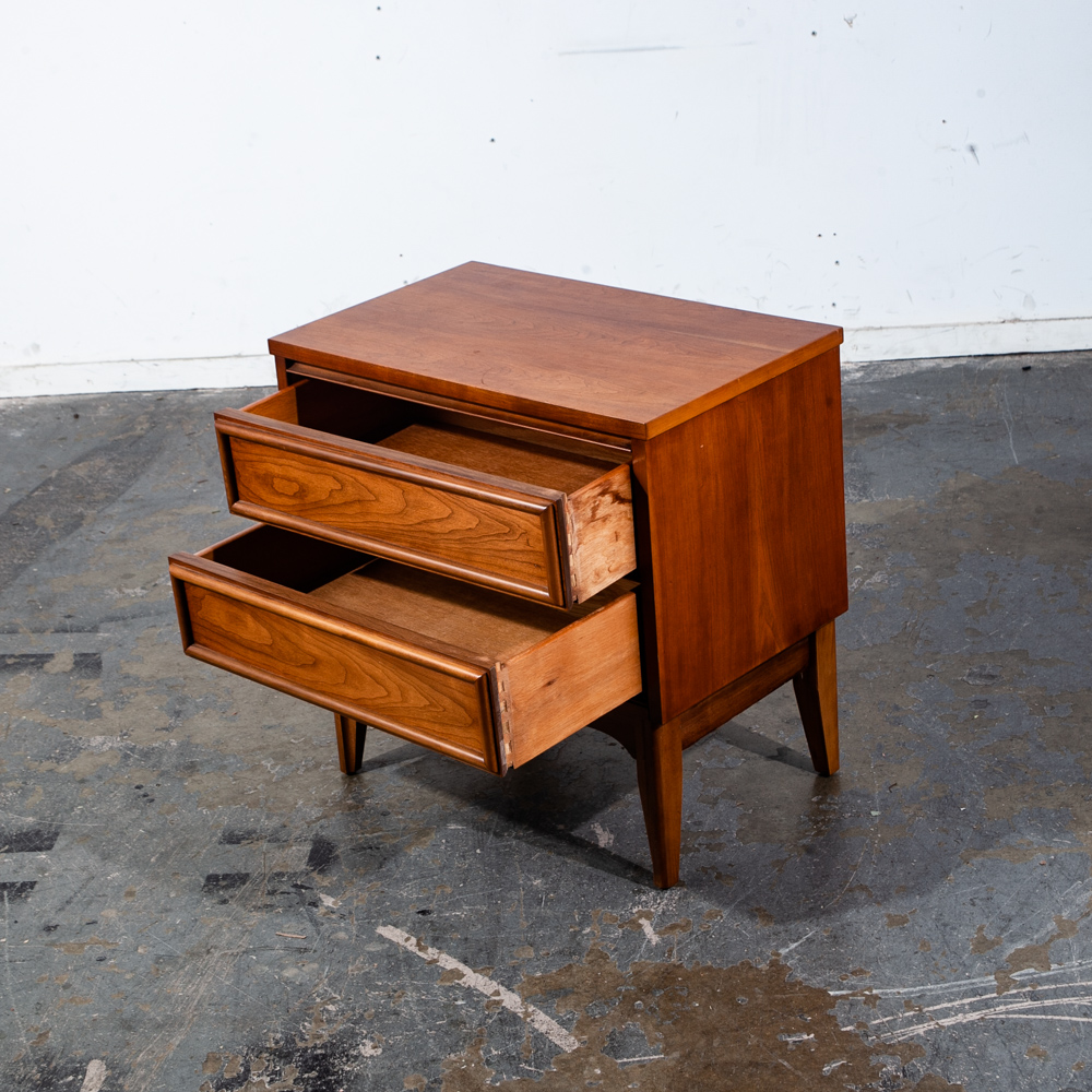 Unique cherry wood 2 drawer mid century modern nightstand. No issues to note. No makers mark or stamp. Sharp looking style. These nightstands tend to be harder to find and sell amost imediately as they come into the store. Sure to add style and class to any room or space. We include FREE SHIPPING in the listing price. Some exceptions apply, so please read the full shipping details below.
