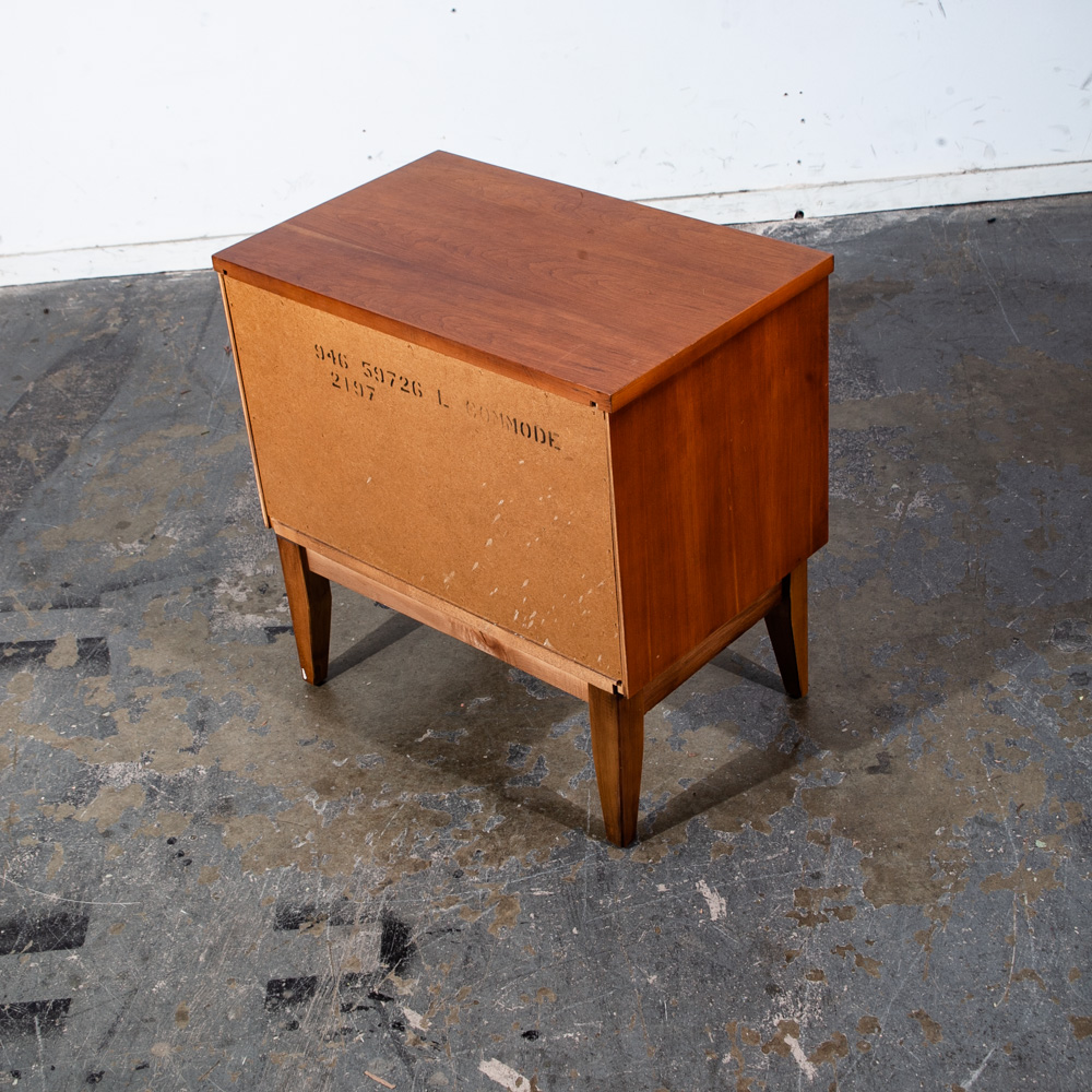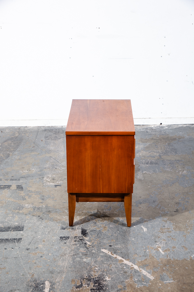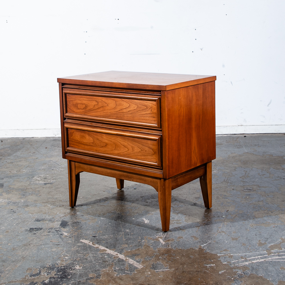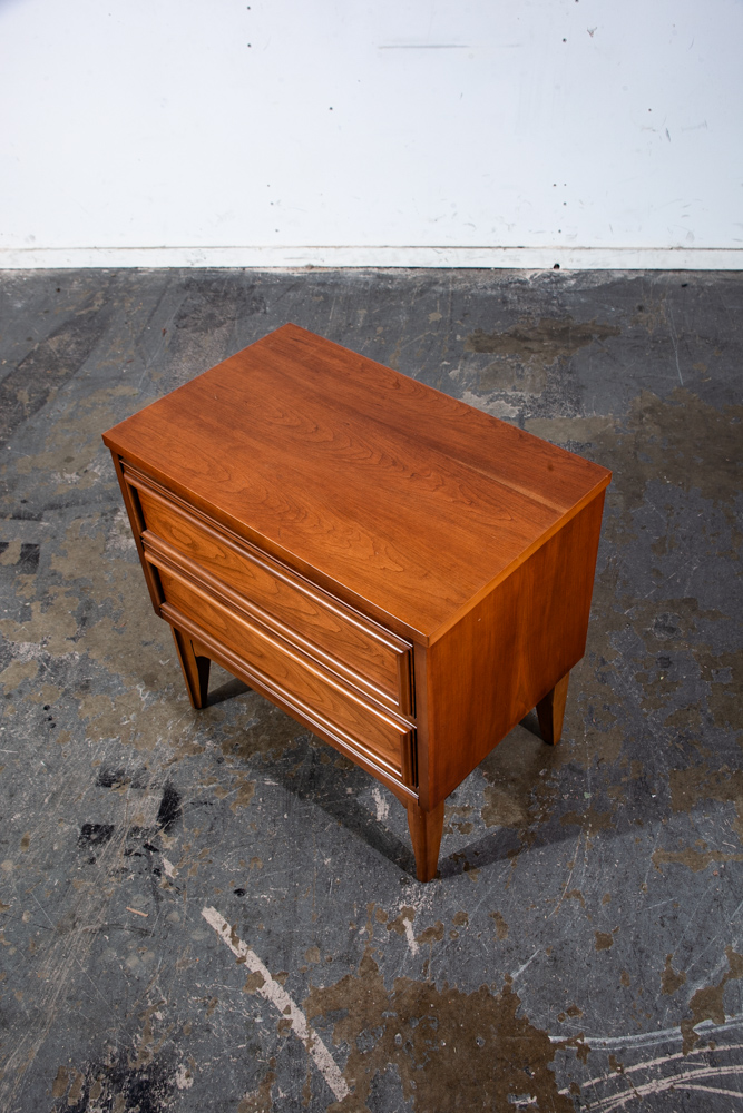 Unique cherry wood 2 drawer mid century modern nightstand. No issues to note. No makers mark or stamp. Sharp looking style. These nightstands tend to be harder to find and sell amost imediately as they come into the store. Sure to add style and class to any room or space. We include FREE SHIPPING in the listing price. Some exceptions apply, so please read the full shipping details below.