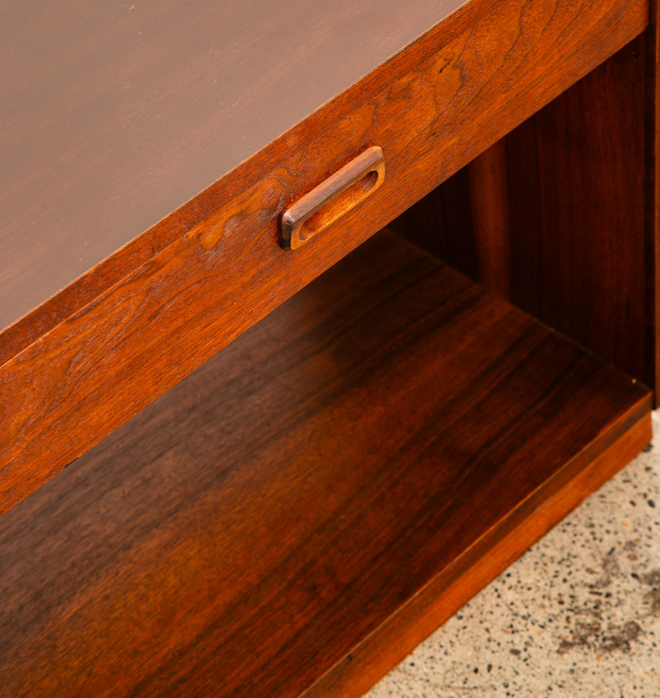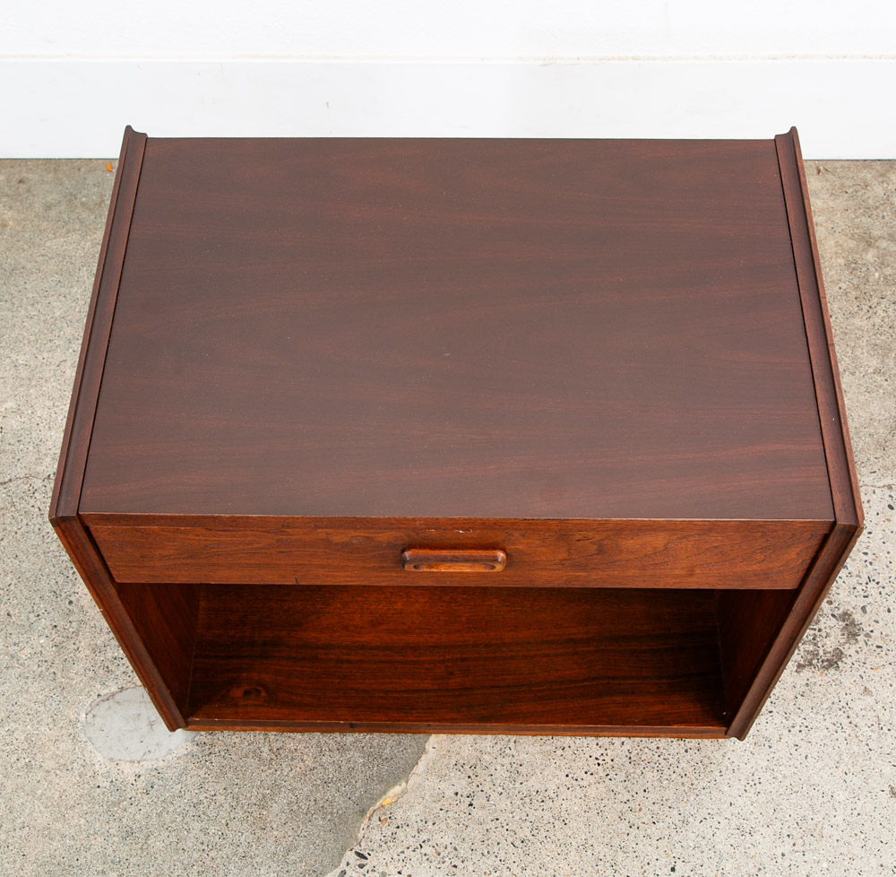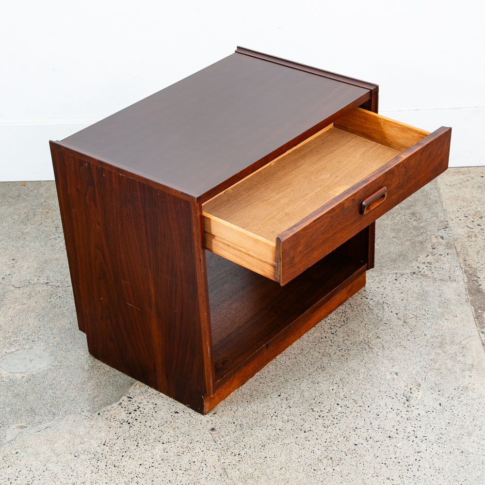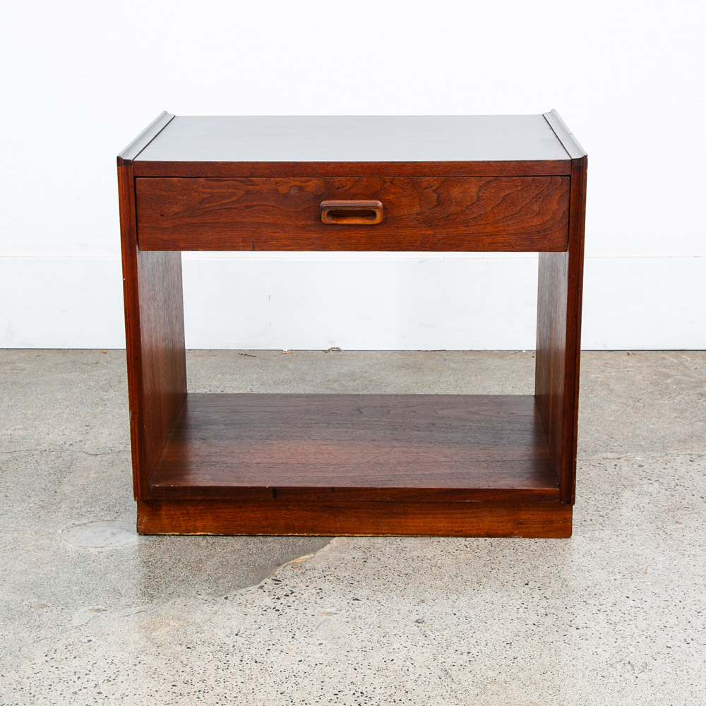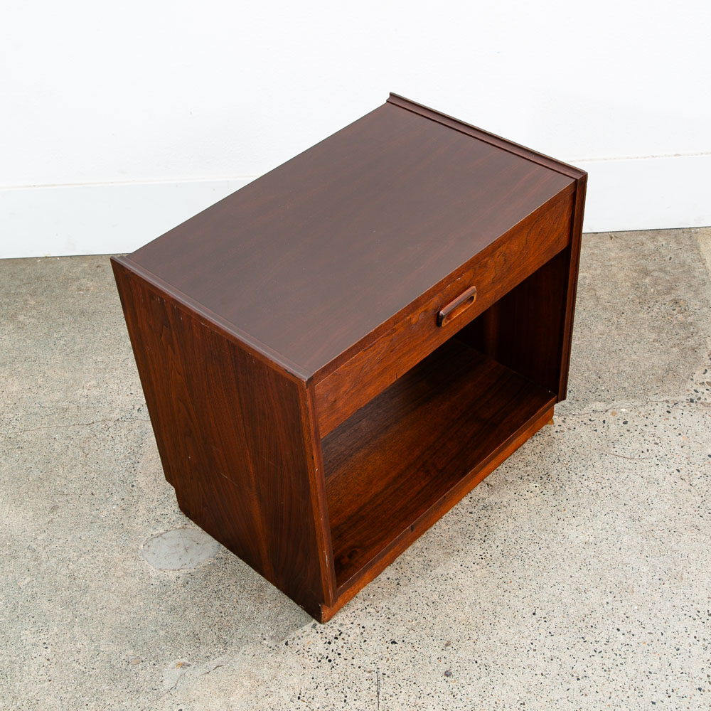 Unique single nightstand / end table in walnut by Founders. Comes with single drawer and storage space. Laminate top surface for easy cleaning. The rest of the piece comes in a beautiful walnut. Great in a bedroom or in a living room. So many options. We include FREE SHIPPING in the listing price. Some exceptions apply, so please read the full shipping details below.
