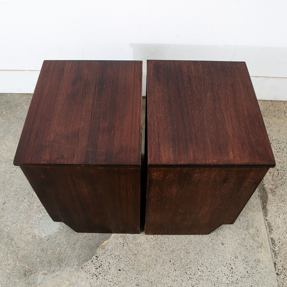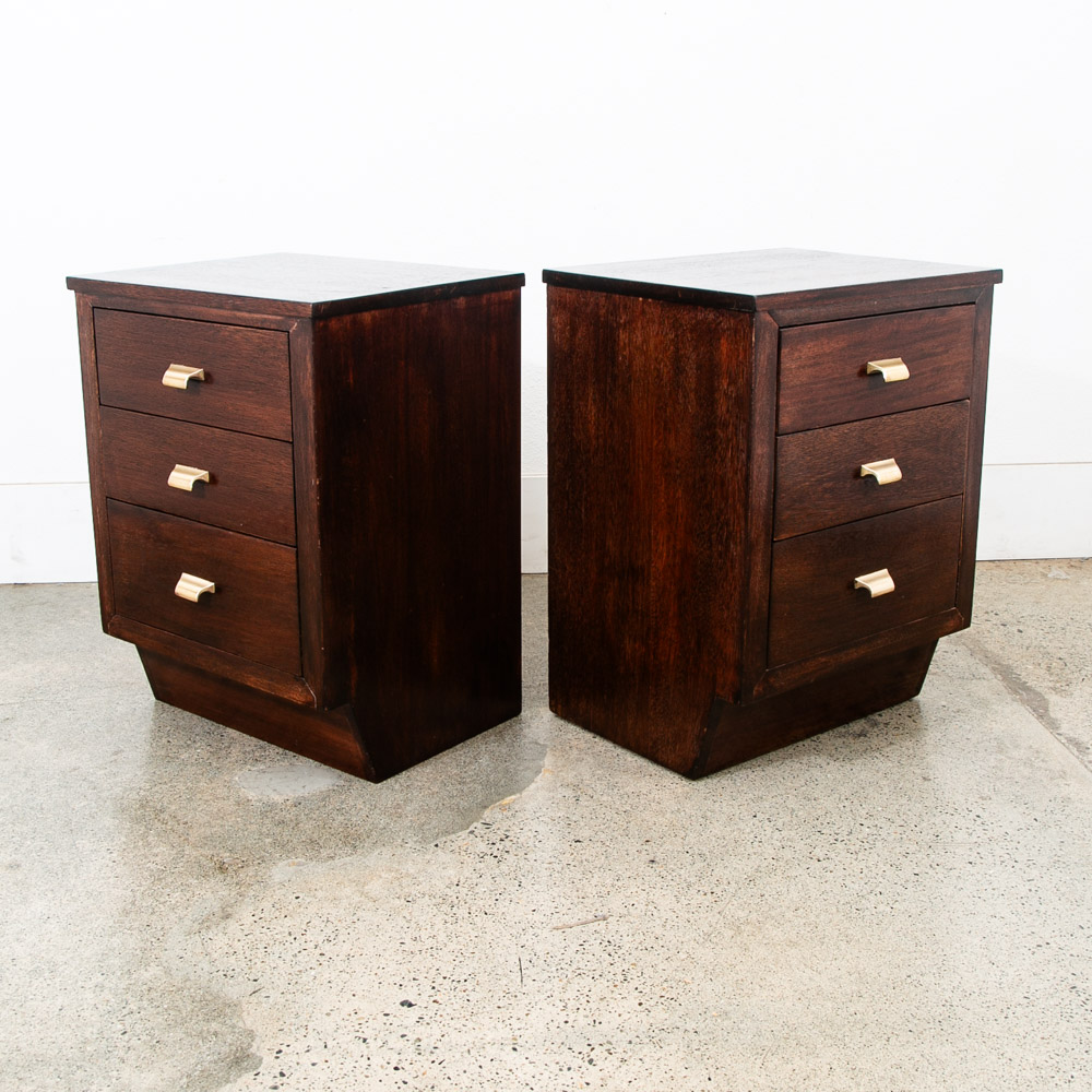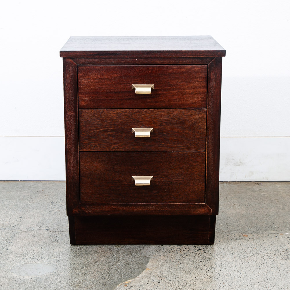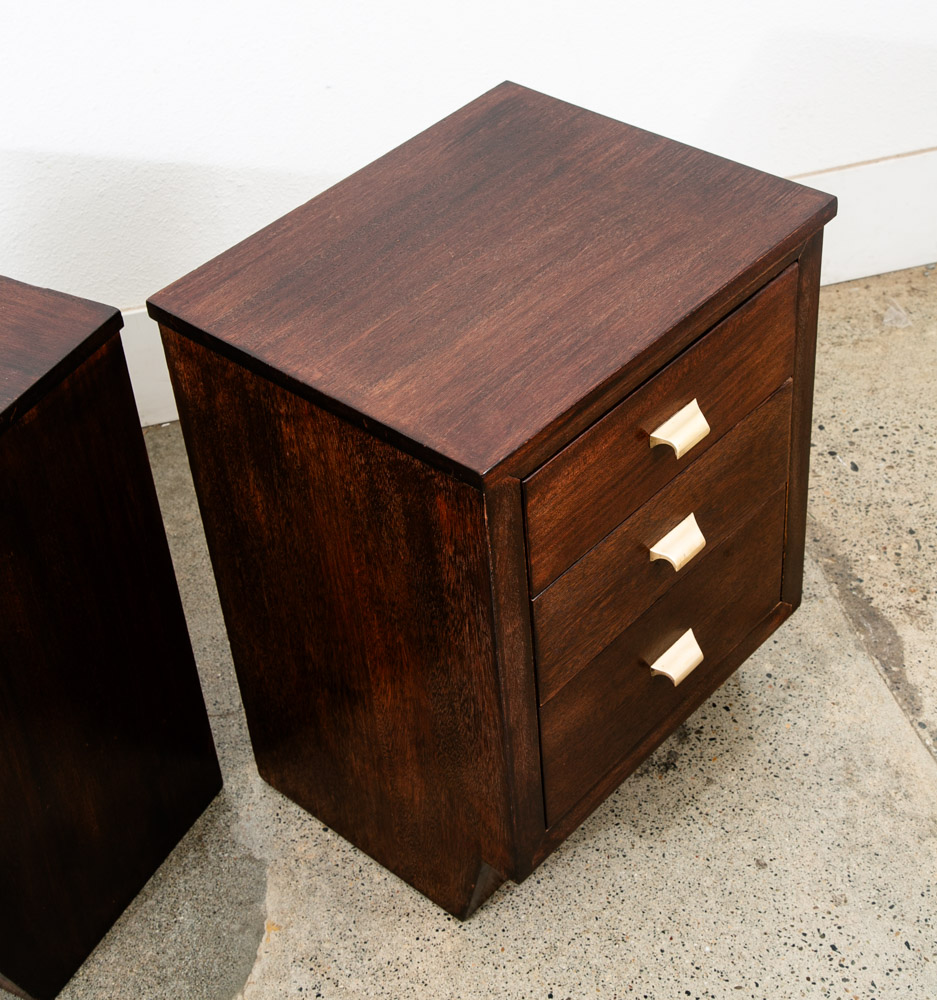 3 drawer mahogany nightstands with brass handles. Deep dark brown finish throughout. Unstamped example. High quality nightstands are hard to find at the moment. Please see all photos to ensure you know what you are buying. We include FREE SHIPPING in the listing price. Some exceptions apply, so please read the full shipping details below.
