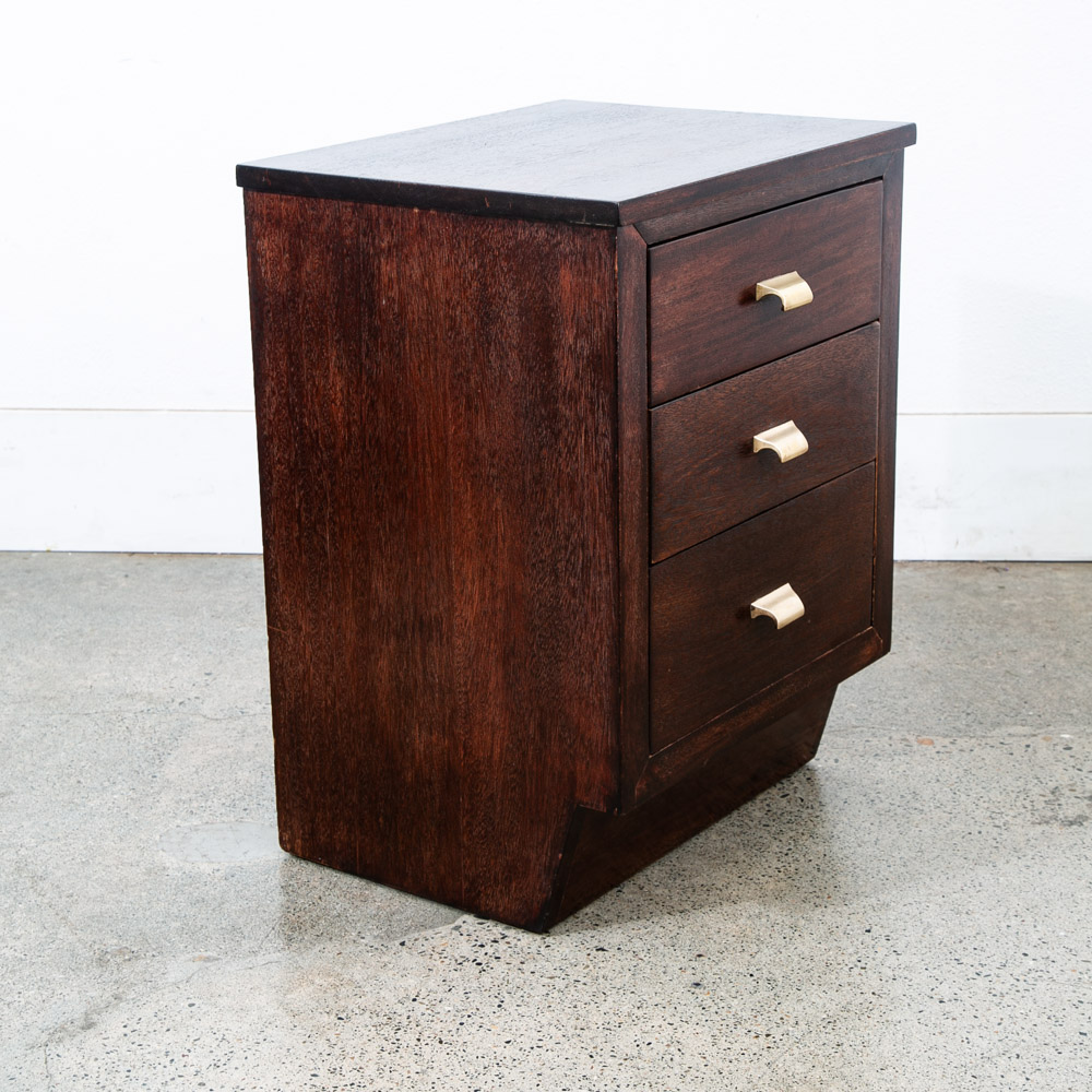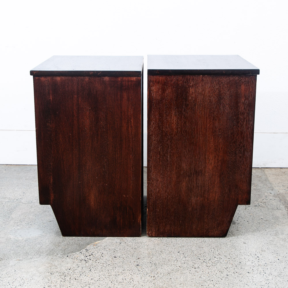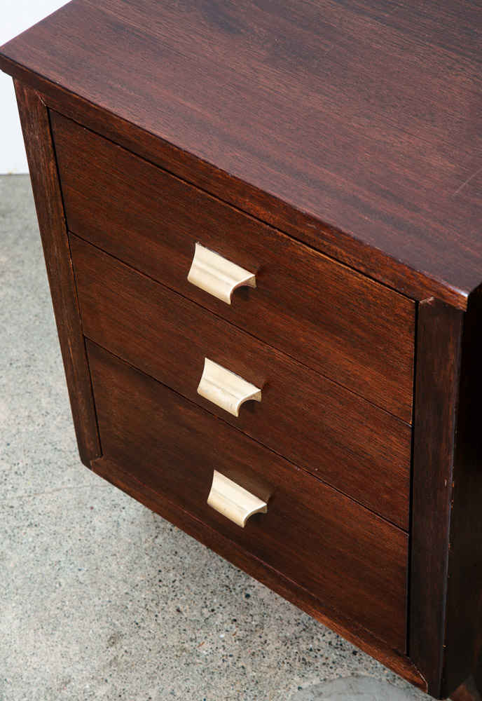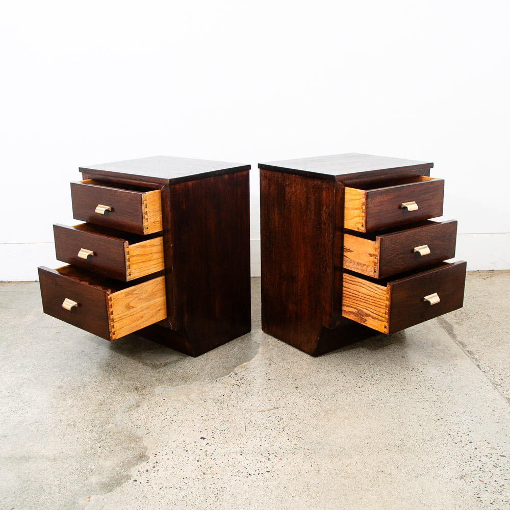 3 drawer mahogany nightstands with brass handles. Deep dark brown finish throughout. Unstamped example. High quality nightstands are hard to find at the moment. Please see all photos to ensure you know what you are buying. We include FREE SHIPPING in the listing price. Some exceptions apply, so please read the full shipping details below.