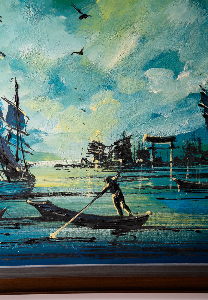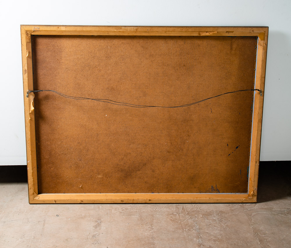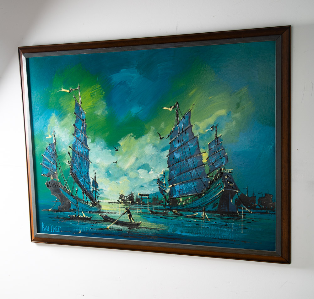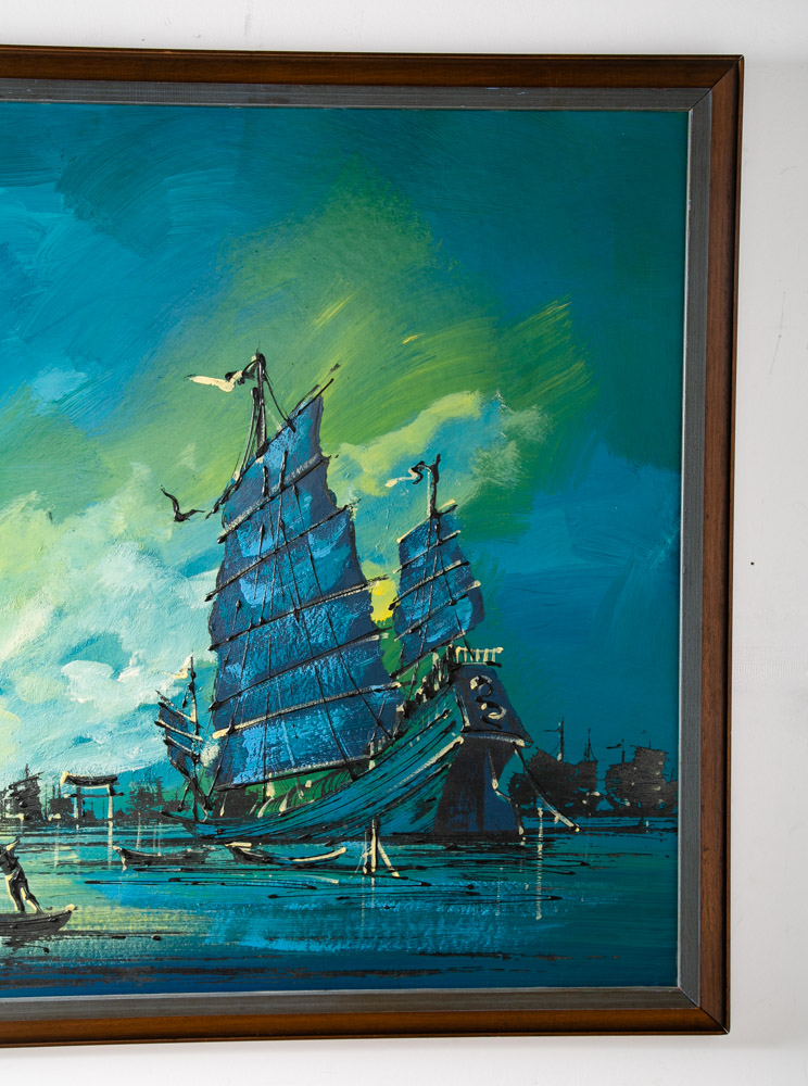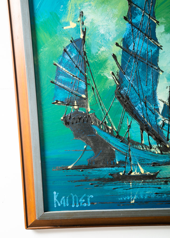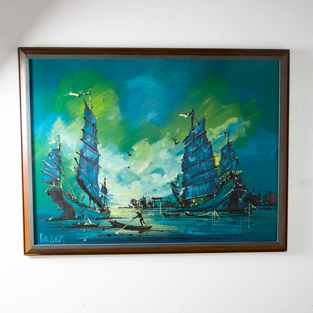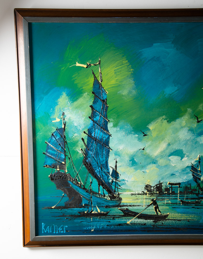Outstanding large abstract sailboat / galley ocean scene painting Signed "Kamer". Colors throughout include Blues greens, blacks and golds. Unique large piece. sticker note on the back states: Originals by Carlo of Hollywood. Unique 60s retro styling. We include FREE SHIPPING in the listing price. Some exceptions apply, so please read the full shipping details below.