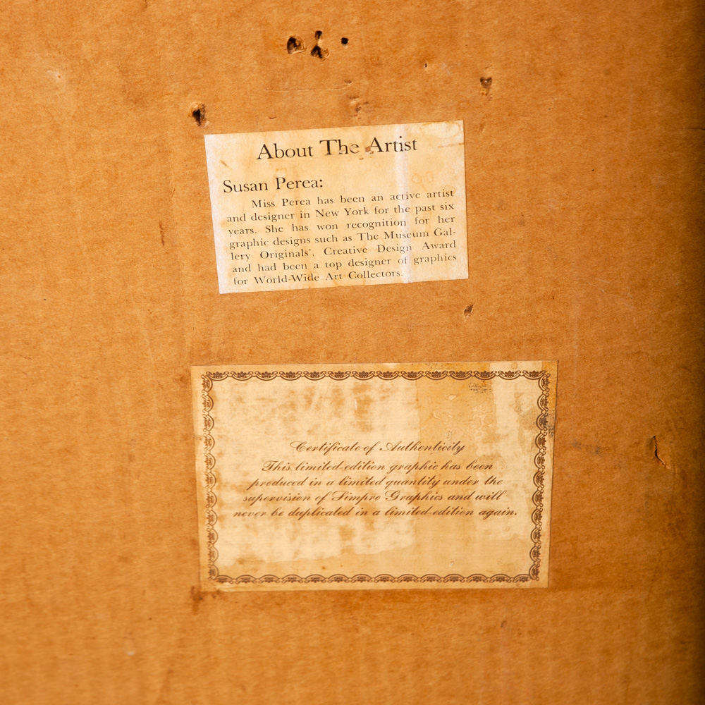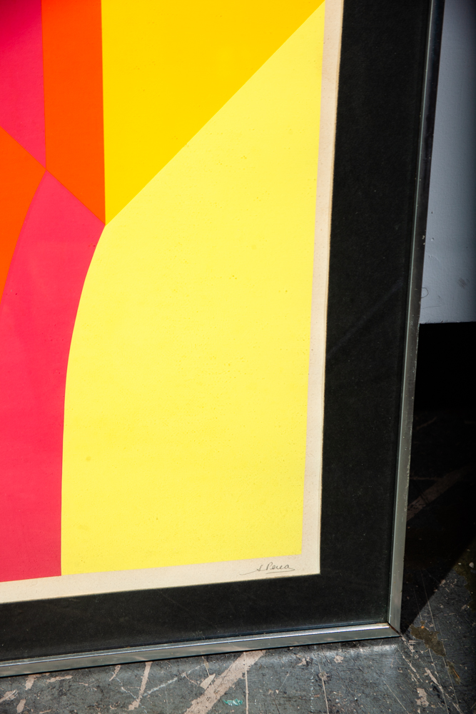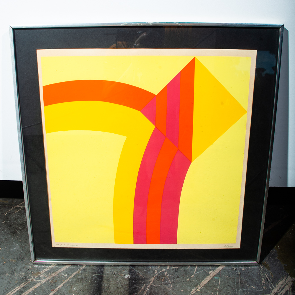 Abstract illustrative geometric signed and numbered lithograph by artist Susan Perea. The piece is titled "T Square". The piece offers bright colors including red, yellows and oranges. The piece has a short bio of the artist on the back. We include FREE SHIPPING in the listing price. Some exceptions apply, so please read the full shipping details below. Condition report: Very good condition. No major issues or damage to be seen. Glass is intact. Art is tight within the frame.