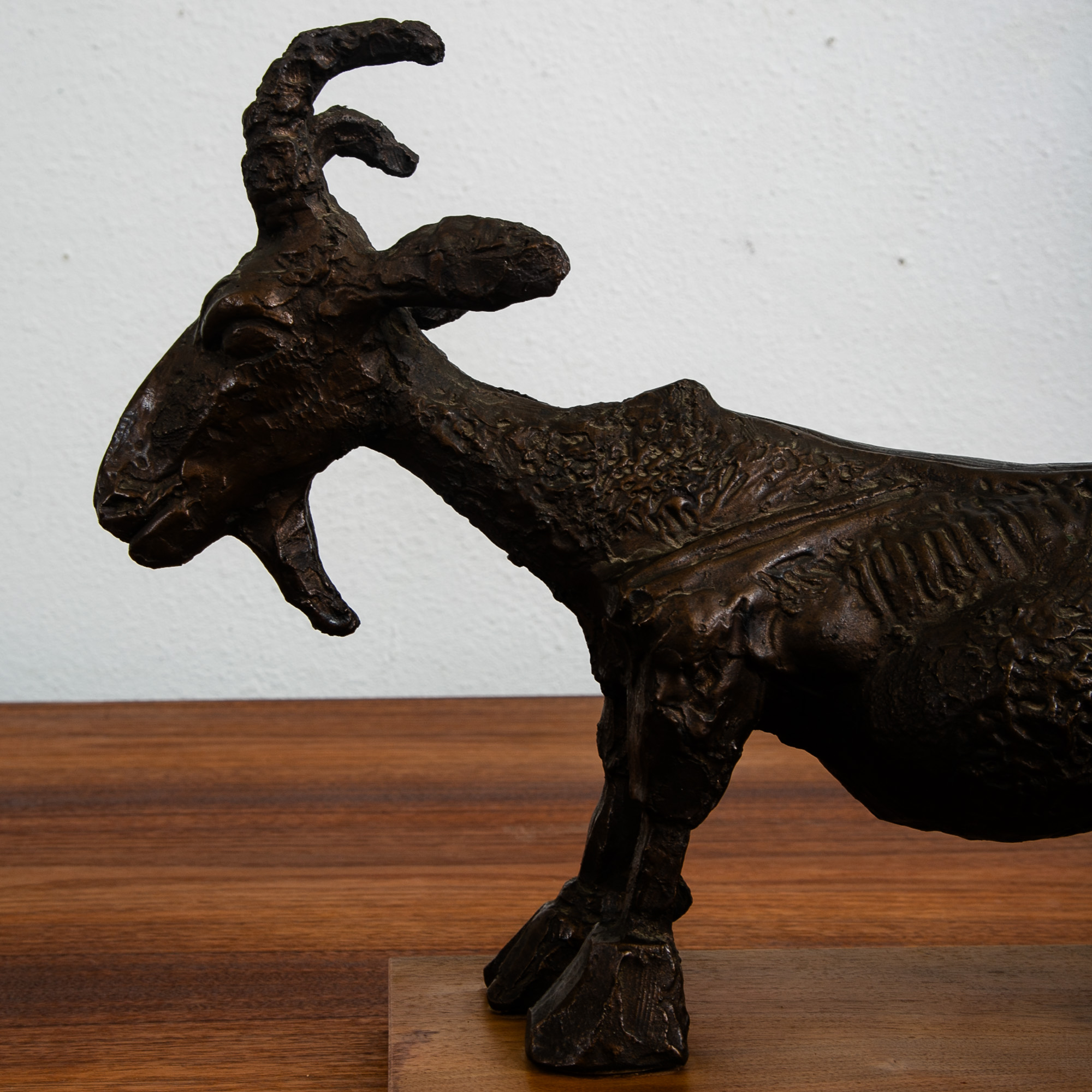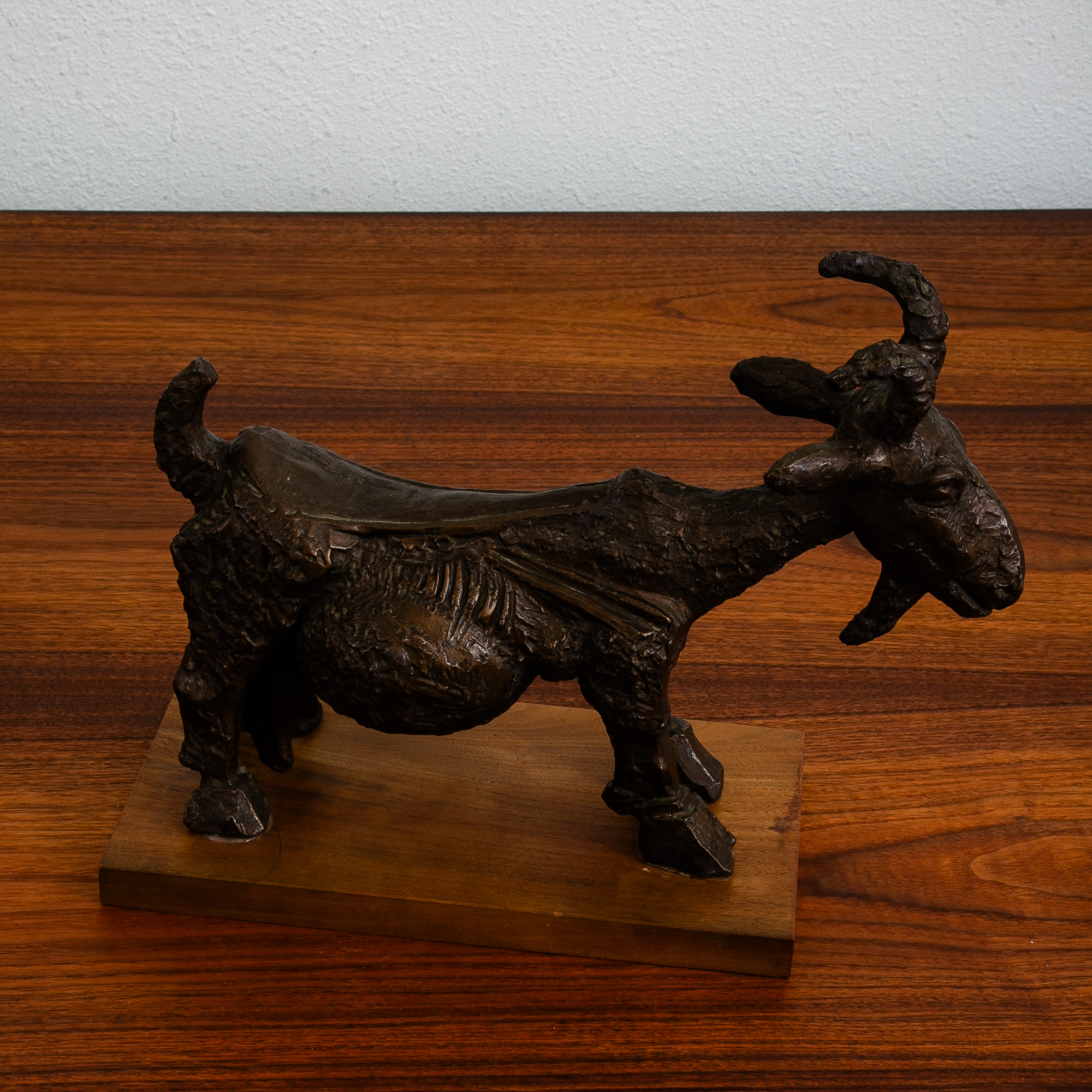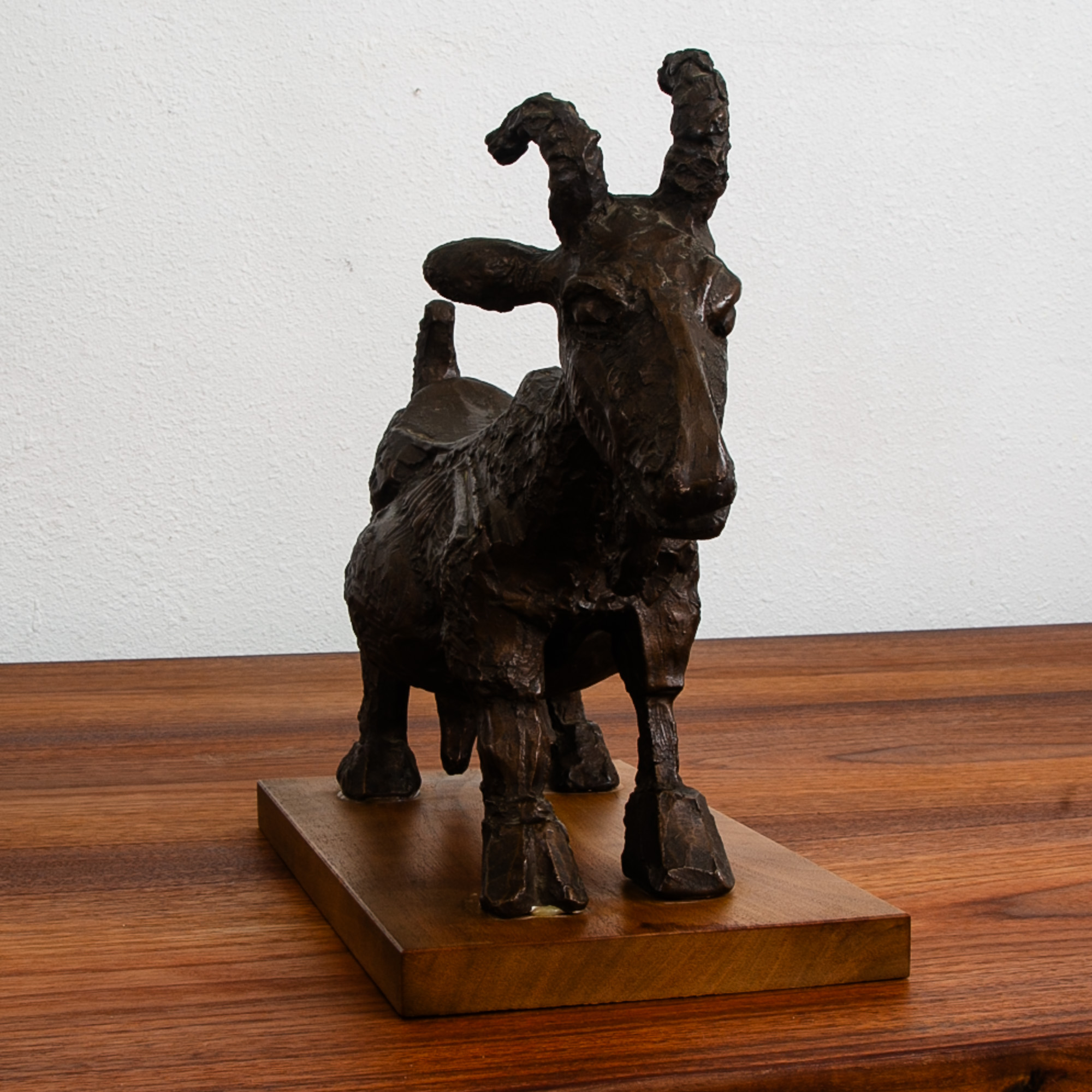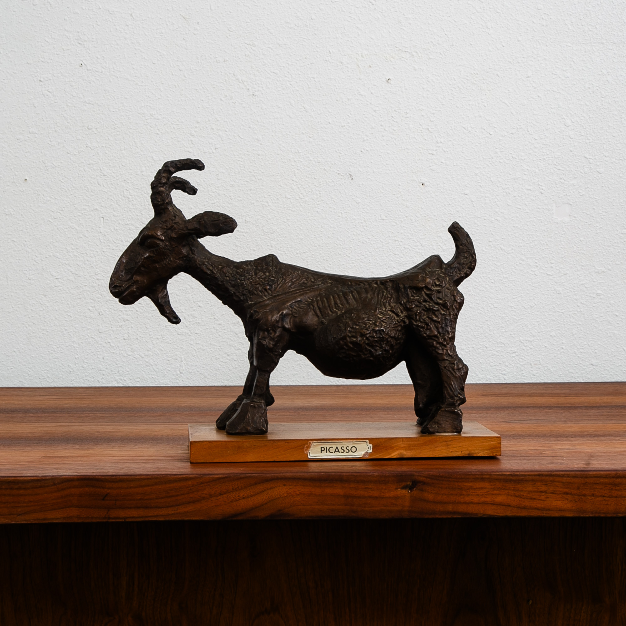 Mid Century Modern replica of Pablo Picasso's "She Goat" sculpture. The Goat is made from plaster with a metallic paint/coating to resemble the original piece. This statue has a solid Oak base with a label with damage displaying Picasso's Sir name.