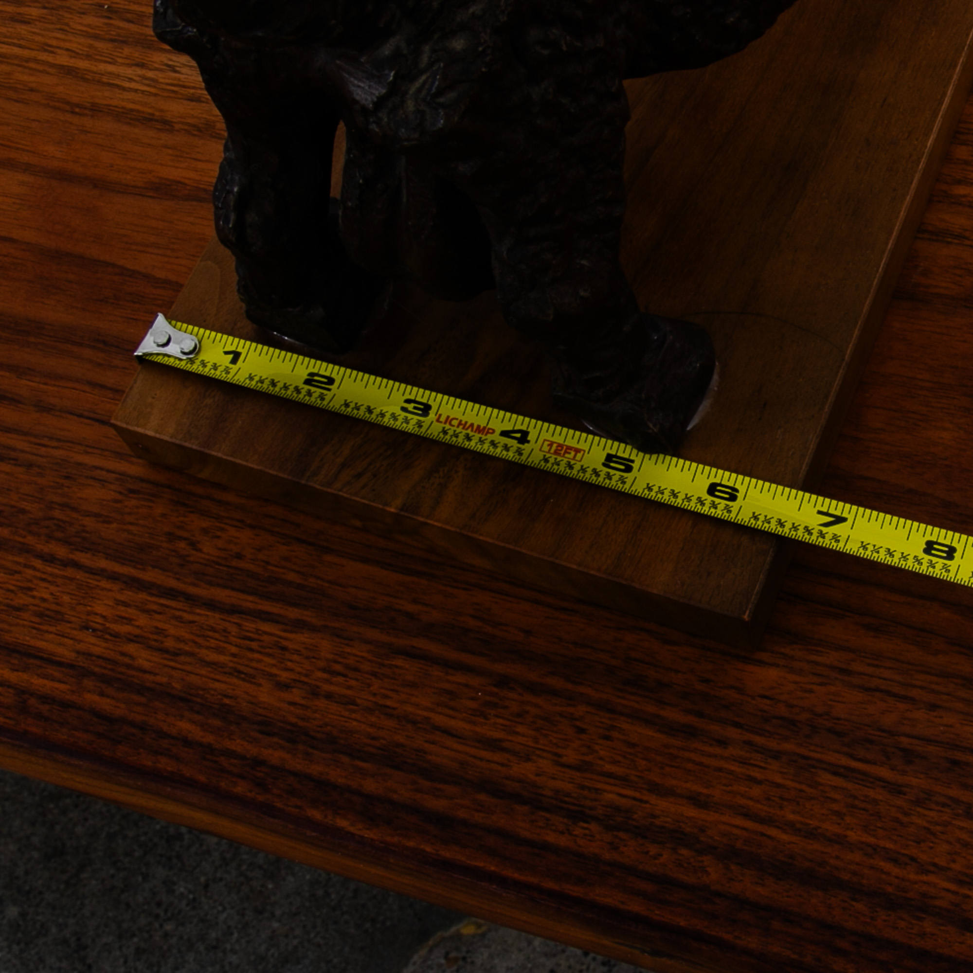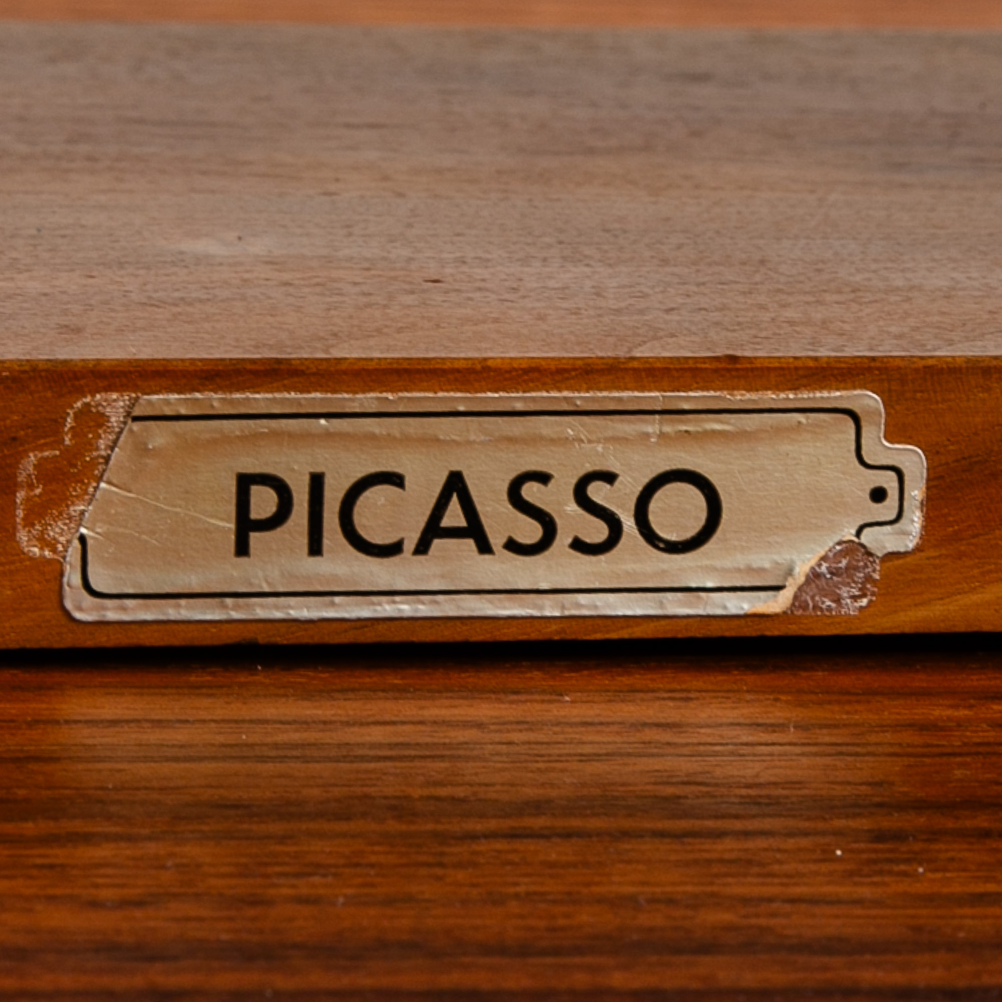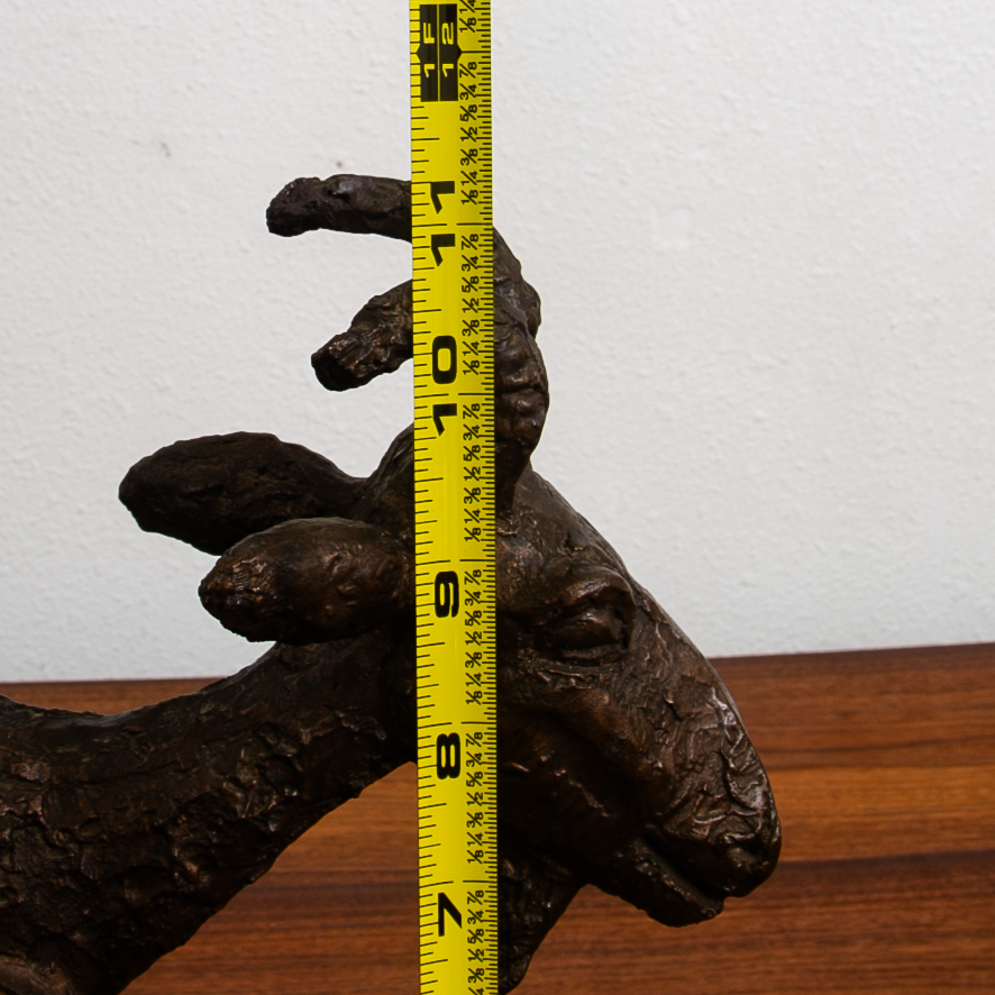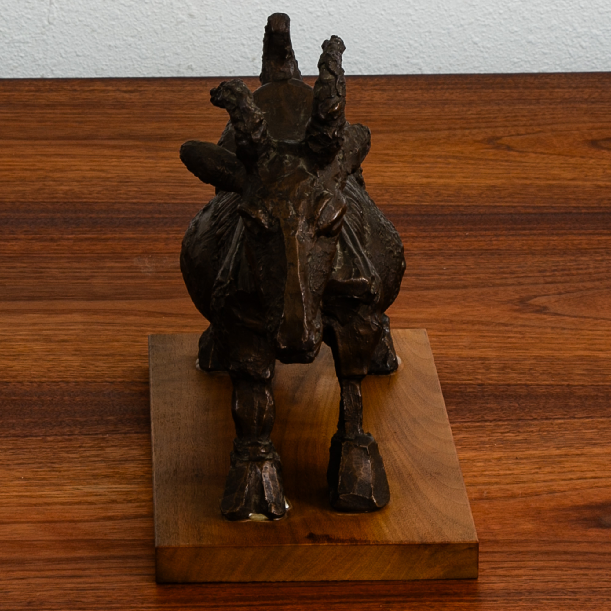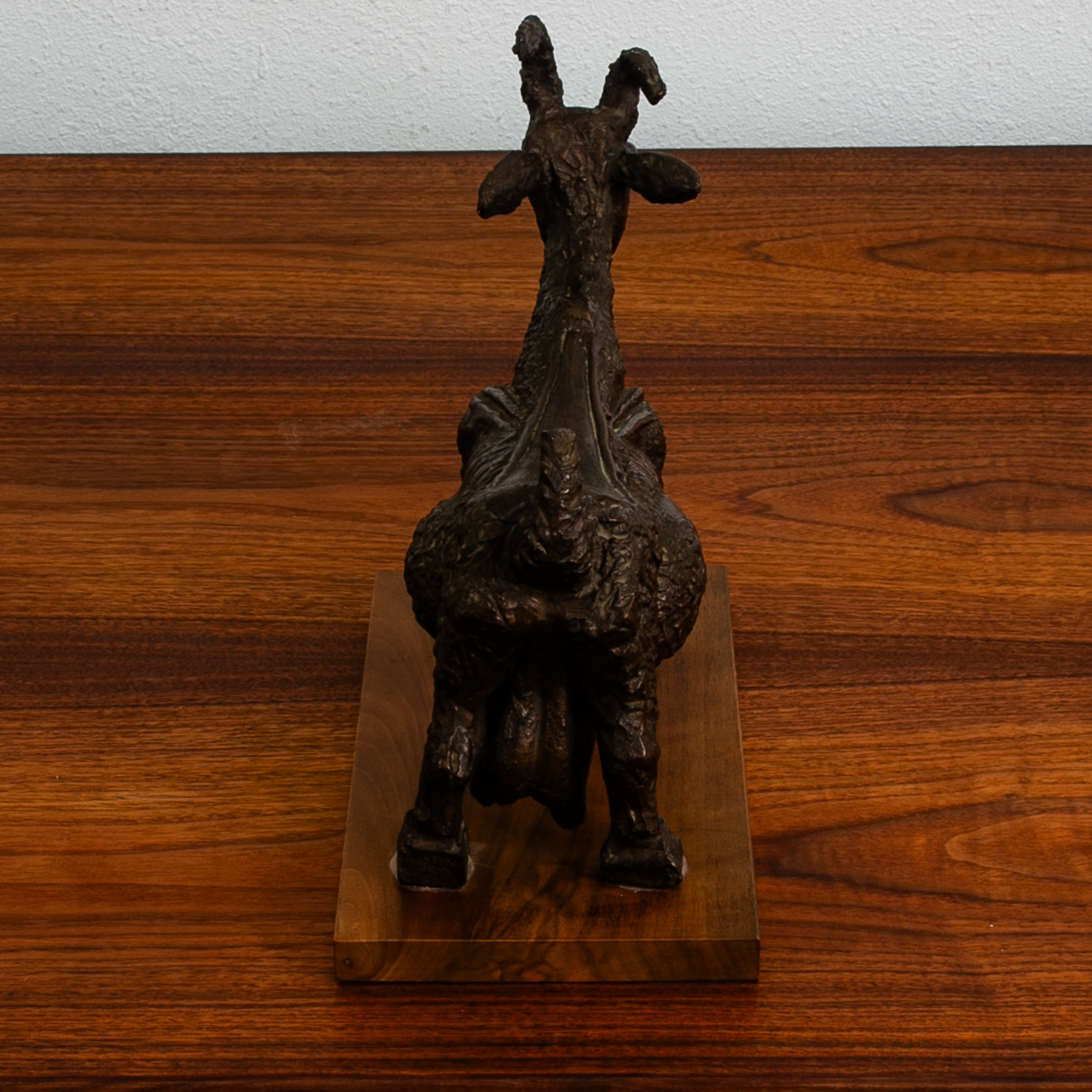 Mid Century Modern replica of Pablo Picasso's "She Goat" sculpture. The Goat is made from plaster with a metallic paint/coating to resemble the original piece. This statue has a solid Oak base with a label with damage displaying Picasso's Sir name.