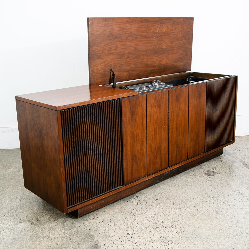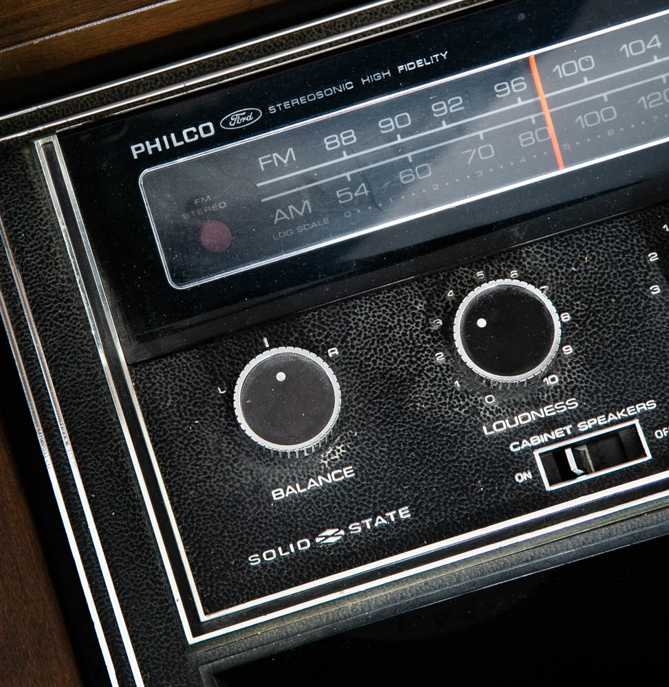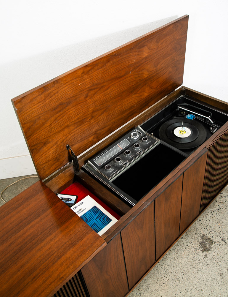 Beautiful Philco walnut stereo console that includes stereo FM tuner, 8 track player and record player. The unit is solid state and generally turns on and off but will likely need to be serviced to work properly and as intended. The unit opens on top on the right side. The center area offers LP or media storage. Please see all photos to ensure you know what you are buying. We include FREE SHIPPING in the listing price. Some exceptions apply, so please read the full shipping details below.