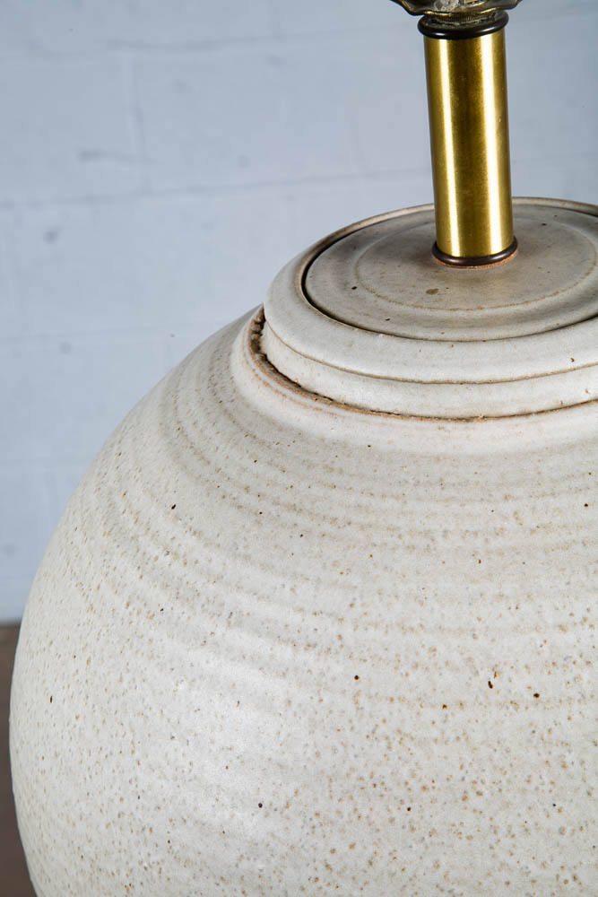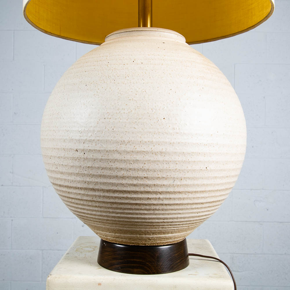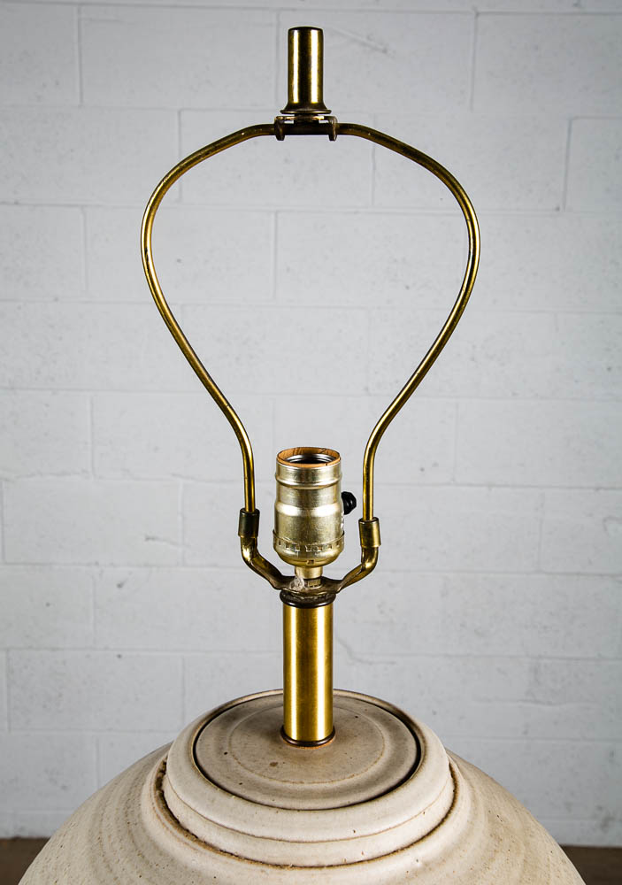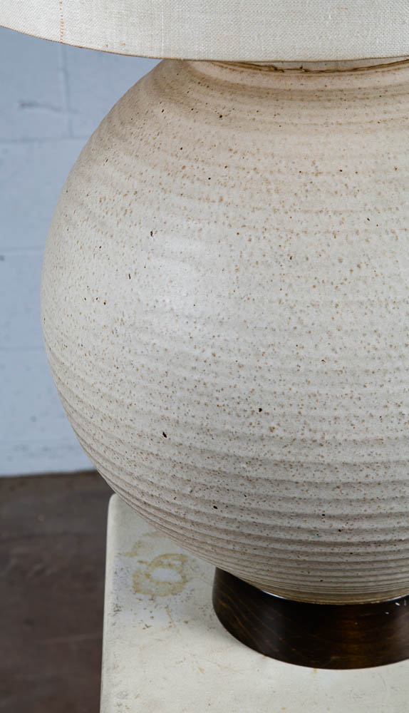 Ceramic lamp by Bob Kinzie. Ceramic portion is 13" diameter and sits on a solid wood base. Works as intended. Unsigned example. Please see all photos to ensure you know what you are buying. We include FREE SHIPPING in the listing price. Some exceptions apply, so please read the full shipping details below.
