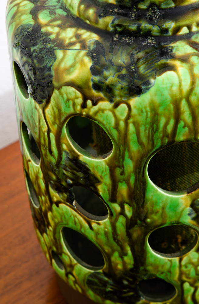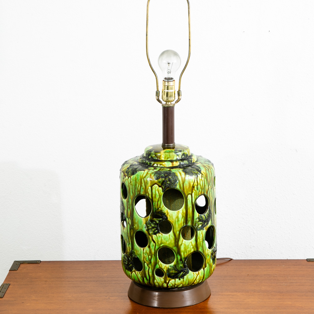 Lava drop glaze ceramic round table lamp. Unknown American maker. Stylish piece that plays well in nearly any space. Please see all photos to ensure you know what you are buying. We include FREE SHIPPING in the listing price. Some exceptions apply, so please read the full shipping details below.