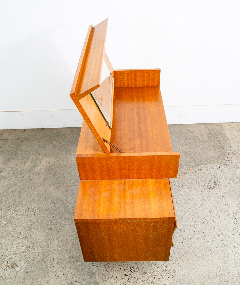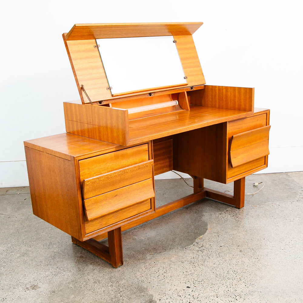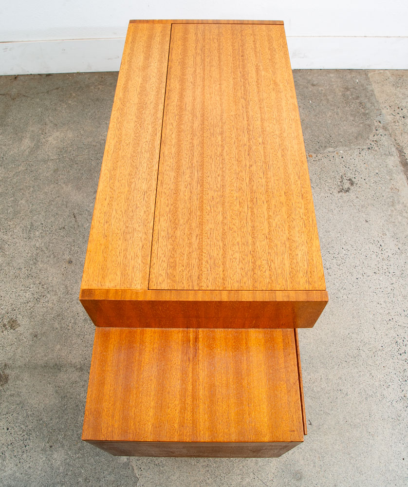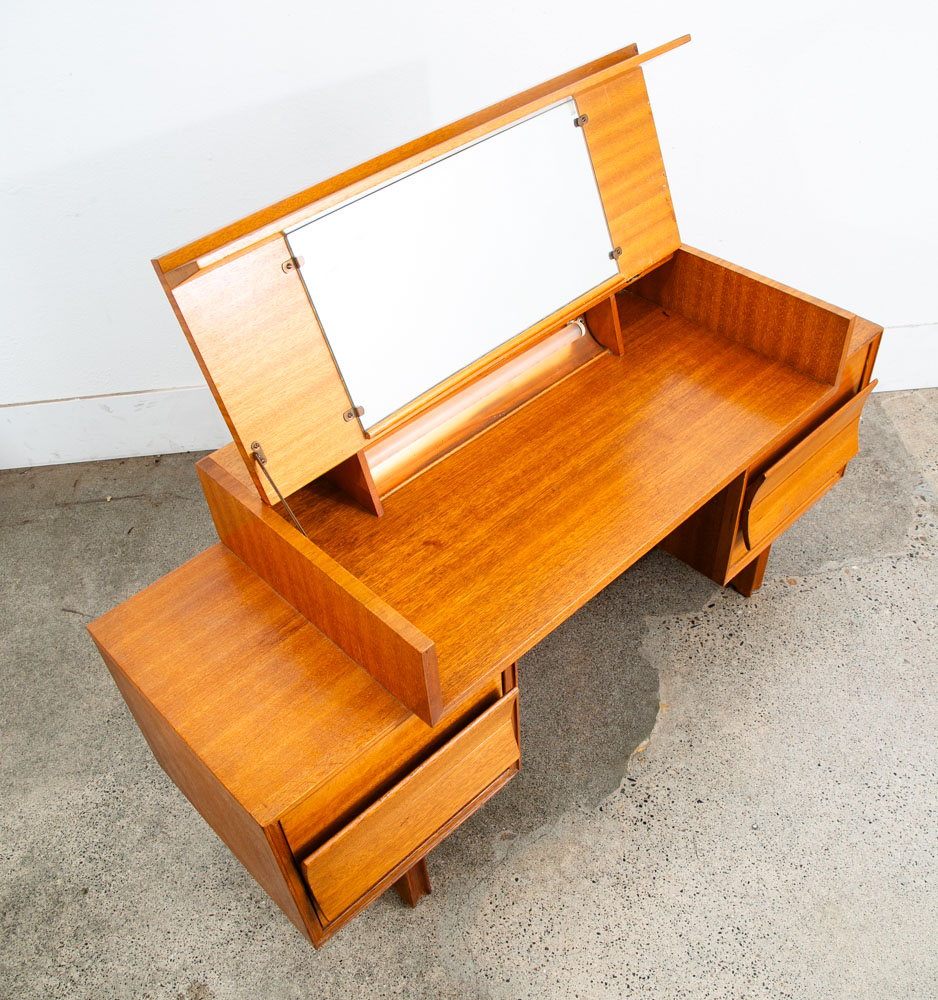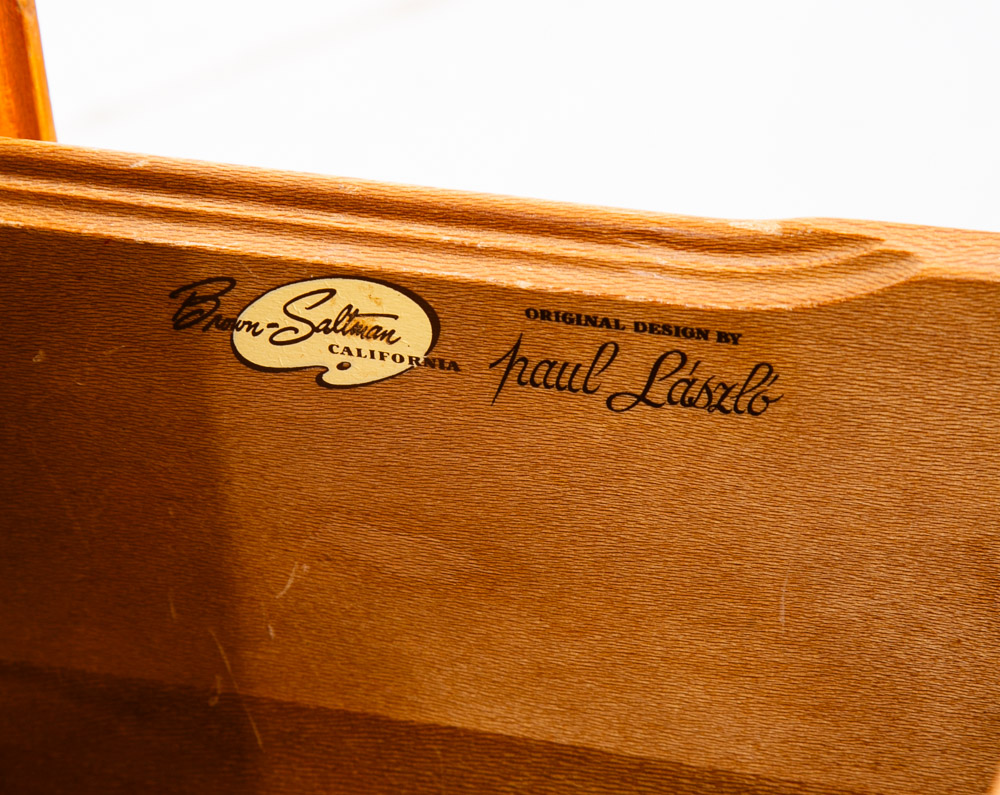Paul Laszlo for Brown Saltman Vanity table w/ mirror in bleached ribbon mahogany. This is a rare model doesn't come up for sale often. The top lifts to expose a mirror and surface. All 3 drawers offer a solid mahogany handle and dovetailed construction. Well made and timeless. Stamped within the piece and on the back. Please see all photos to ensure you know what you are buying. We include FREE SHIPPING in the listing price. Some exceptions apply, so please read the full shipping details below.