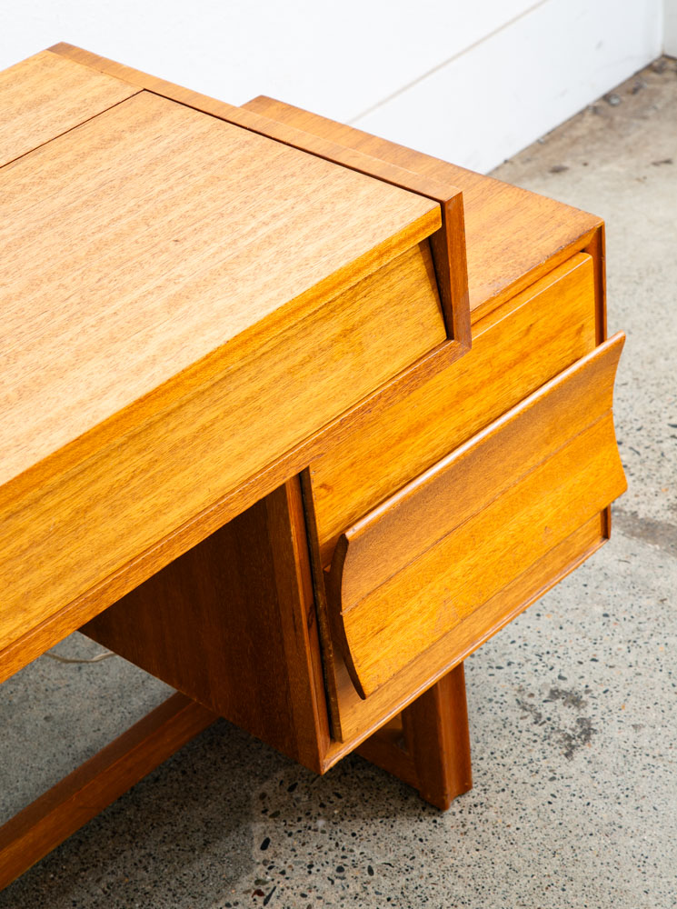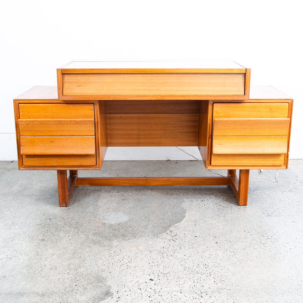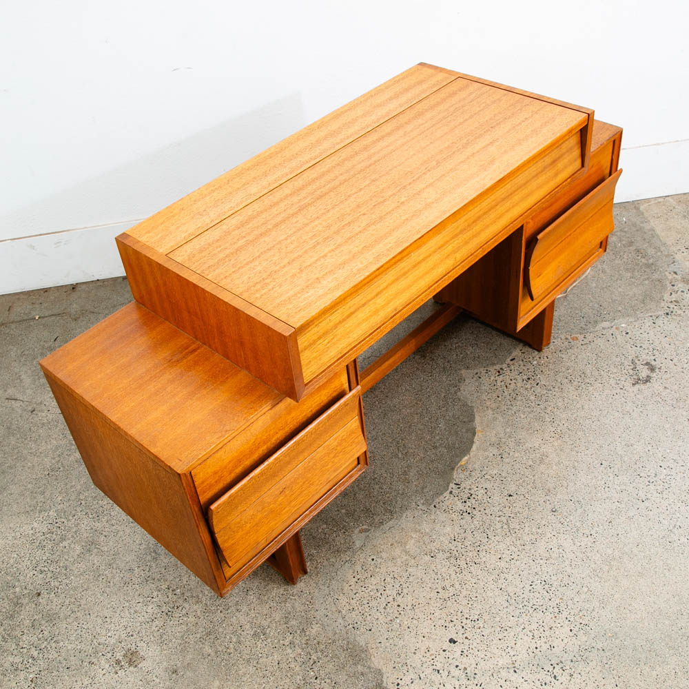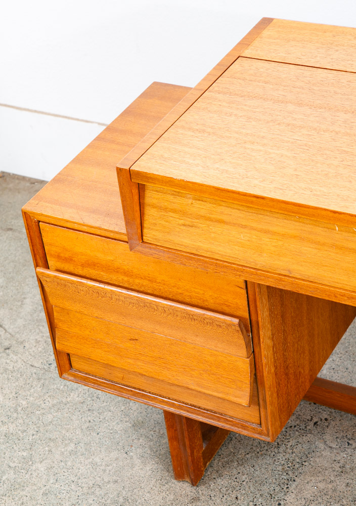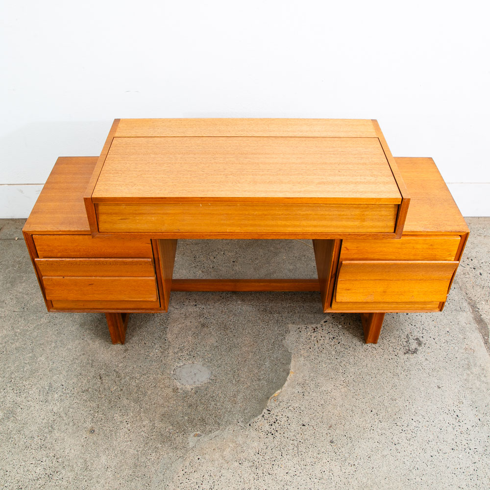 Paul Laszlo for Brown Saltman Vanity table w/ mirror in bleached ribbon mahogany. This is a rare model doesn't come up for sale often. The top lifts to expose a mirror and surface. All 3 drawers offer a solid mahogany handle and dovetailed construction. Well made and timeless. Stamped within the piece and on the back. Please see all photos to ensure you know what you are buying. We include FREE SHIPPING in the listing price. Some exceptions apply, so please read the full shipping details below.