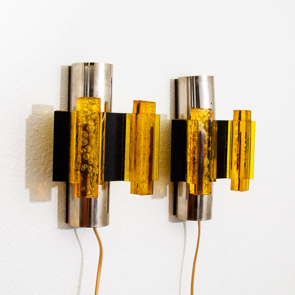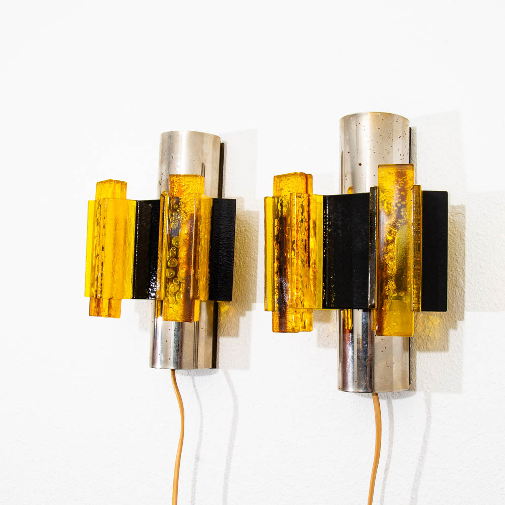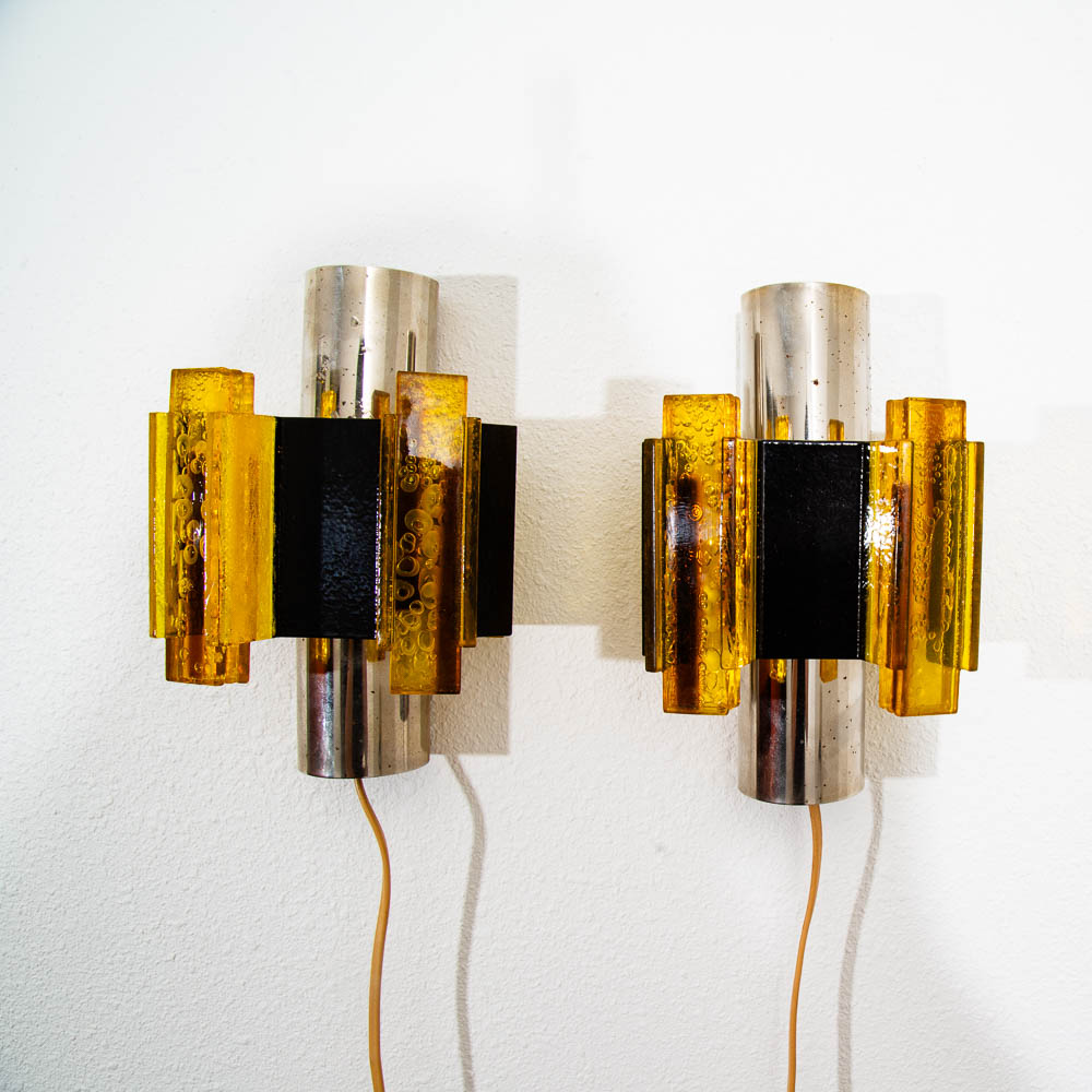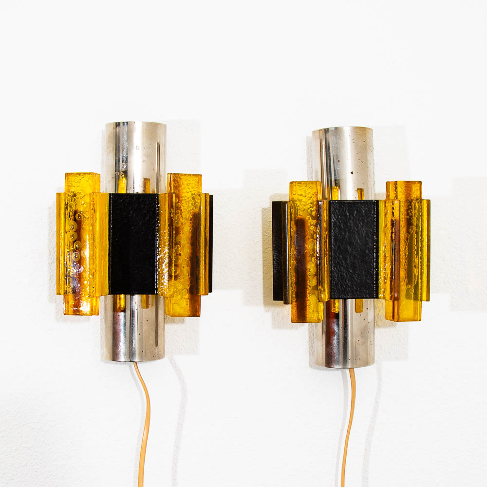 Wall hung lighting in chrome black and amber. Set of two wall sconces. ready to light your hallway or rooms. Feel free to contact me if you're interested in purchasing a shade.