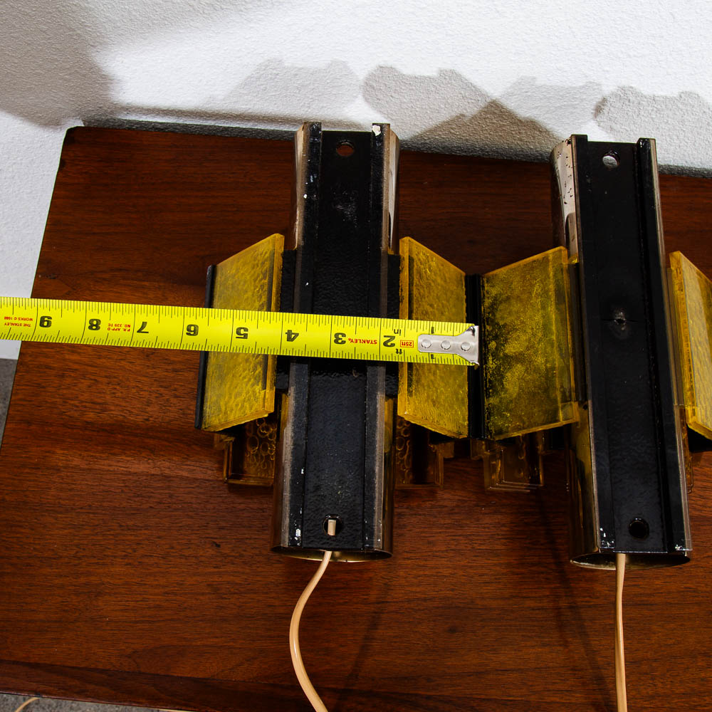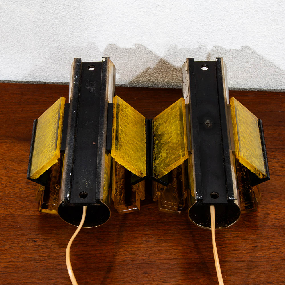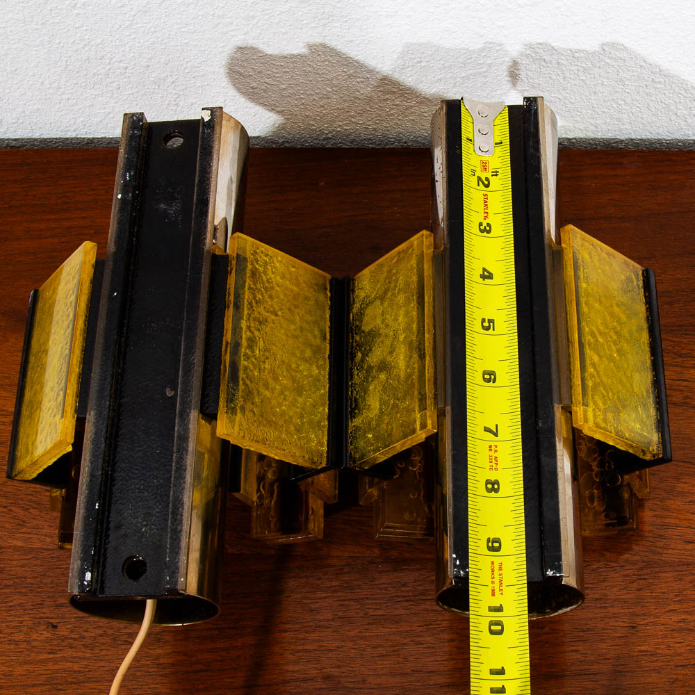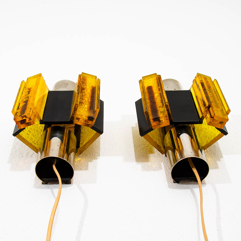 Wall hung lighting in chrome black and amber. Set of two wall sconces. ready to light your hallway or rooms. Feel free to contact me if you're interested in purchasing a shade.