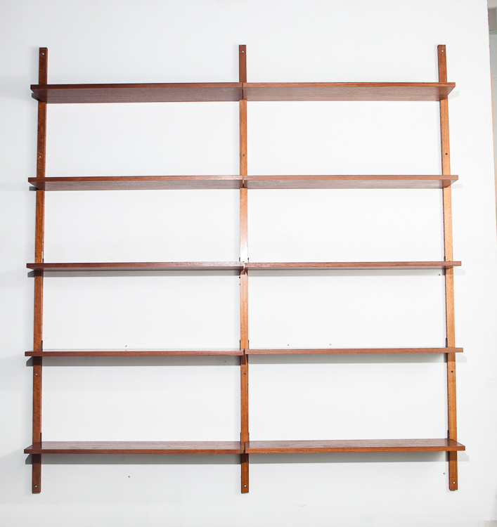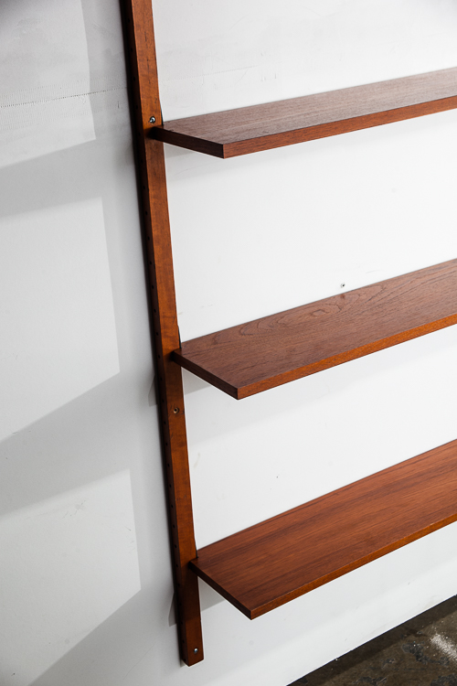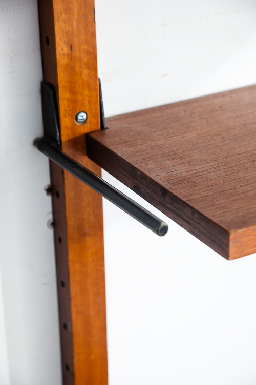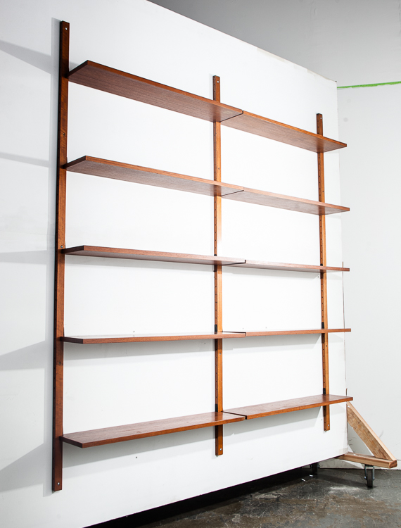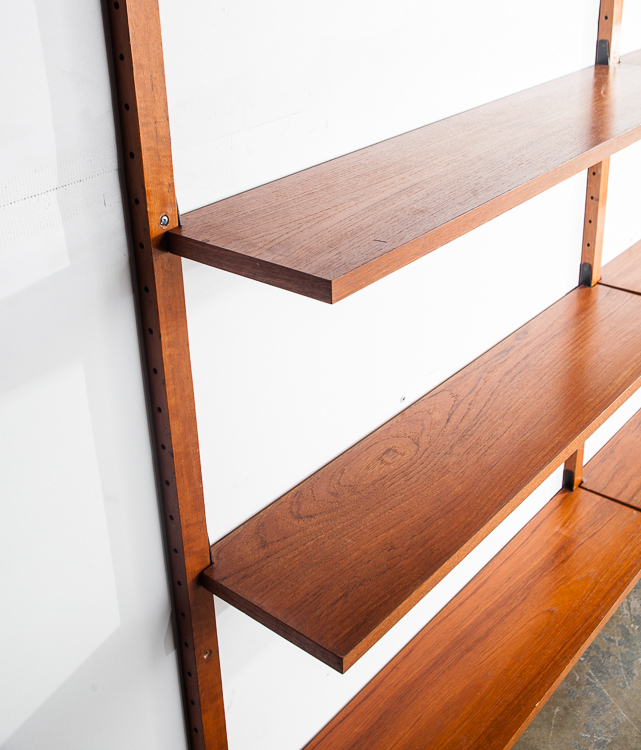 Beautiful and well constructed Teak Norwegian 3 bay modular wall unit. This piece comes with adjustable shelving throughout that sit on adjustable iron brackets that fit into slots on the side of each upright Unknown maker. Each shelf is stamped “Made in Norway”. The photos posted here shows only 2 bays installed but there is a 4th upright in order to create a 3rd bay. Rarely do we see these units in teak and made in such high quality. These units are great as multi functional pieces for small apartments or to fill a large wall. Plays well with mid century modern and danish modern pieces. Please see all photos to ensure you know what you are buying. We include FREE SHIPPING in the listing price. Some exceptions apply, so please read the full shipping details below. Items included in purchase: 14 Teak shelved Metal hardware 5 uprights: 3 regular size, 2 smaller versions