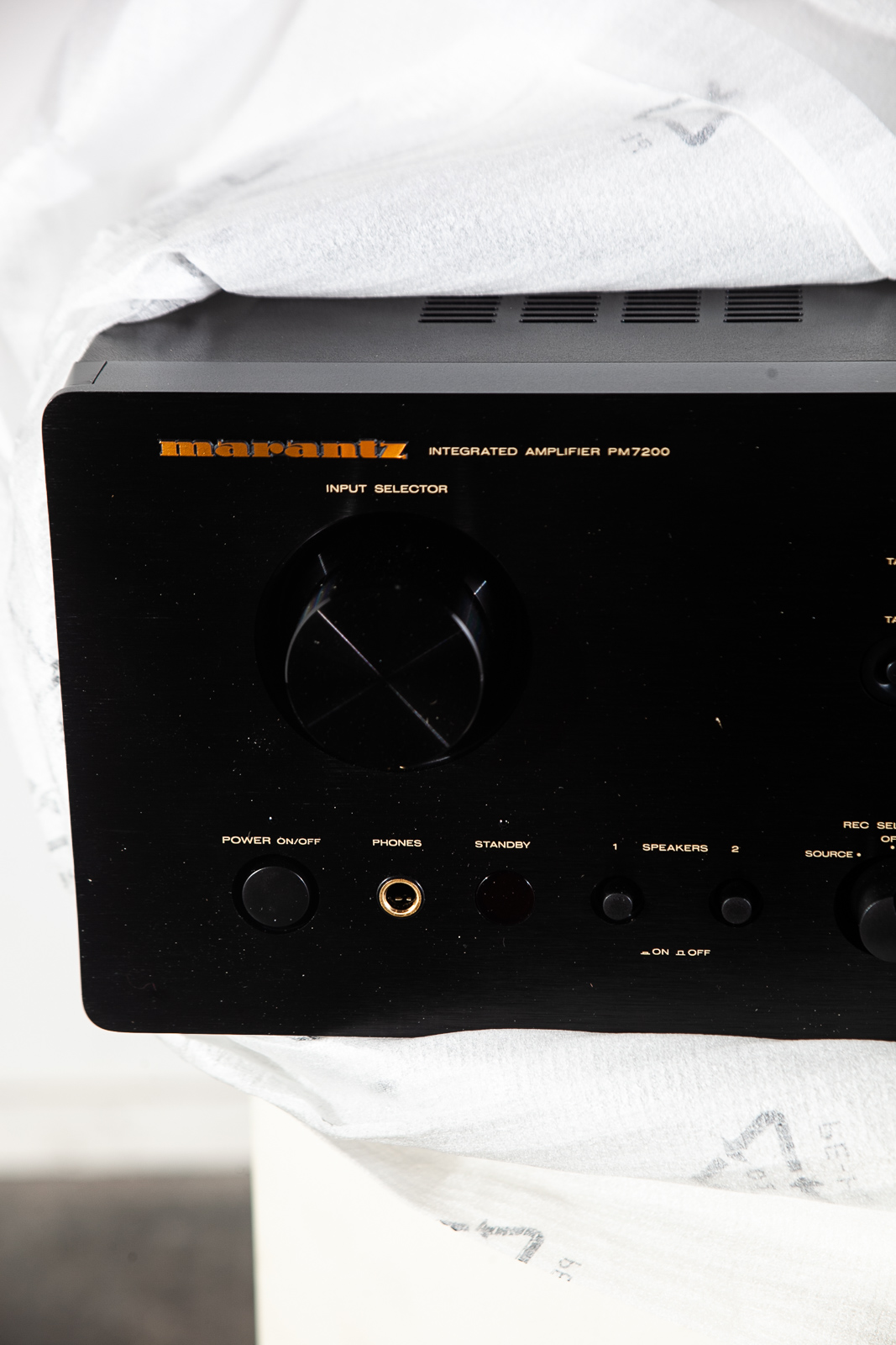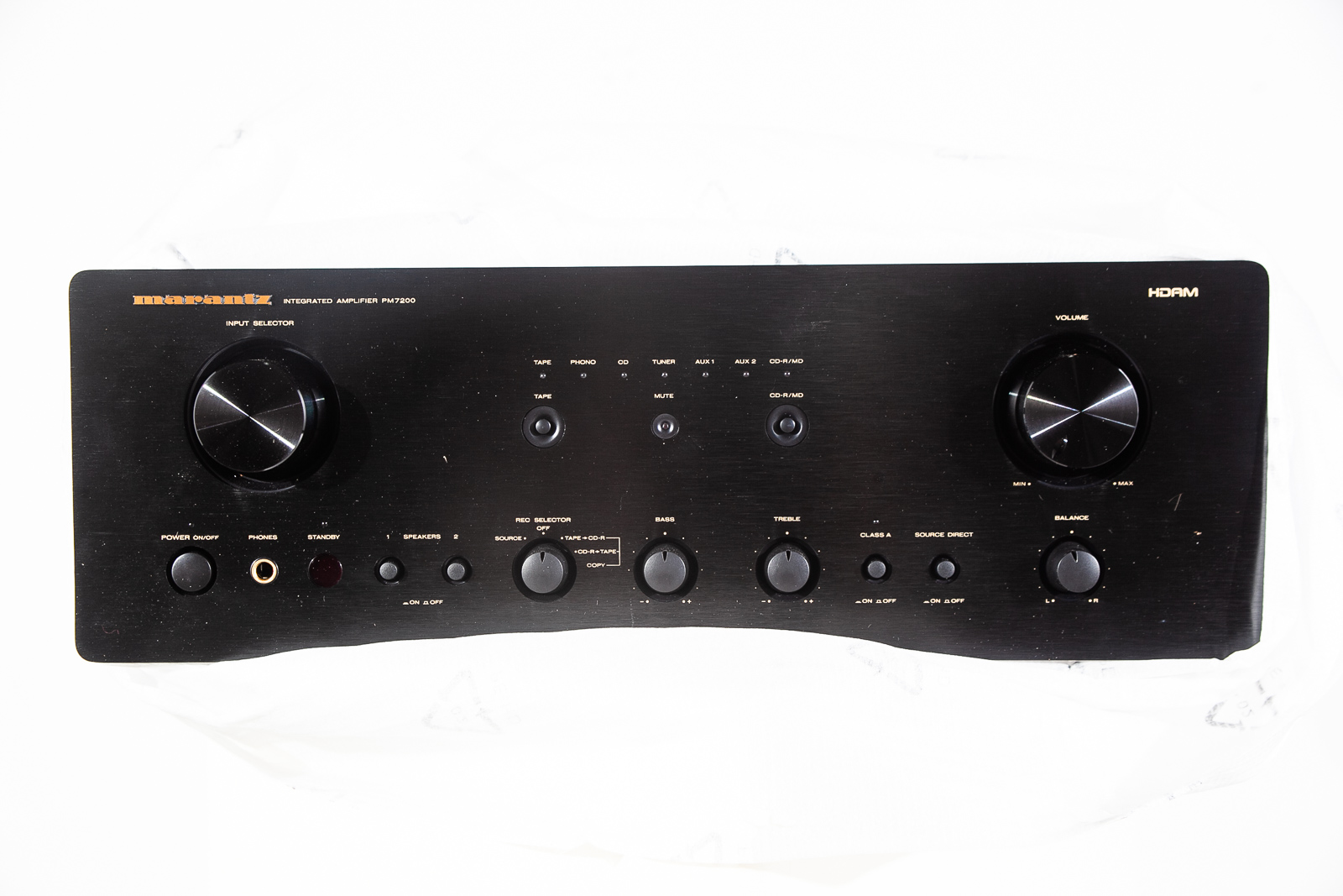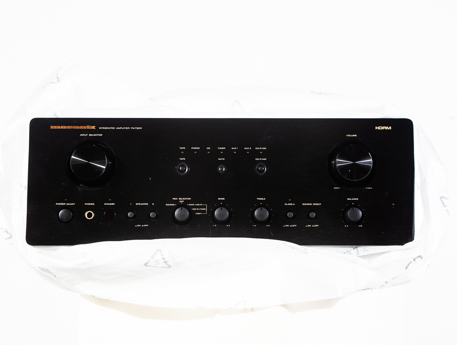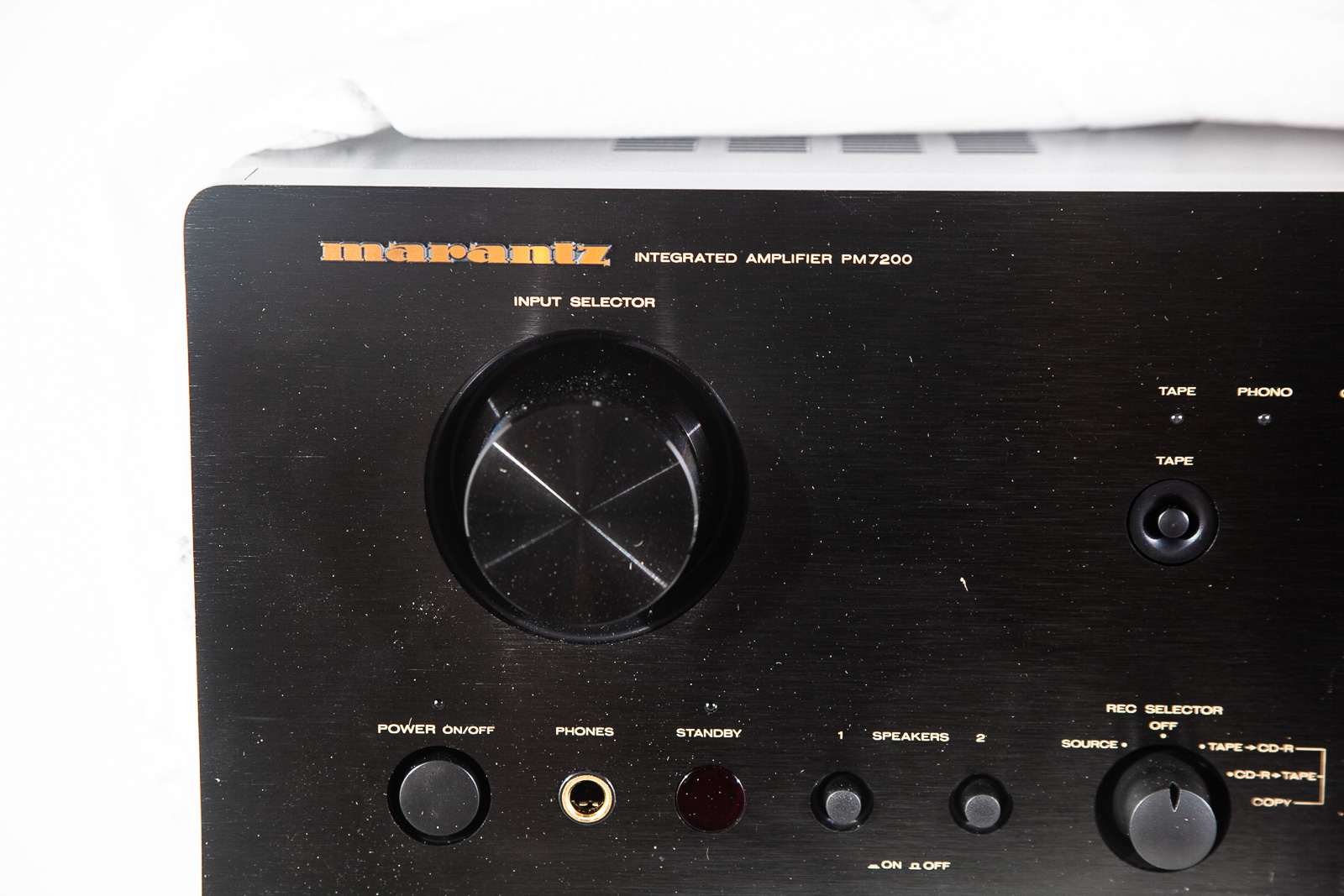 The Marantz PM7200 Stereo Integrated Amplifier offers music enthusiasts with audiophile sound quality and superior flexibility of operation. It delivers 2 x 95 W RMS power at 8 ohms and 155 W RMS power with 4 ohm speakers. This amplifier offers class A operation for distortion-free sound at low volume levels. A single push-pull amplifier, symmetrical circuitry with independent heat sink, anti-resonant, metal front panel and hand selected customized components including HDAM, assuring an extremely dynamic sound reproduction with accurate tonal and image balance. It offers Class A operation for distortion-free sound at low volume levels and gold-plated in- and output terminals. With full system remote control operation, the PM7200 is the ideal center piece for a true high-end music system.Please see all photos to ensure you know what you are buying. We include FREE SHIPPING in the listing price. Some exceptions apply, so please read the full shipping details below.